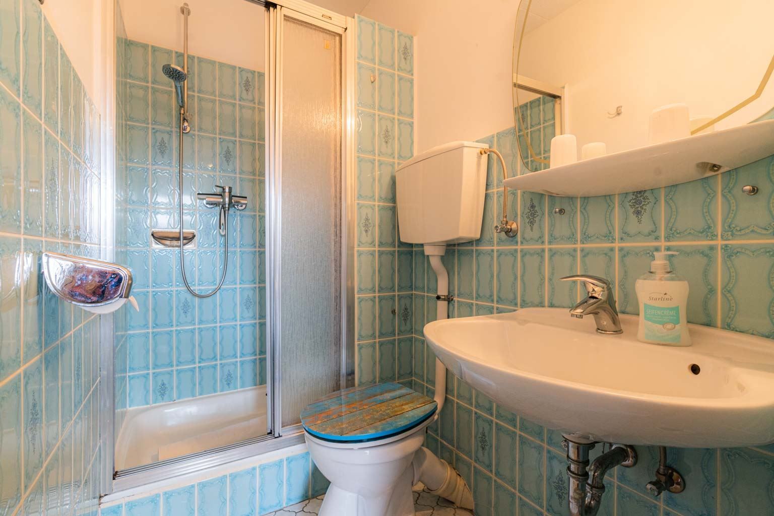 1. Badezimmer (Duschbad) mit Dusche, WC und elektrischer Lüftung.
