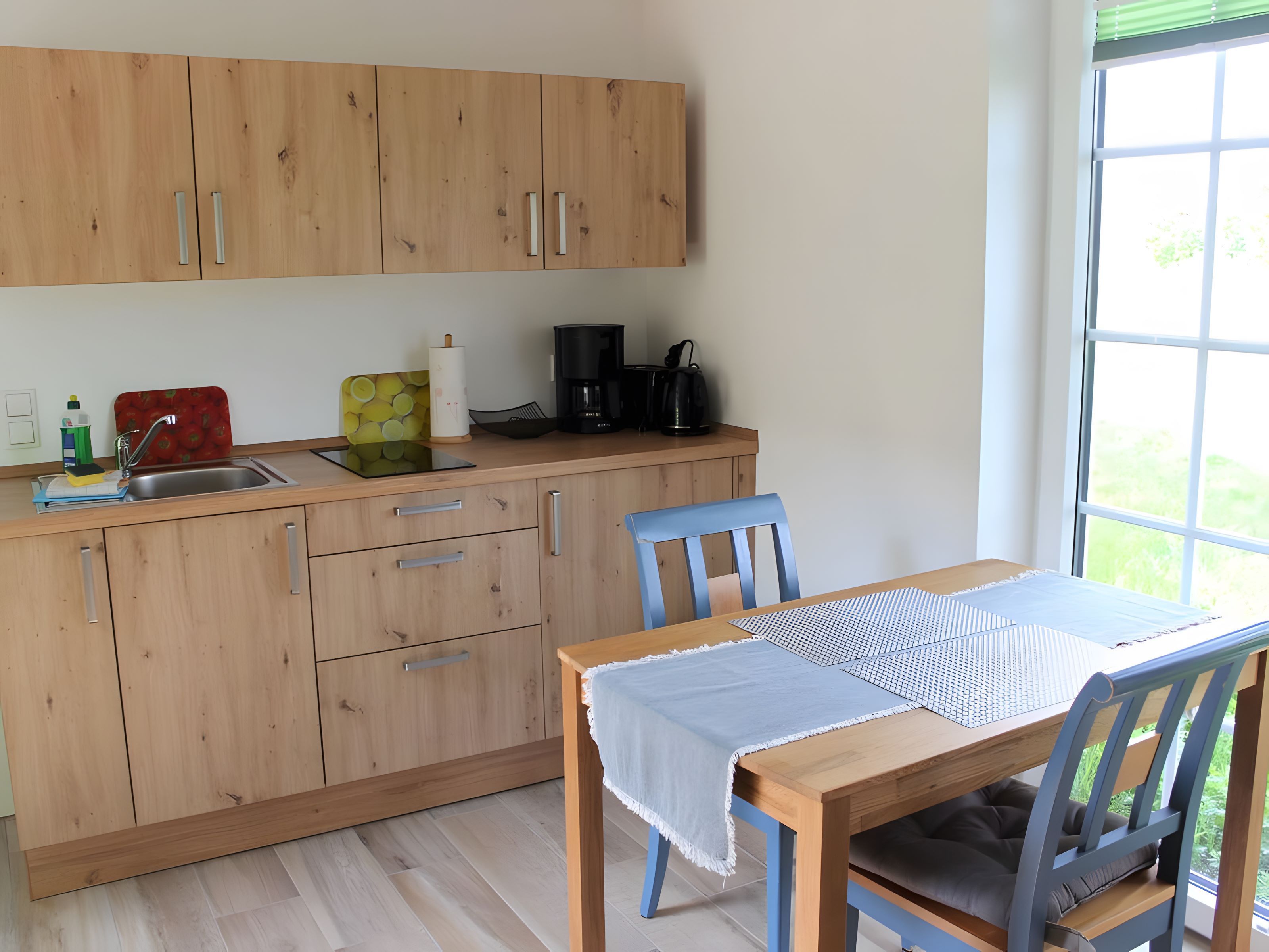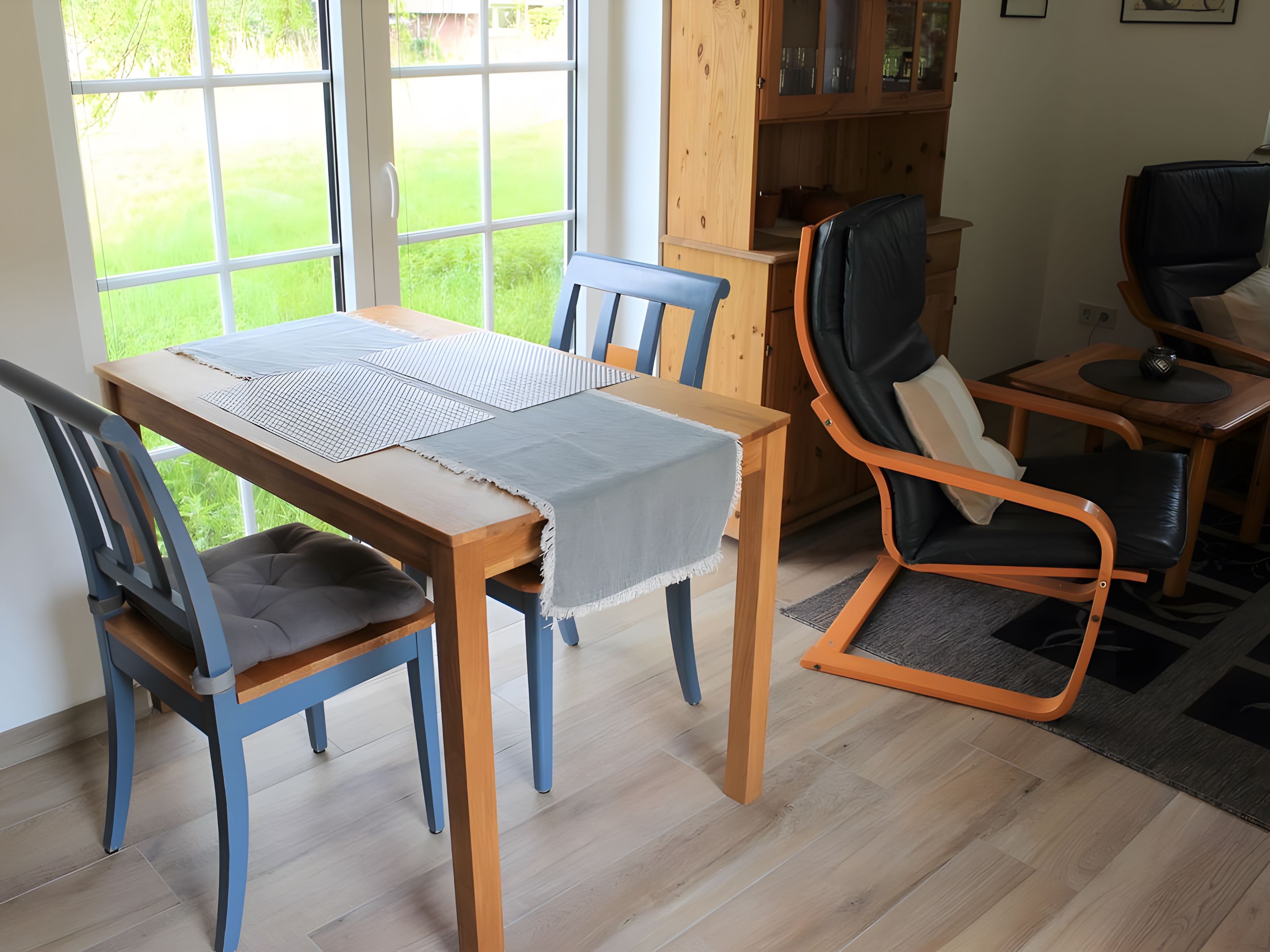 Das kombinierte Wohn-/Esszimmer verfügt über eine gemütlich Sitzecke mit 2 Fernsehsesseln, Flat(Sat)-TV und Radio sowie einen kleinen Esstisch für 2 Personen. Die kleine Küche ist mit Ceranfeld, Backofen, Mikrowelle, Kühlschrank, Wasserkocher, Eierkocher und Toaster ausgestattet (keine Spülmaschine!).