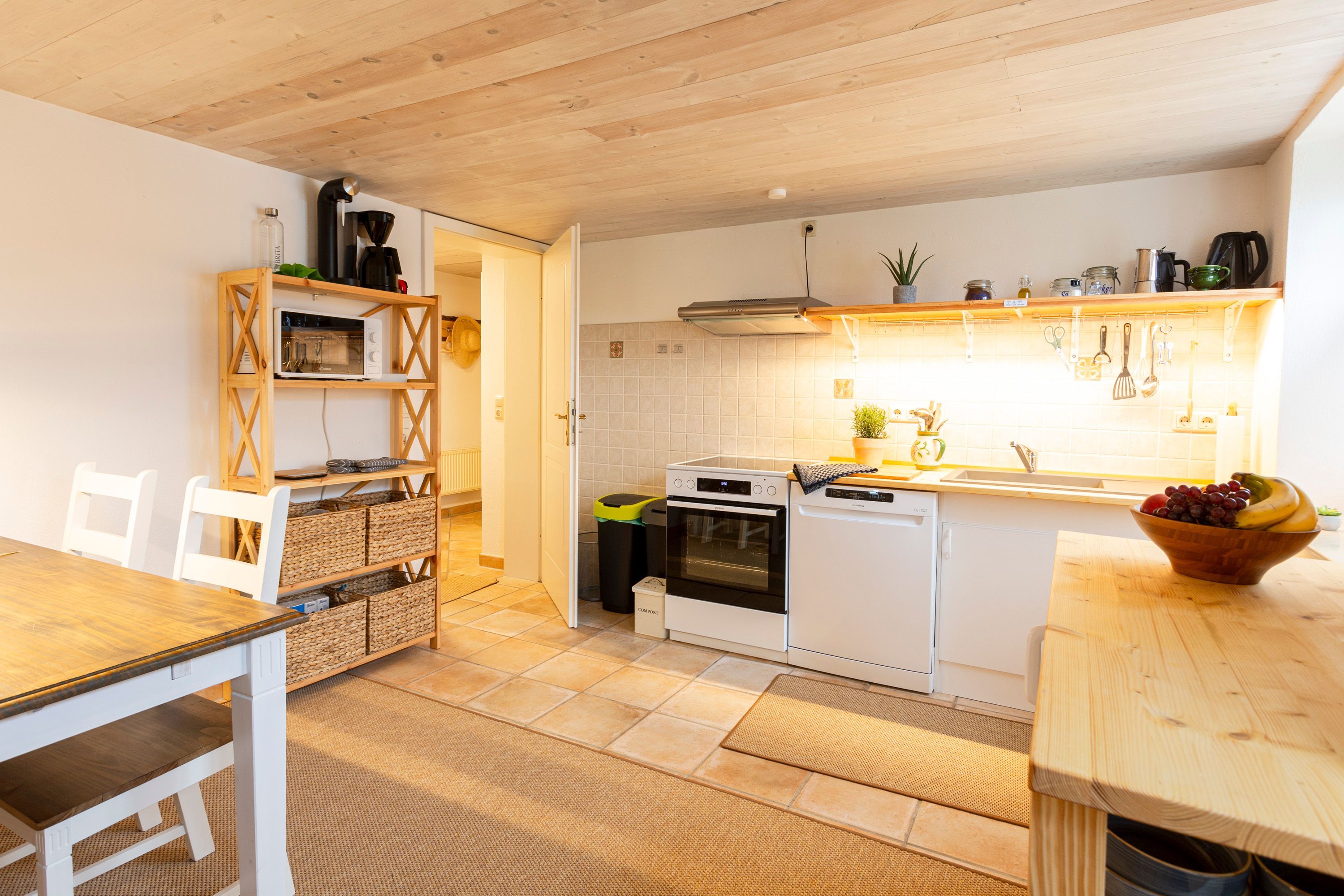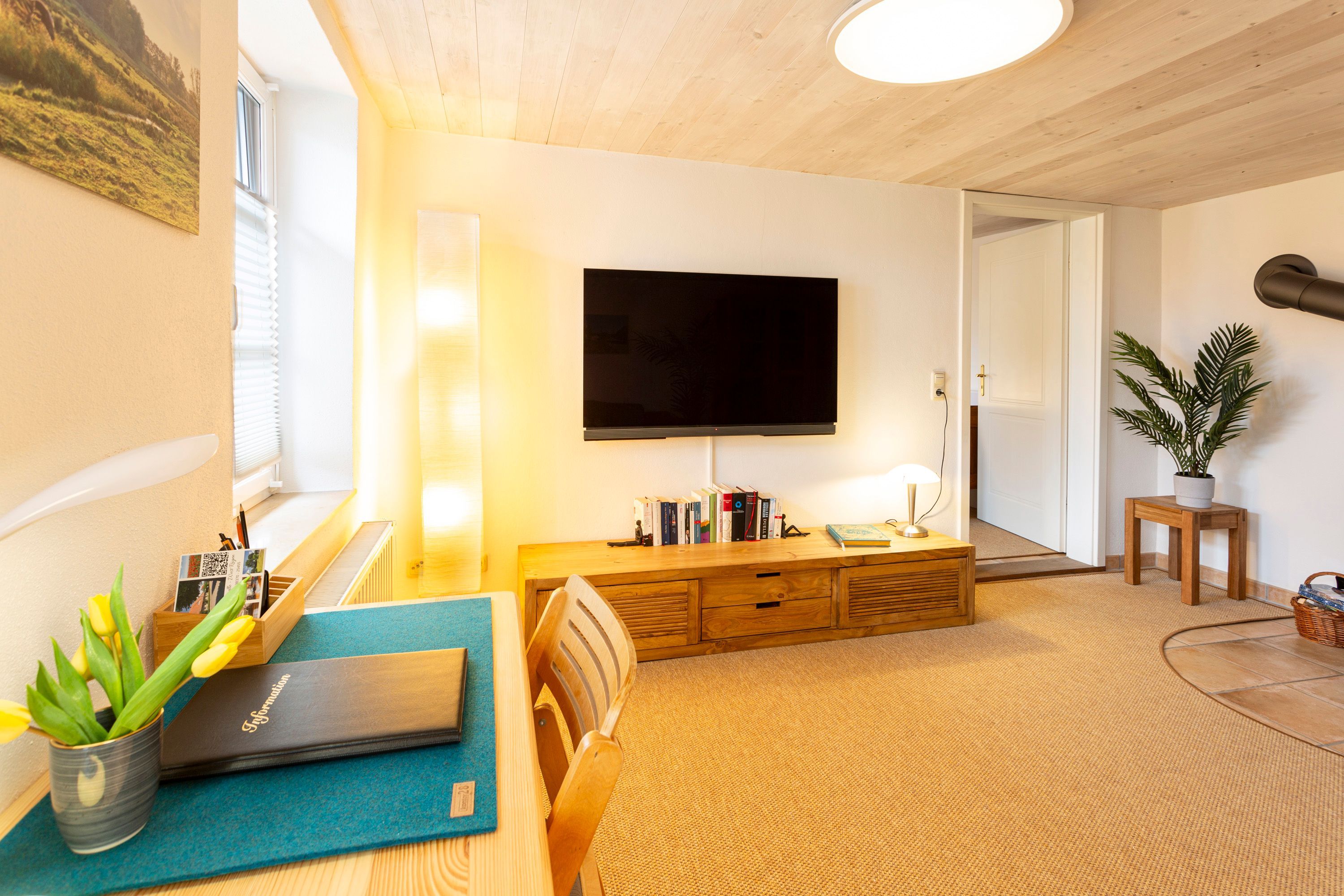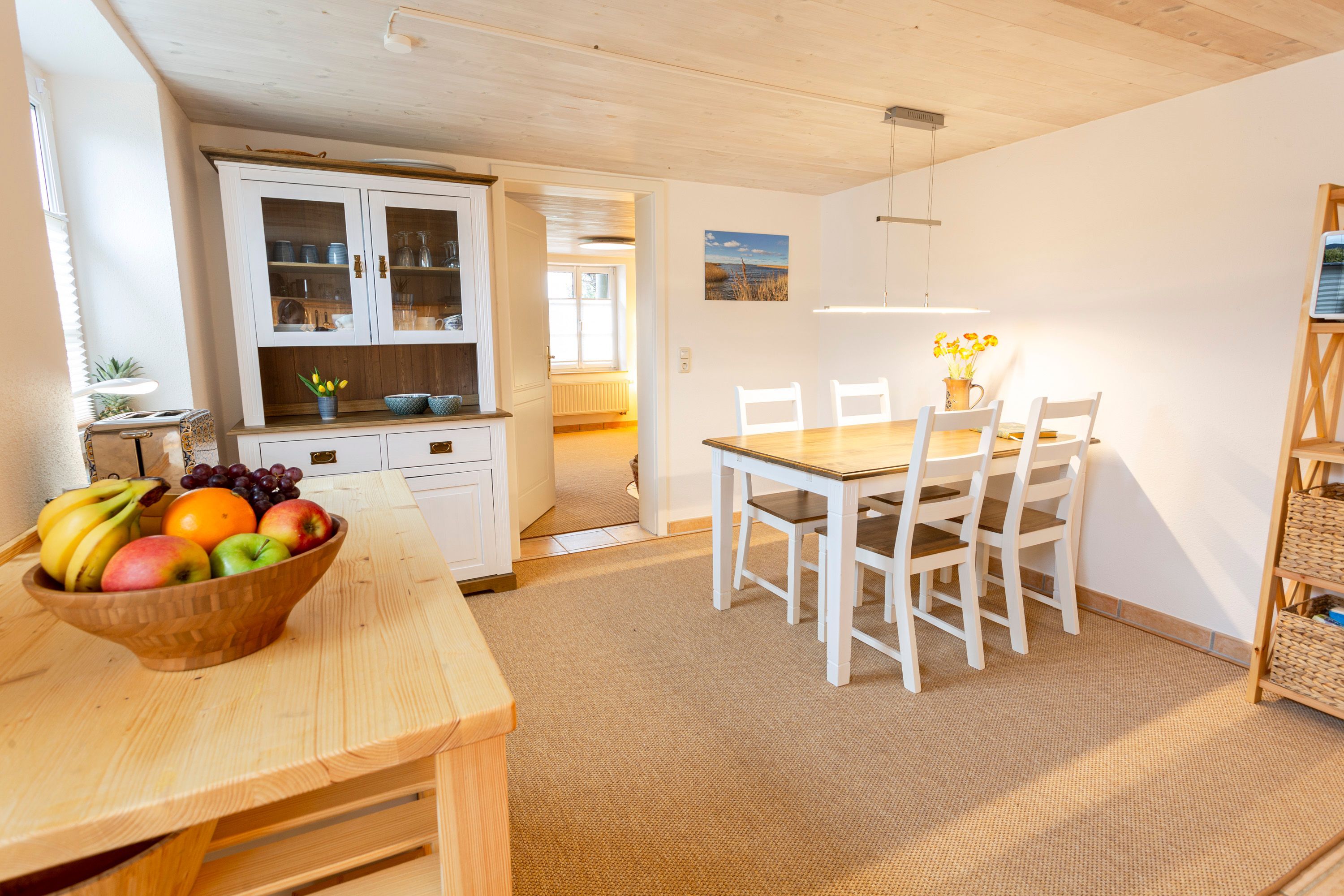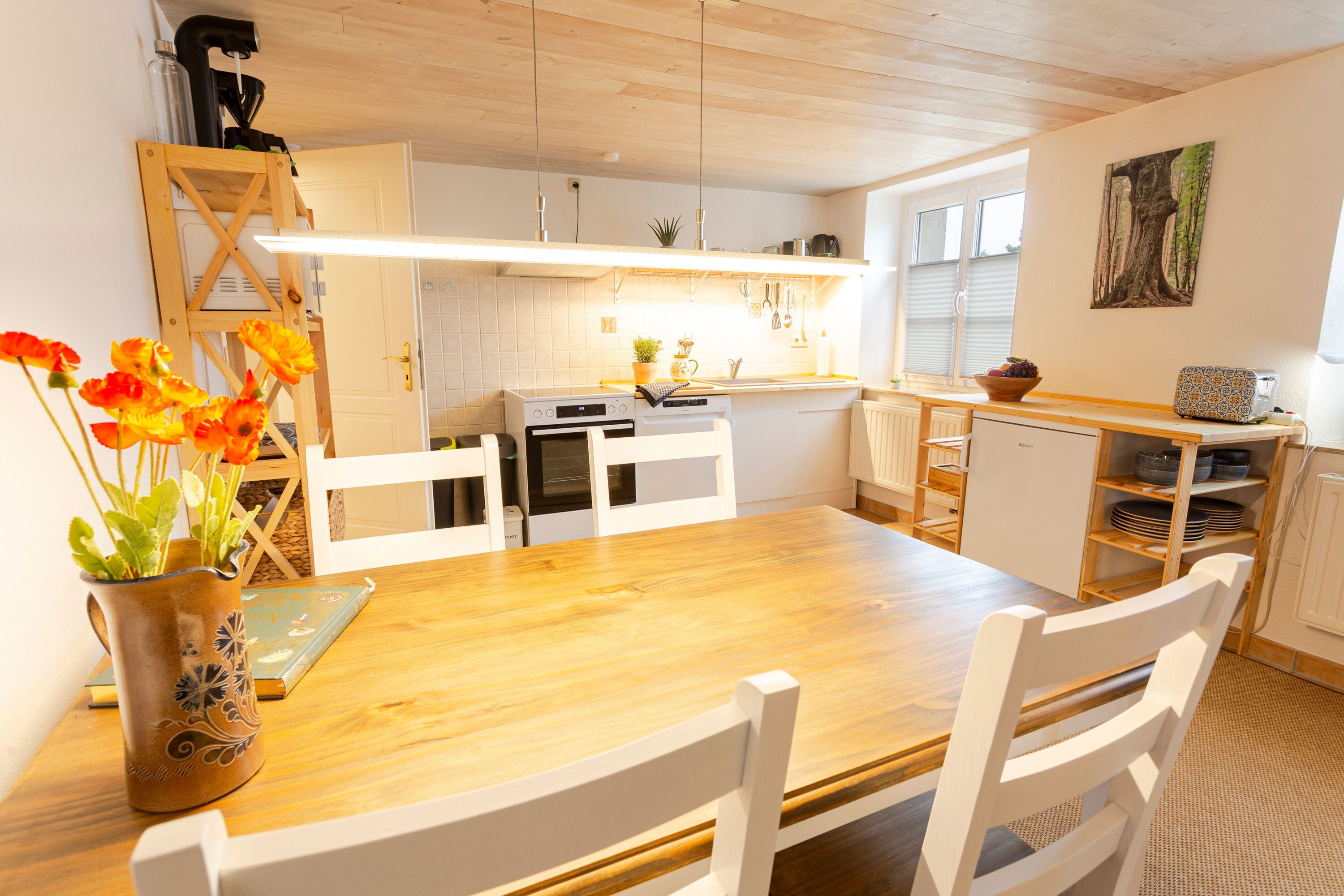 Die Ferienwohnung 3 im Haus Klein Kapelle befindet sich im Erdgeschoss des Hauses und bietet auf 57 m² genügend Platz für bis zu 4 Personen und einem Baby. Das Wohnzimmer verfügt neben einem Schlafsofa (150x210) und einem großen TV über einen modernen Kamin, der angenehme Wärme an kalten Abenden spendet. Das Schlafzimmer schließt sich an das Wohnzimmer und bietet ein Doppelbett (160x200) und ein Einzelbett (70x175) für erholsame Nächte. Die geräumige Küche lädt zum Kochen und gemeinsamen Genießen ein. Im Zentrum steht der große Esstisch und rund herum befindet sich die voll ausgestattete Küche im Landhausstil. Kochen sie ganz wie zu Hause, dafür stehen ihnen Herd, Backofen, Kühlschrank, Geschirrspüler und Mikrowelle zur Verfügung. Die kleinen Küchenhelfer des Alltags, wie Kaffeemaschine, Toaster, Wasserkocher und Milchaufschäumer befinden sich ebenfalls in der Küche. Das Bad ist mit einer Badewanne, WC, Waschbecken und einer Waschmaschine ausgestattet.