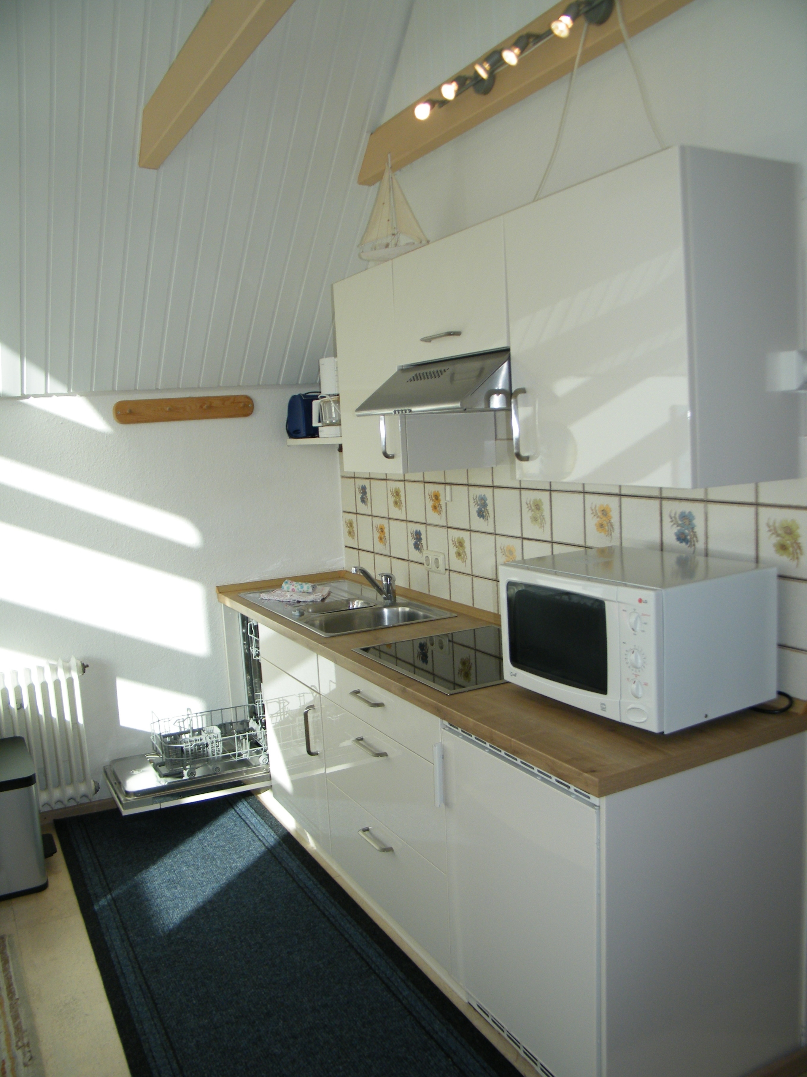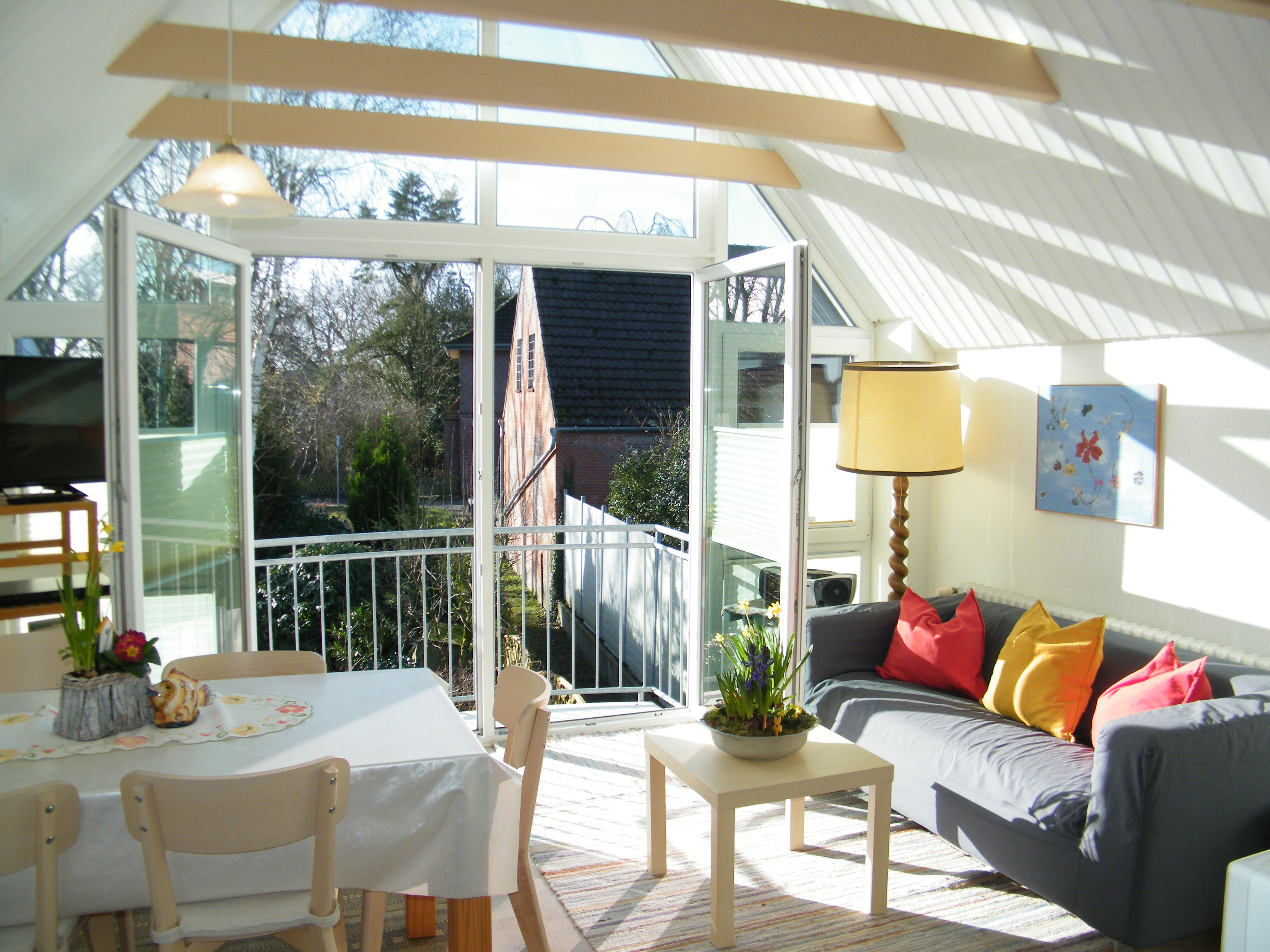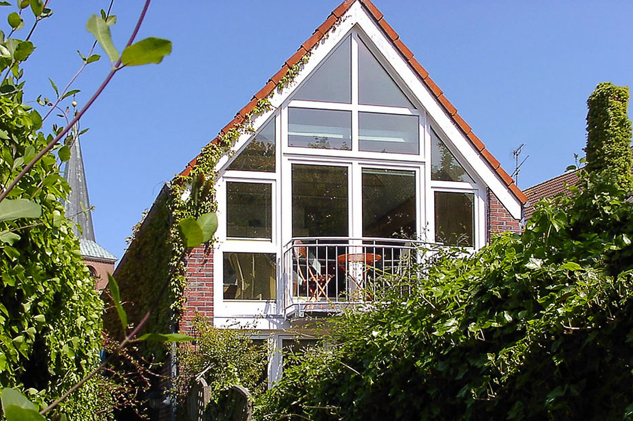 • einer großen Wohnküche mit großer Fensterfront und kleinem Balkon in Richtung Garten.