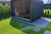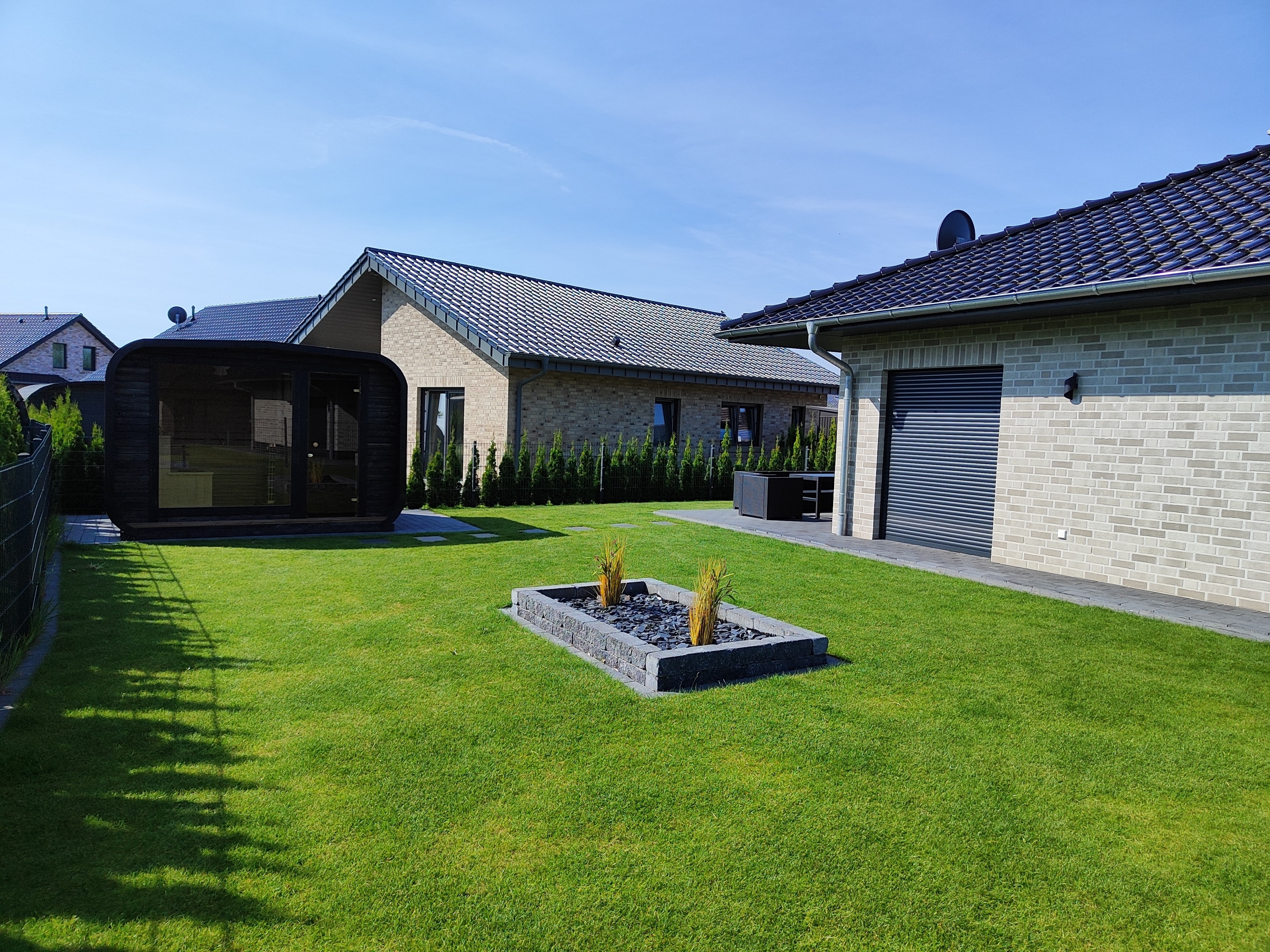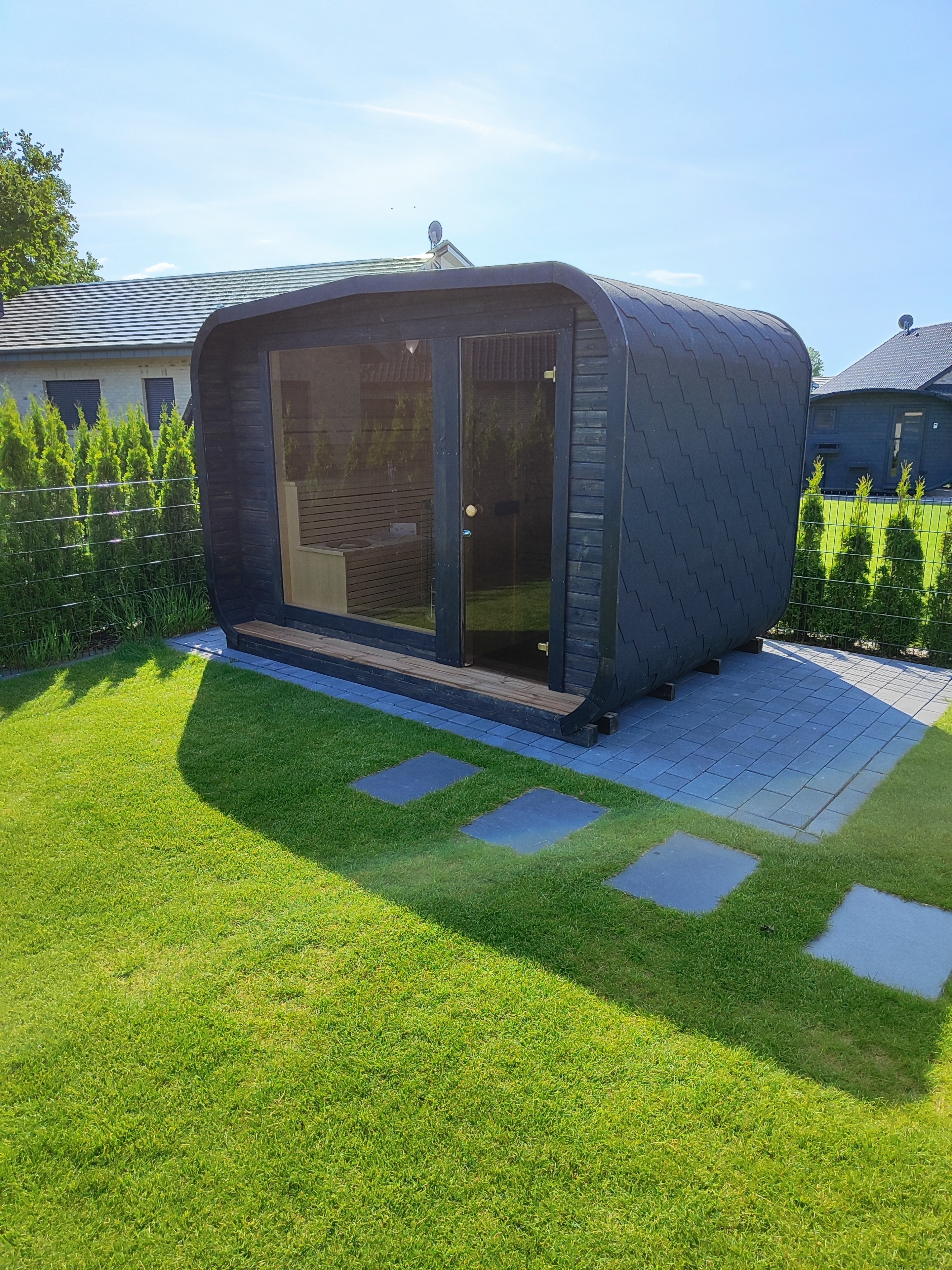 Panorama Gartensauna mit Vorraum und Platz für 6 Personen.9 KW Harvia Elektro Ofen. Die Sauna wird gesondert abgerechnet.