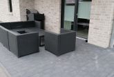 Terrasse mit Gartenmöbel und Holzkohle Grill, auch für Schaschlikspieße geeignet.