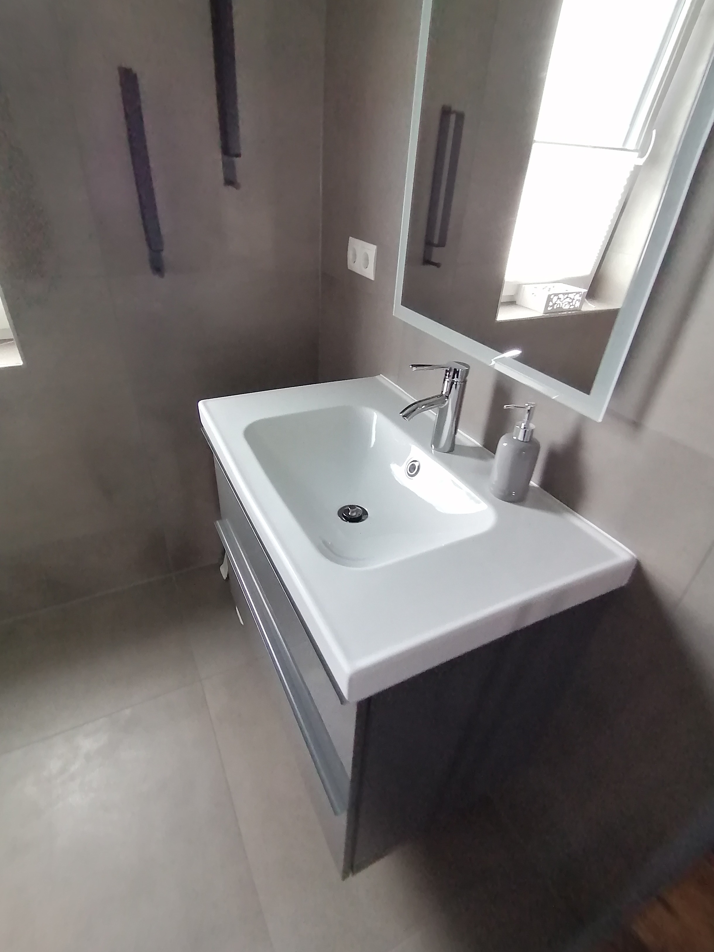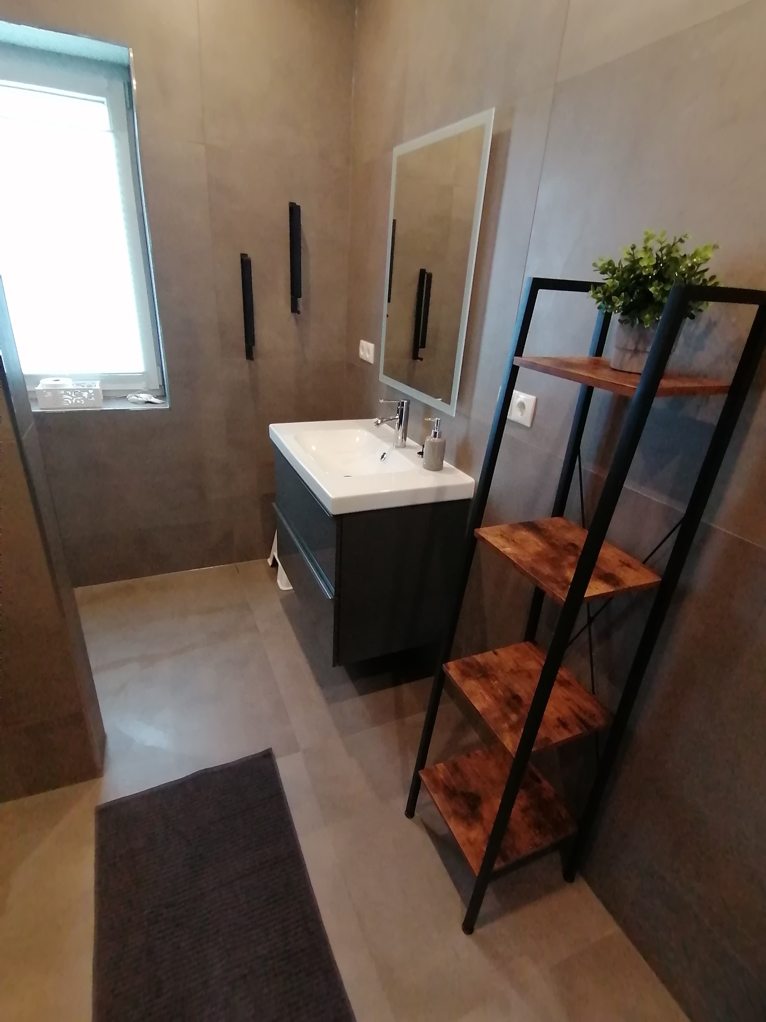 Im Bad befindet sich eine 1m Breite ebenerdige Dusche, die auch für körperlich eingeschränkte Personen gut zugänglich ist.