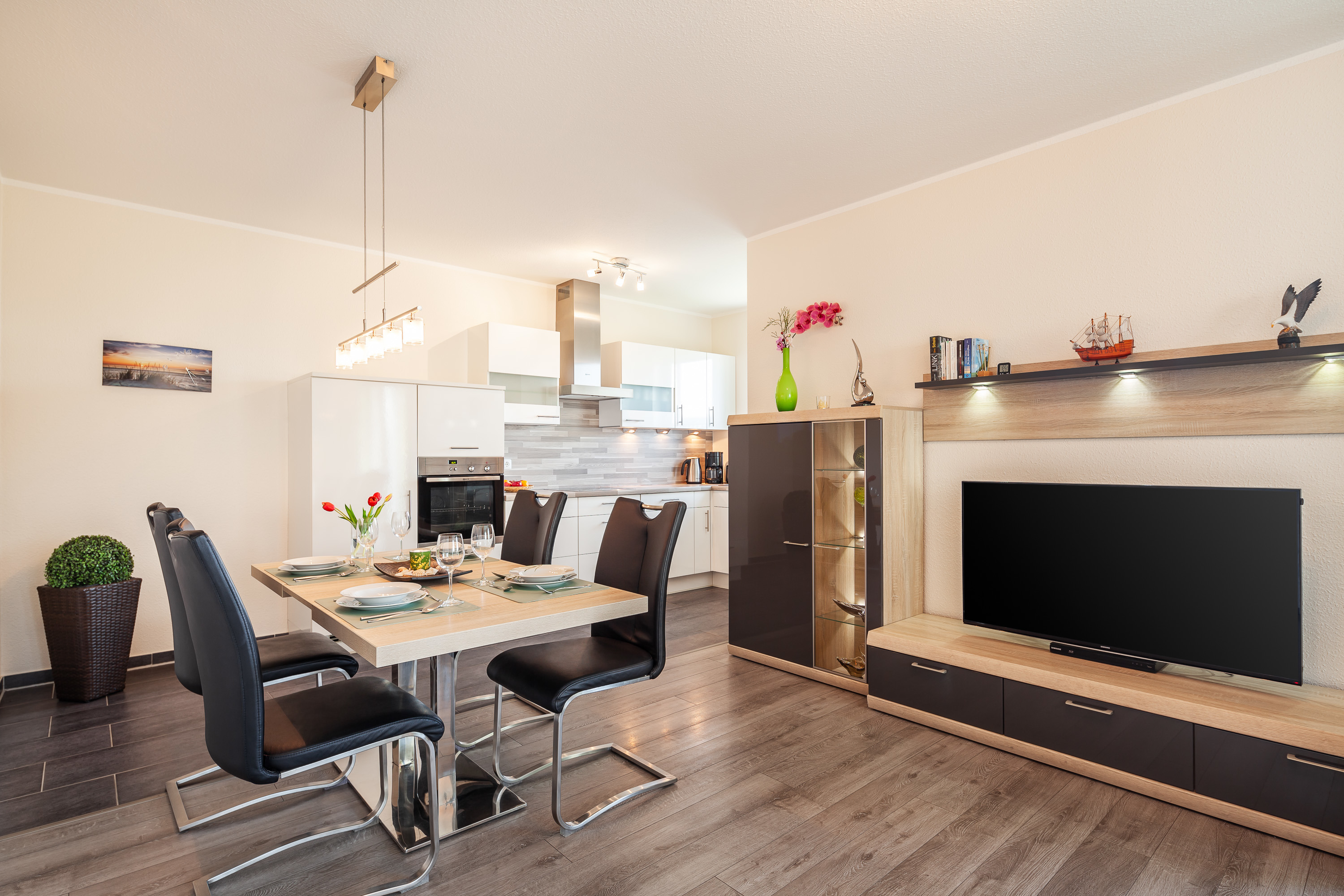 Die Fewo 'Bounty' , 71qm, mit einer großen Terrasse liegt im Erdgeschoss und verfügt über 2 Schlafzimmer. Die offene Küche in weiß/Lack mit hellgrauer Arbeitsfläche, ist mit allem Komfort wie Geschirrspüler, Kühlschrank mit Gefrierfach, Mikrowelle, Cerankochfeld, erhöhter Backofen, Granitspüle, Kaffeemaschine usw. ausgestattet. Der Esstisch aus grauer Eiche mit den bequemen Schwingstühlen bietet Platz für 4 Personen. Der gemütliche Wohnraum mit Kamin ist mit einer dunkelgrauen Leder-Komfortsitzecke und einem behaglichen Fernsehsessel ausgestattet. Ein 50 Zoll-Smart TV, Blu-Ray-Player, sowie Spiele, Bücher und Umgebungskarten sind vorhanden. Das schöne Badezimmer mit Tageslichtfenster ist in schwarz/weiß gehalten, mit einem rotem großen Waschtisch mit Glaswaschbecken, 1m x 1m Dusche und Badewanne, Fußbodenheizung und Radio ausgestattet. Der geräumige Flur und ein separater Abstellraum bieten viel Platz. Ein Schlafzimmer hat ein Doppelbett (180 x 200 cm) und einen weiteren 41 Zoll-Smart TV. Im anderen Schlafzimmer befinden sich 2 Einzelbetten mit einer Liegefläche von 90 x 200 cm. An allen Türen und Fenstern befinden sich elektrische Rolläden.