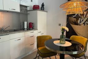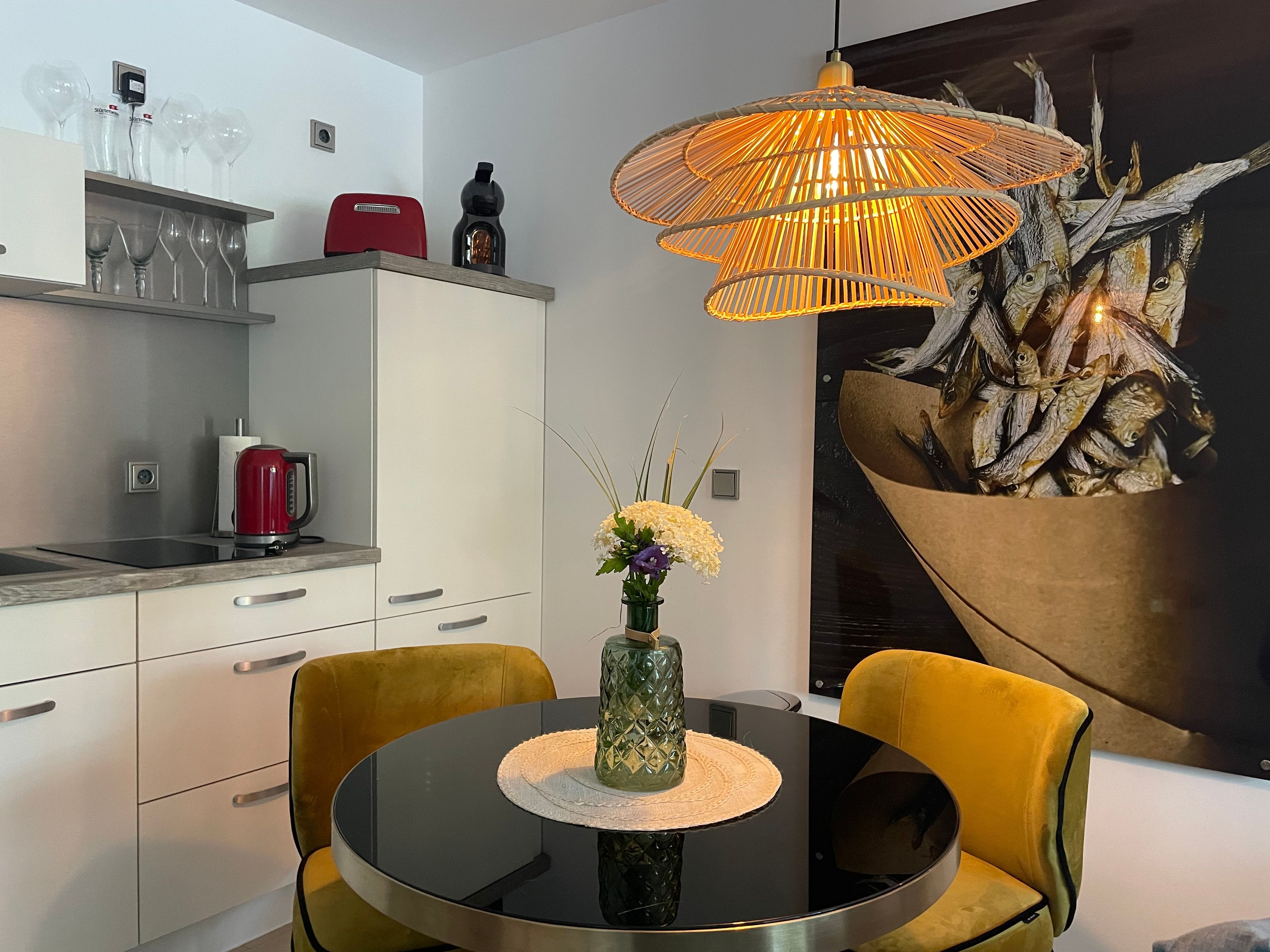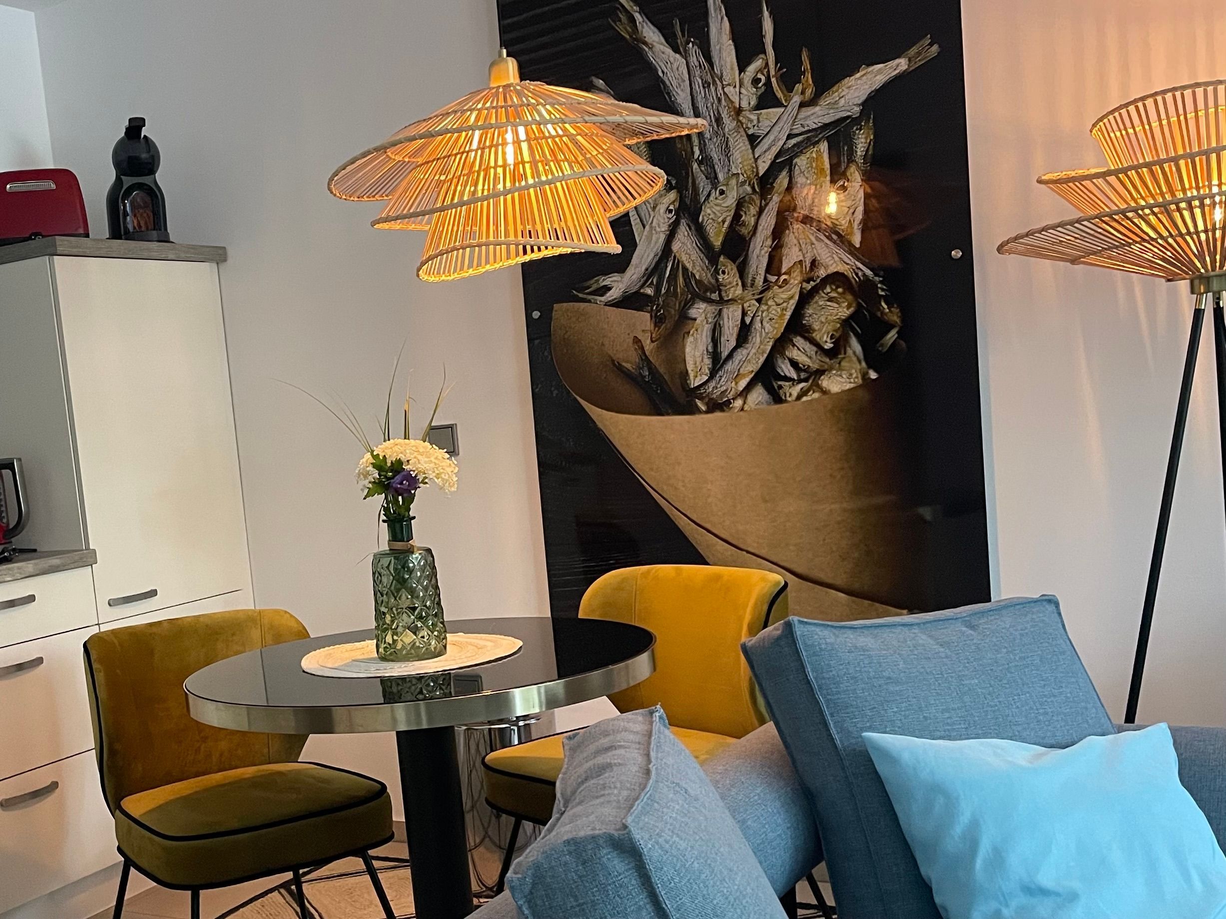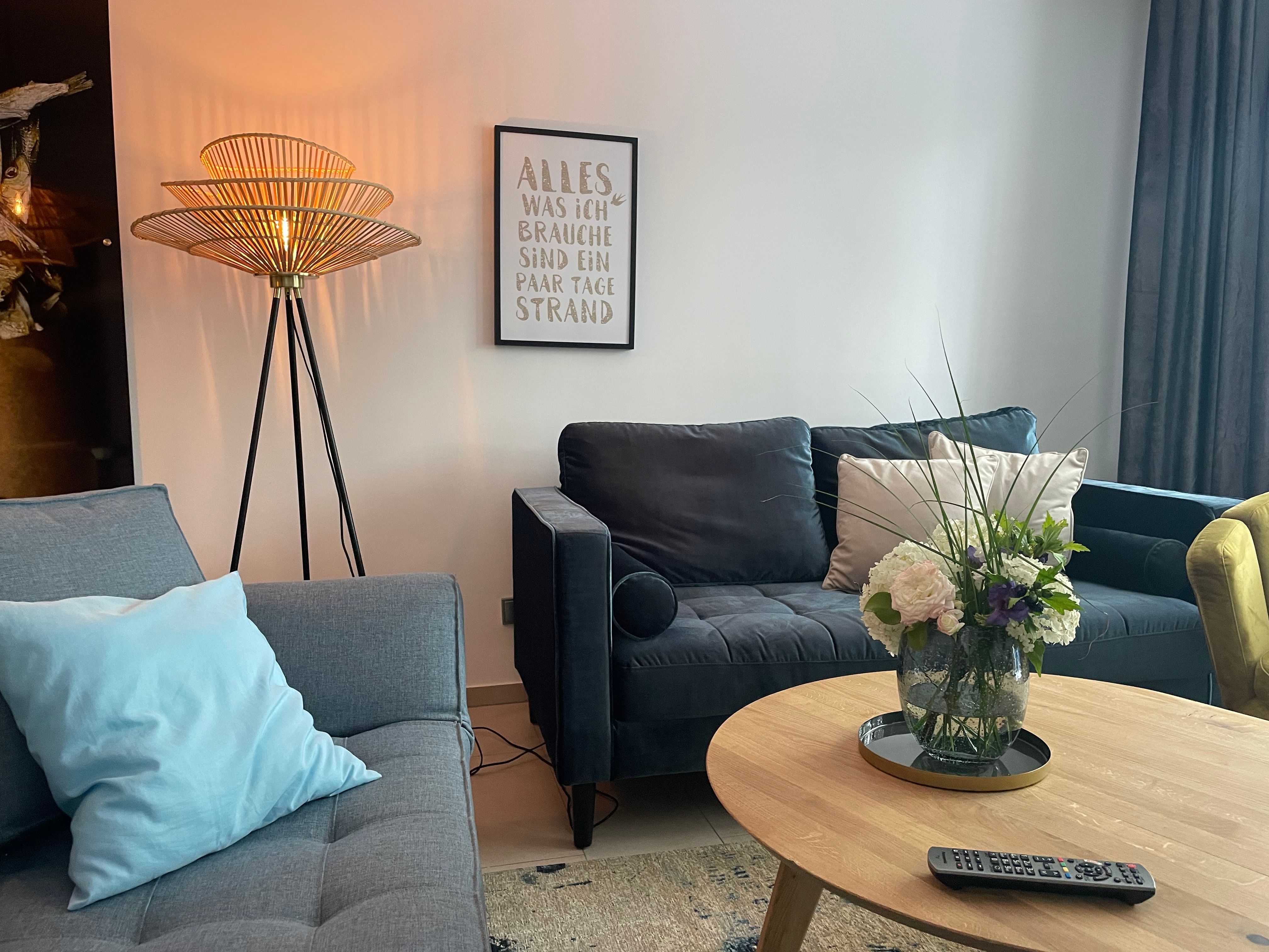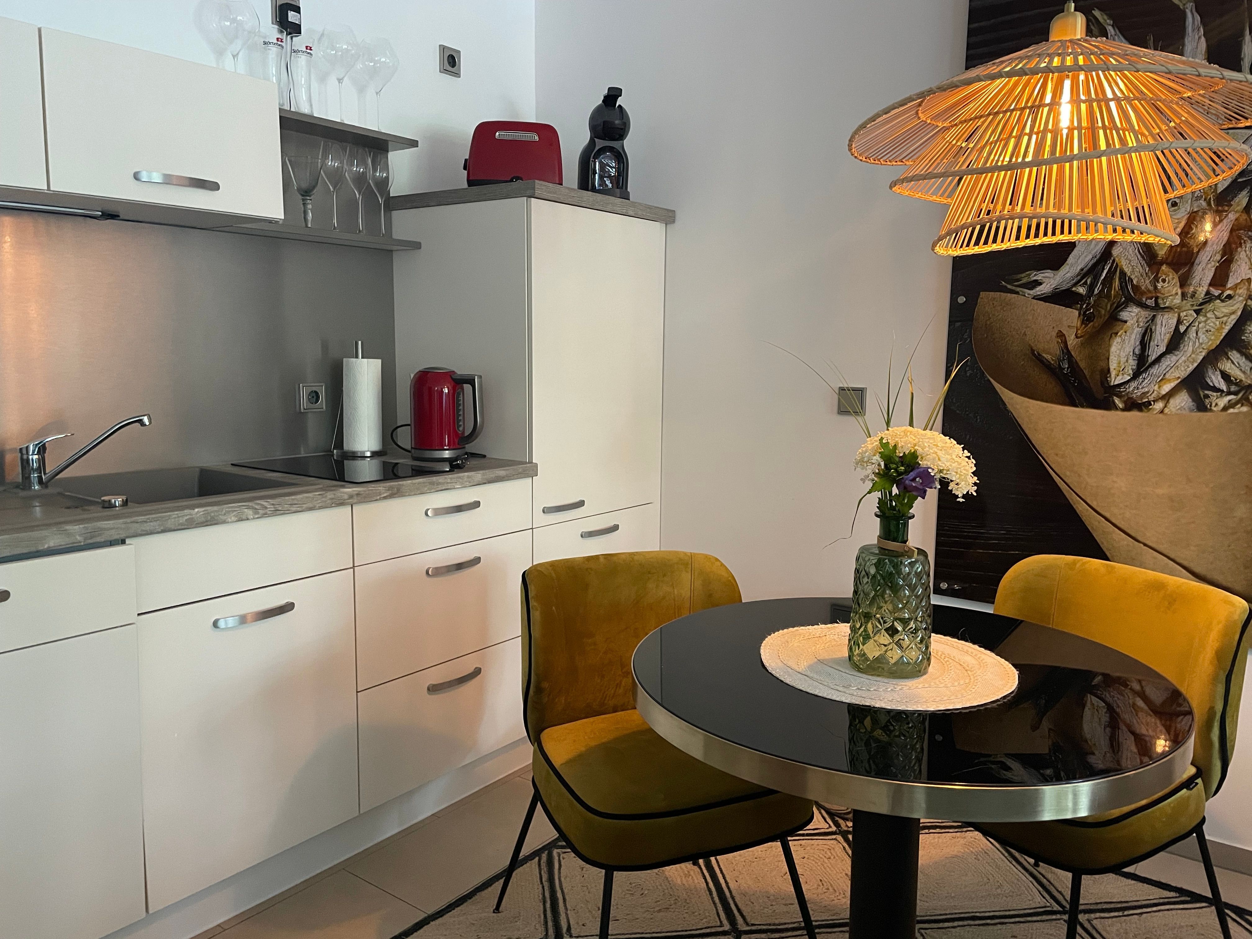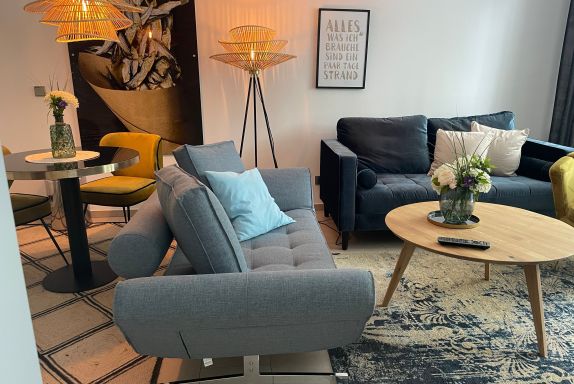 Die Suite Blaumuschel-Sprotte 6 mit Süd-Balkon liegt direckt am flach abfallenden Sandstrand von Lubmin. Es erwartet Dich eine Wohnküche mit Geschirrspüler und Ceran Kochfeld, Schlafraum mit King size Bett 2,00 x 2,00 m, Bad mit Badewanne und ein Südbalkon mit komfortabelen Terassenmöbeln.
