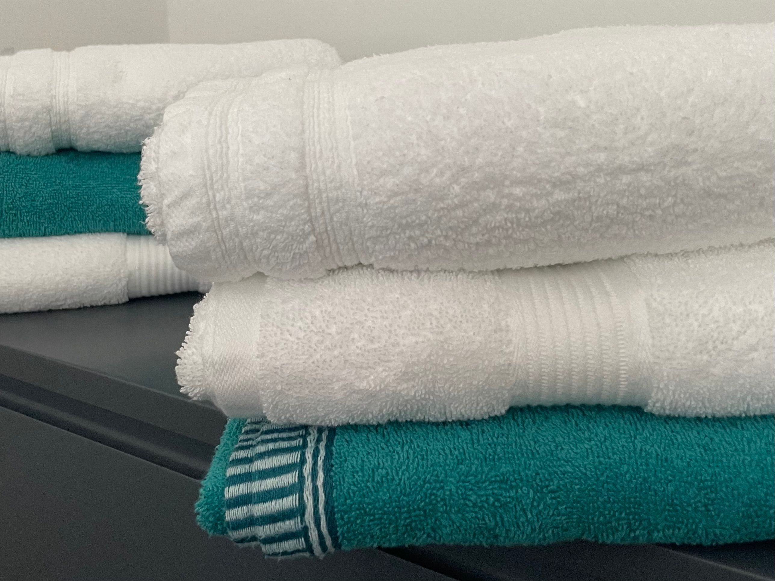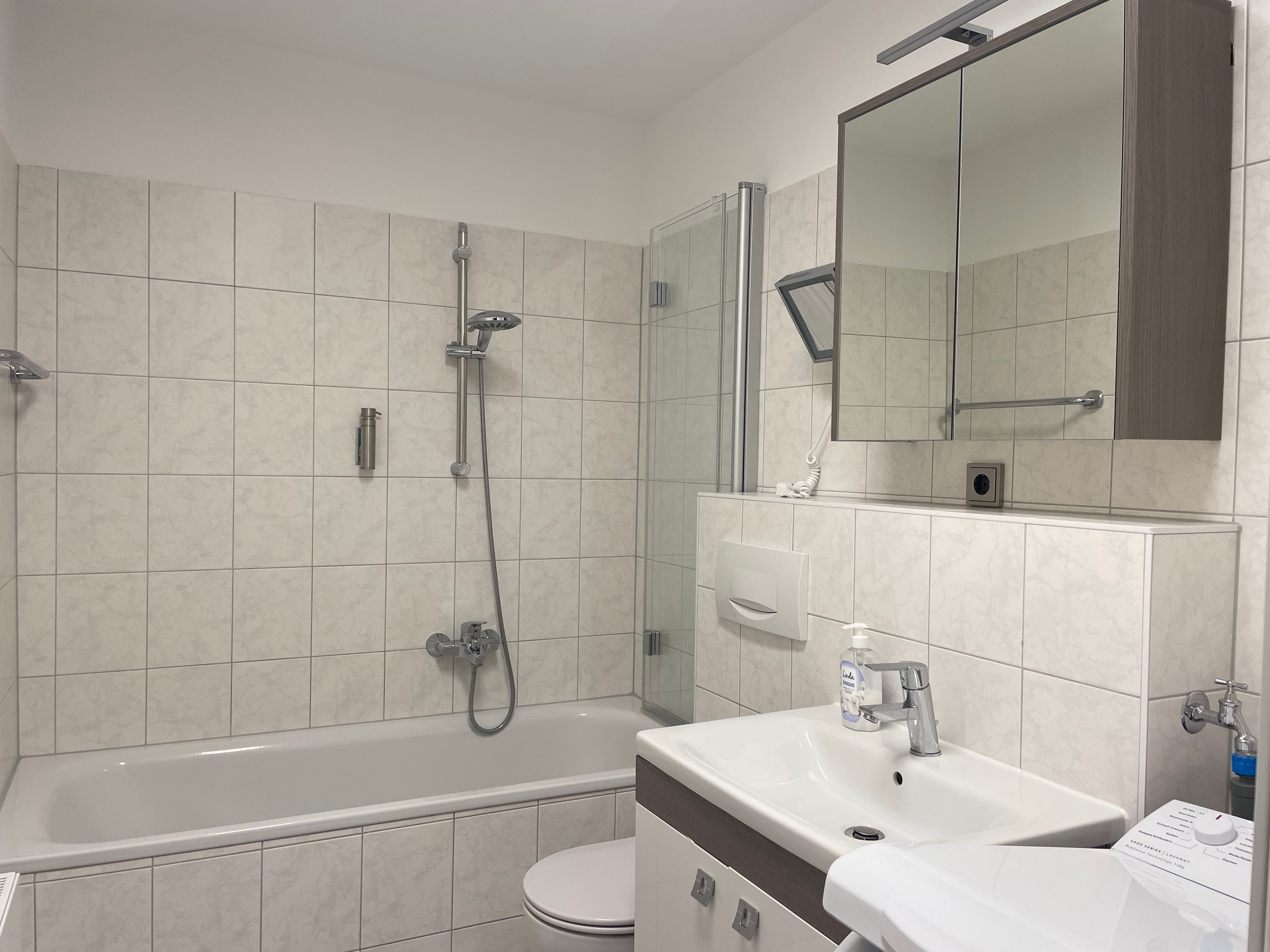 Bad mit Wanne, Fön, Handtücher, Bettwäsche,