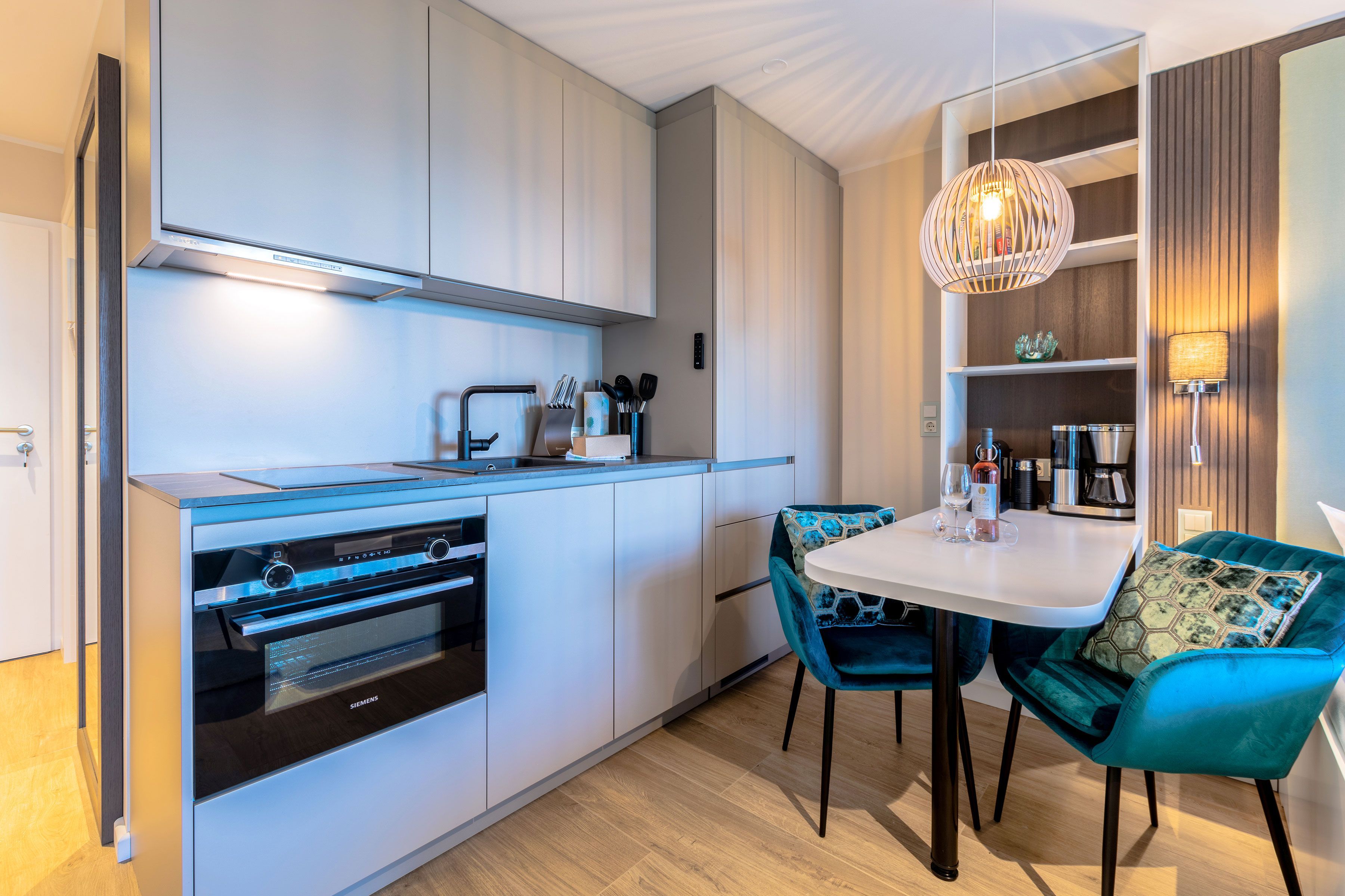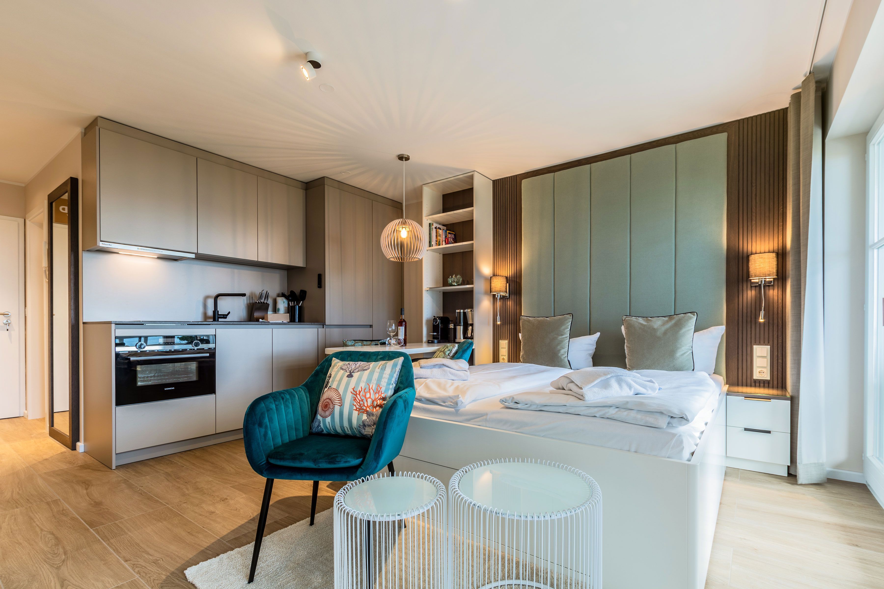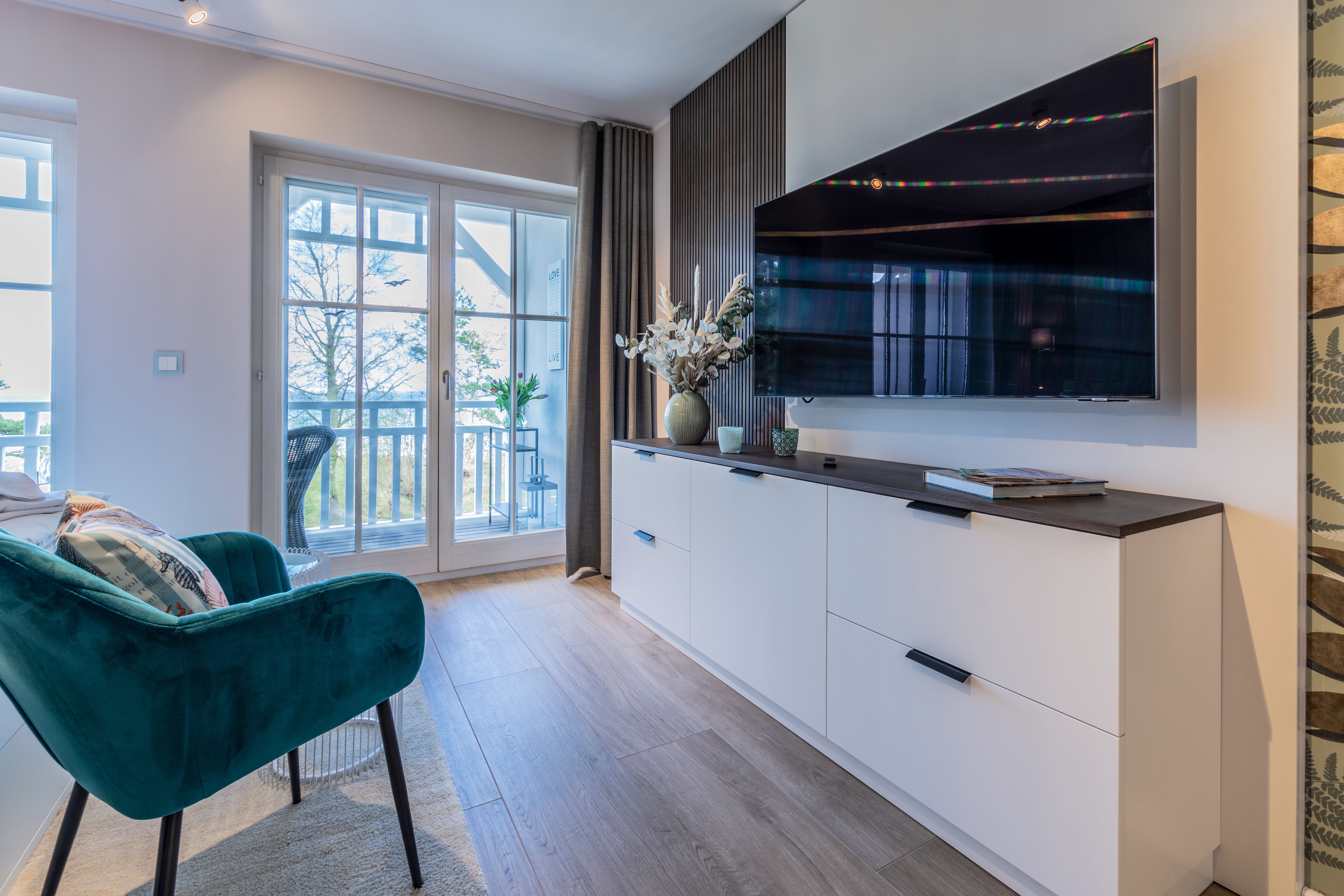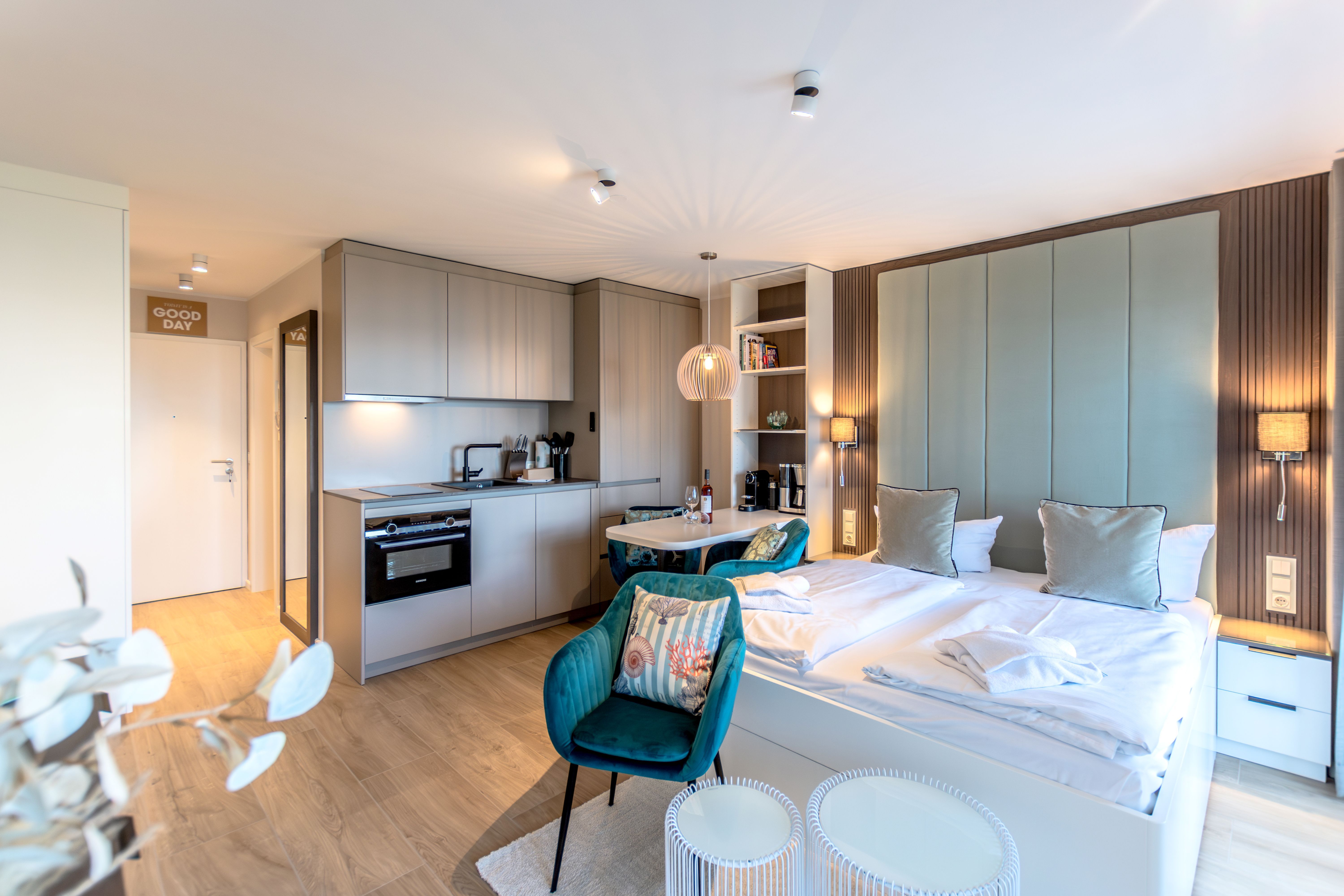 Die Wohnung verfügt über einen Wohn-Schlafraum mit TV, gemütlicher Sitzgruppe, Doppelbett und einem Balkon mit frontalem Ostseeblick. Eine komplett ausgestattete Küchenzeile mit Geschirrspüler, Ceran-Back-Herd und weitere nützliche Geräte wie Kaffeemaschine, Toaster, Wasserkocher etc. sind ebenfalls vorhanden.