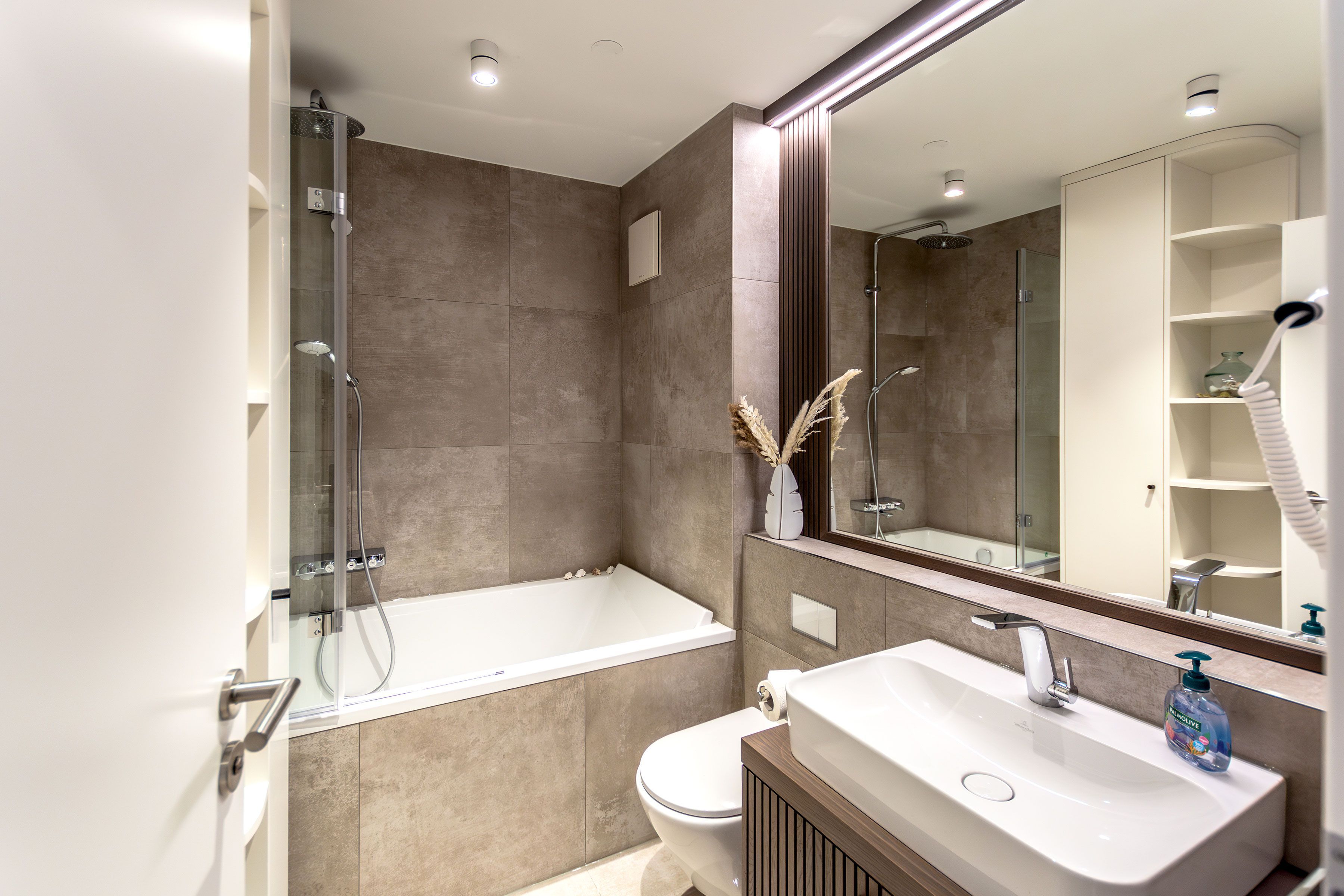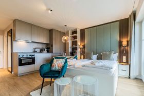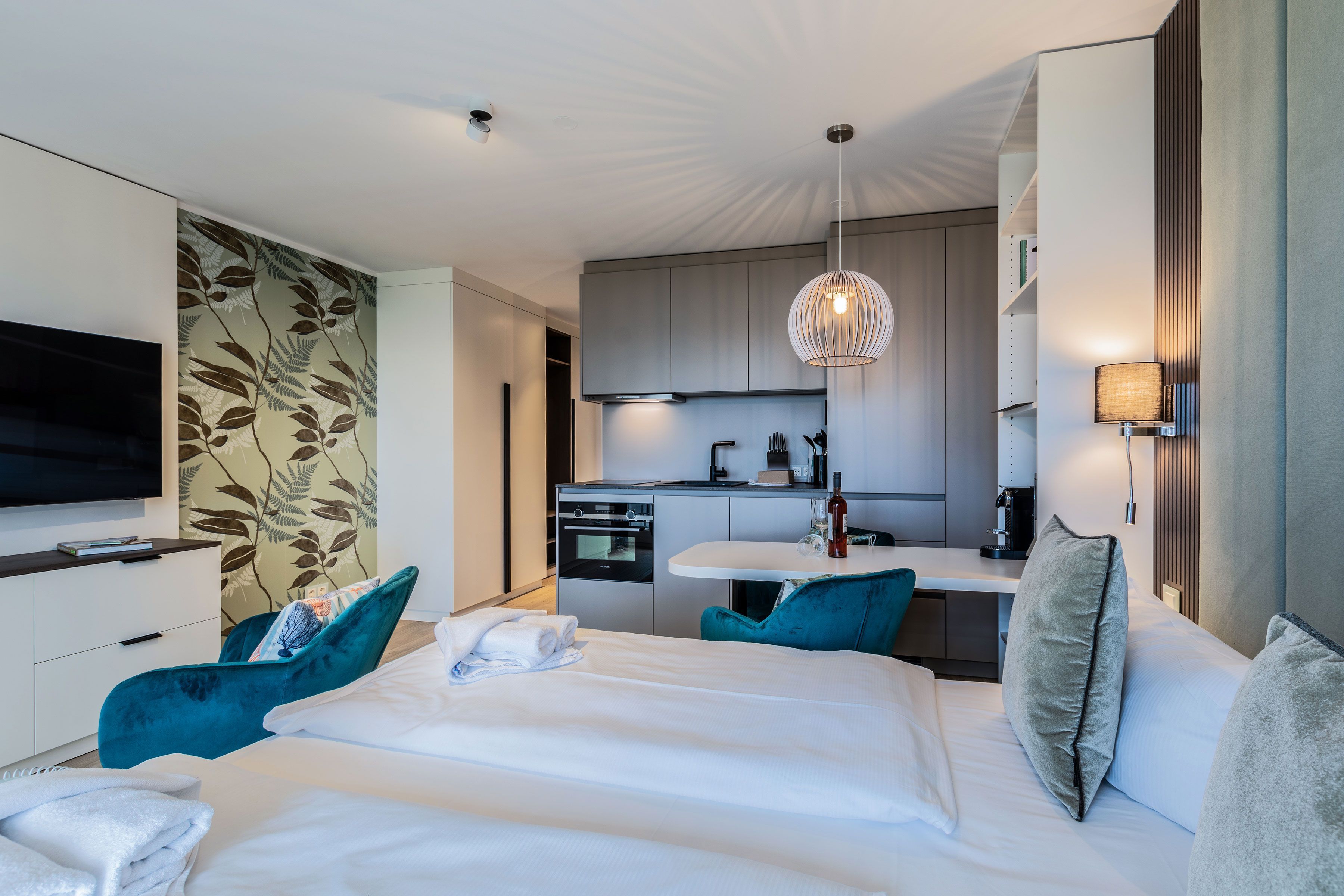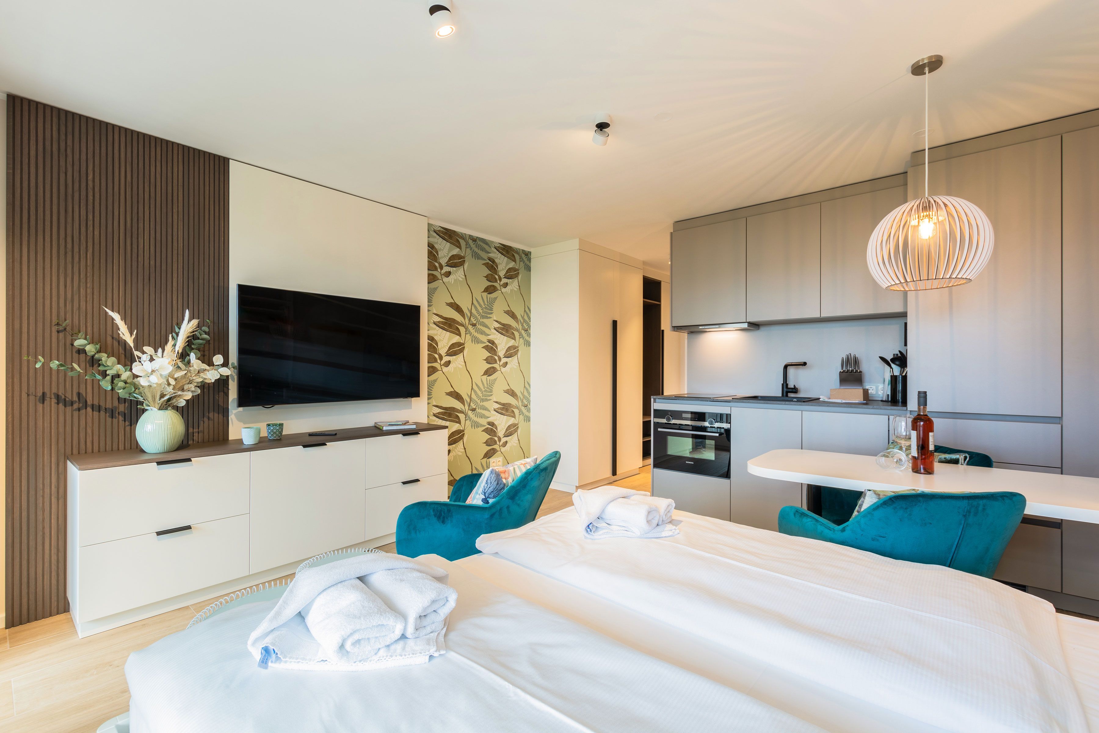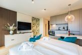 Die Wohnung verfügt über einen Wohn-Schlafraum mit TV, gemütlicher Sitzgruppe, Doppelbett und einem Balkon mit frontalem Ostseeblick. Eine komplett ausgestattete Küchenzeile mit Geschirrspüler, Ceran-Back-Herd und weitere nützliche Geräte wie Kaffeemaschine, Toaster, Wasserkocher etc. sind ebenfalls vorhanden.