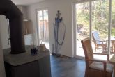 Im Erdgeschoss des Ferienhauses befinden sich der Wohnraum mit offener Küche und Essplatz sowie ein Dusch-Bad und eine Infrarotsauna. Der Essplatz schließt sich an den Wohn- und Küchenbereich an.