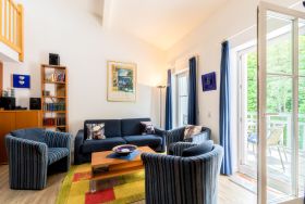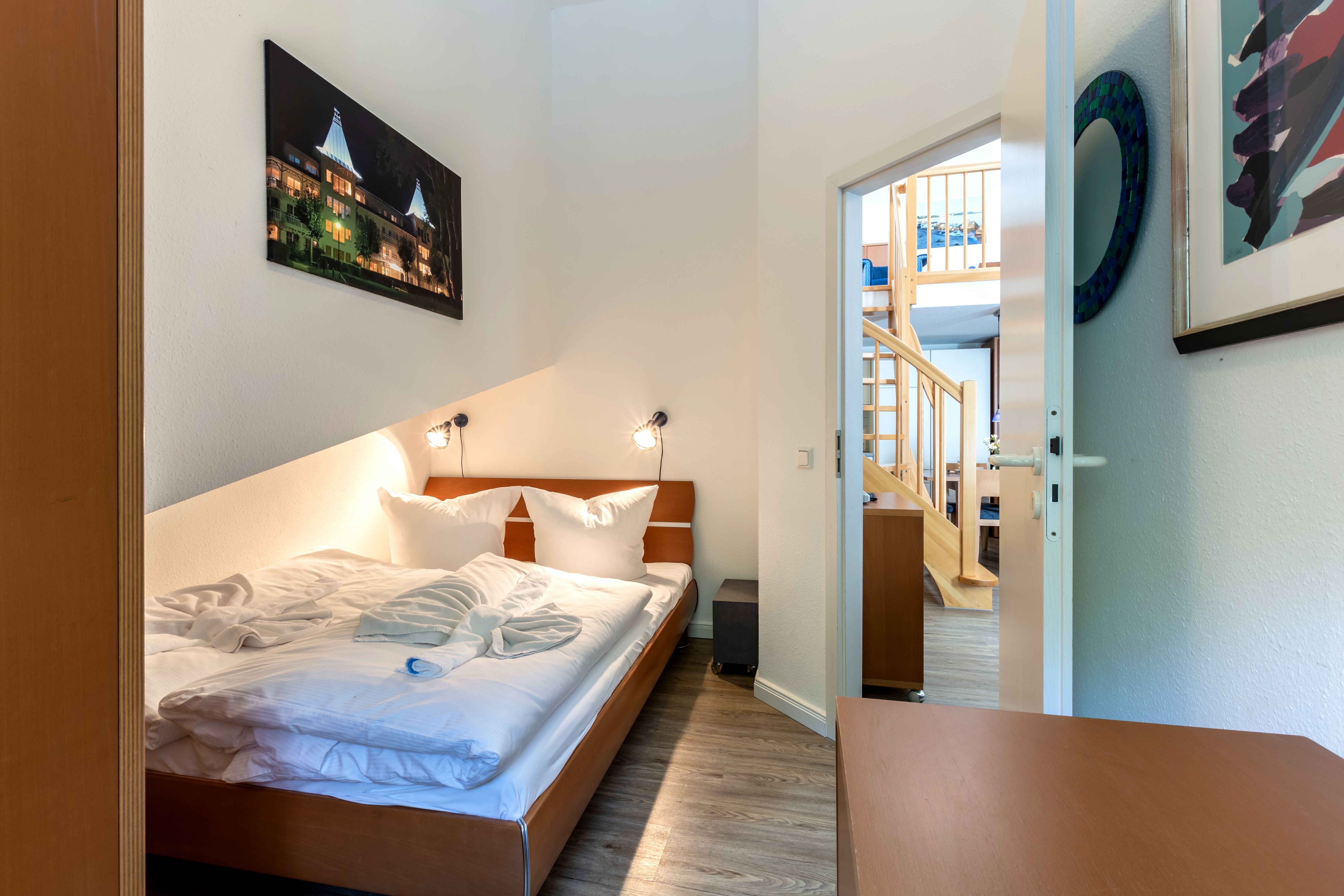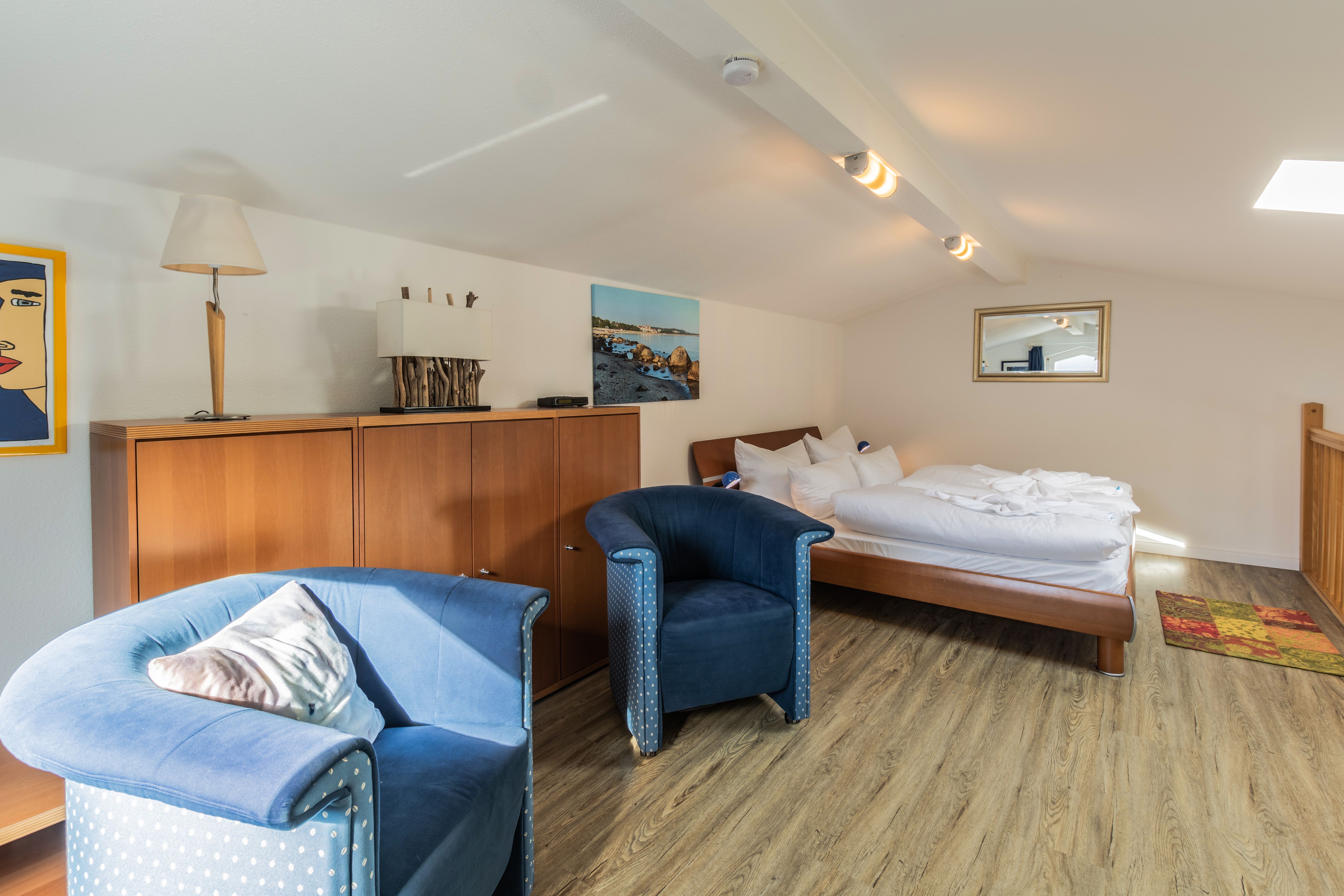 Ein Schlafzimmer ist mit einem Doppelbett und einem kleinen Kleiderschrank eingerichtet. In der Galerie befindet sich ein weiterer Schlafbereich mit Doppelbett sowie einem Kleiderschrank, der ausreichend Platz für Ihre Urlaubsgarderobe bietet.