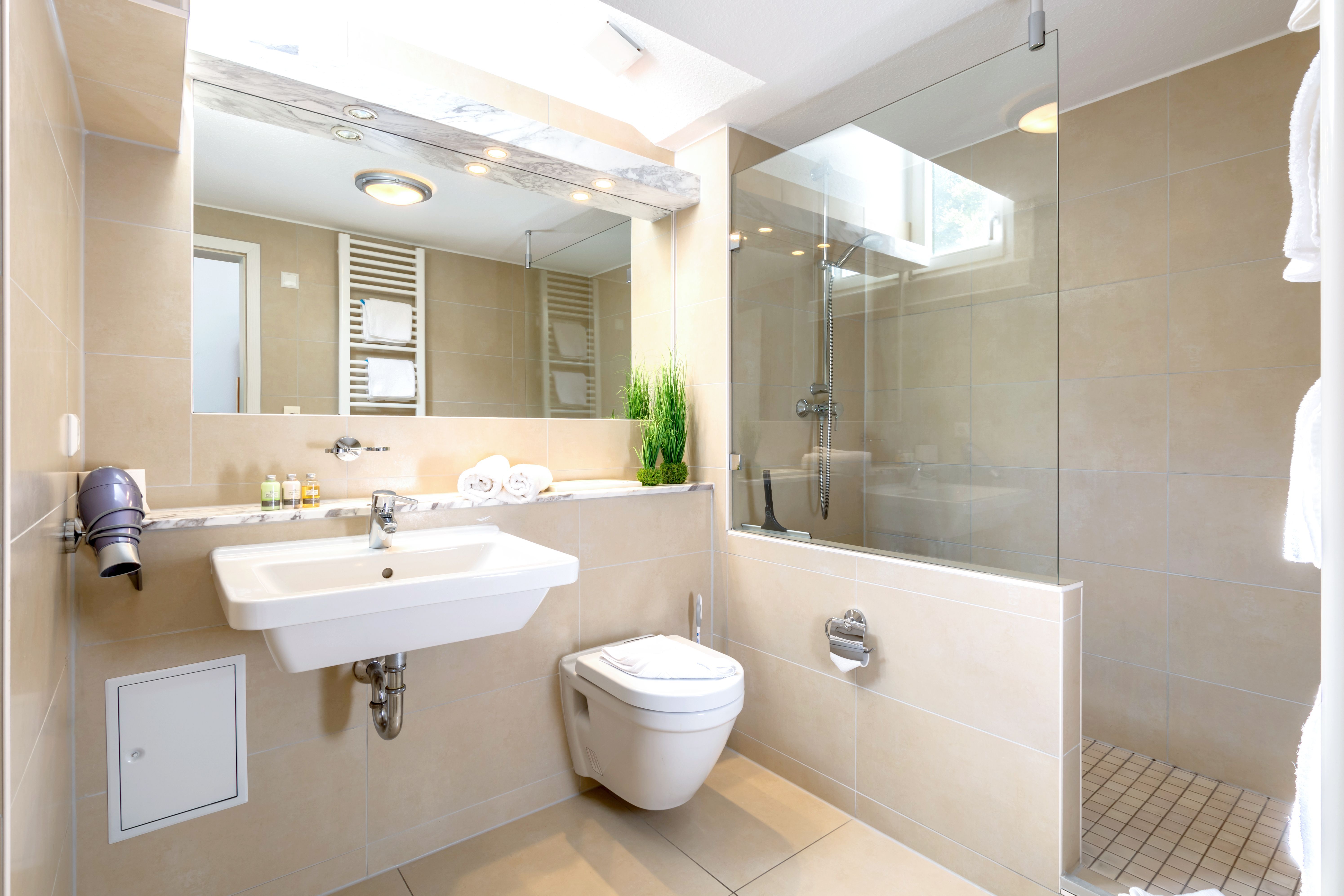 Das moderne Badezimmer verfügt über eine Dusche, Fußbodenheizung, einen beleuchteten Waschtisch sowie einen Föhn.