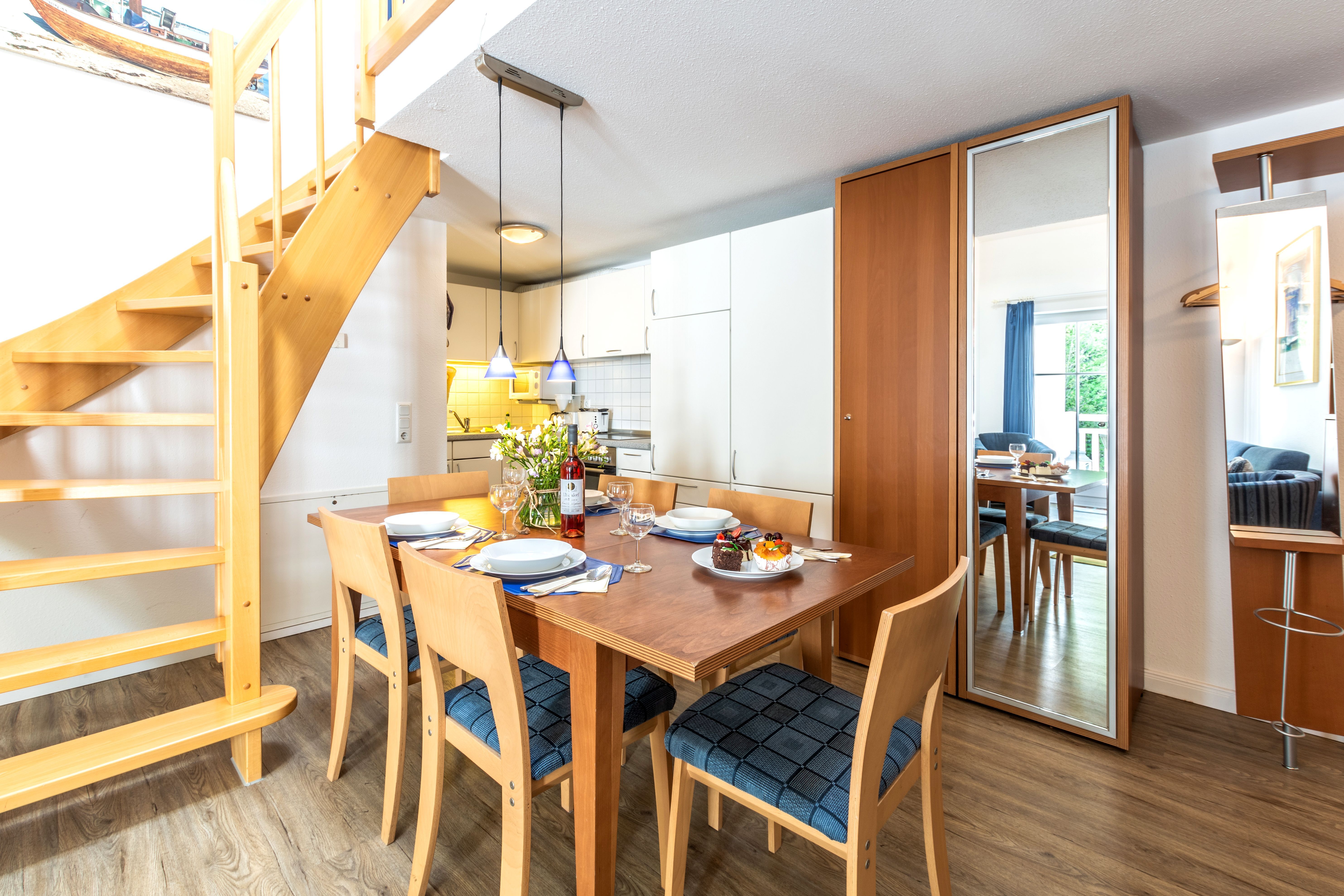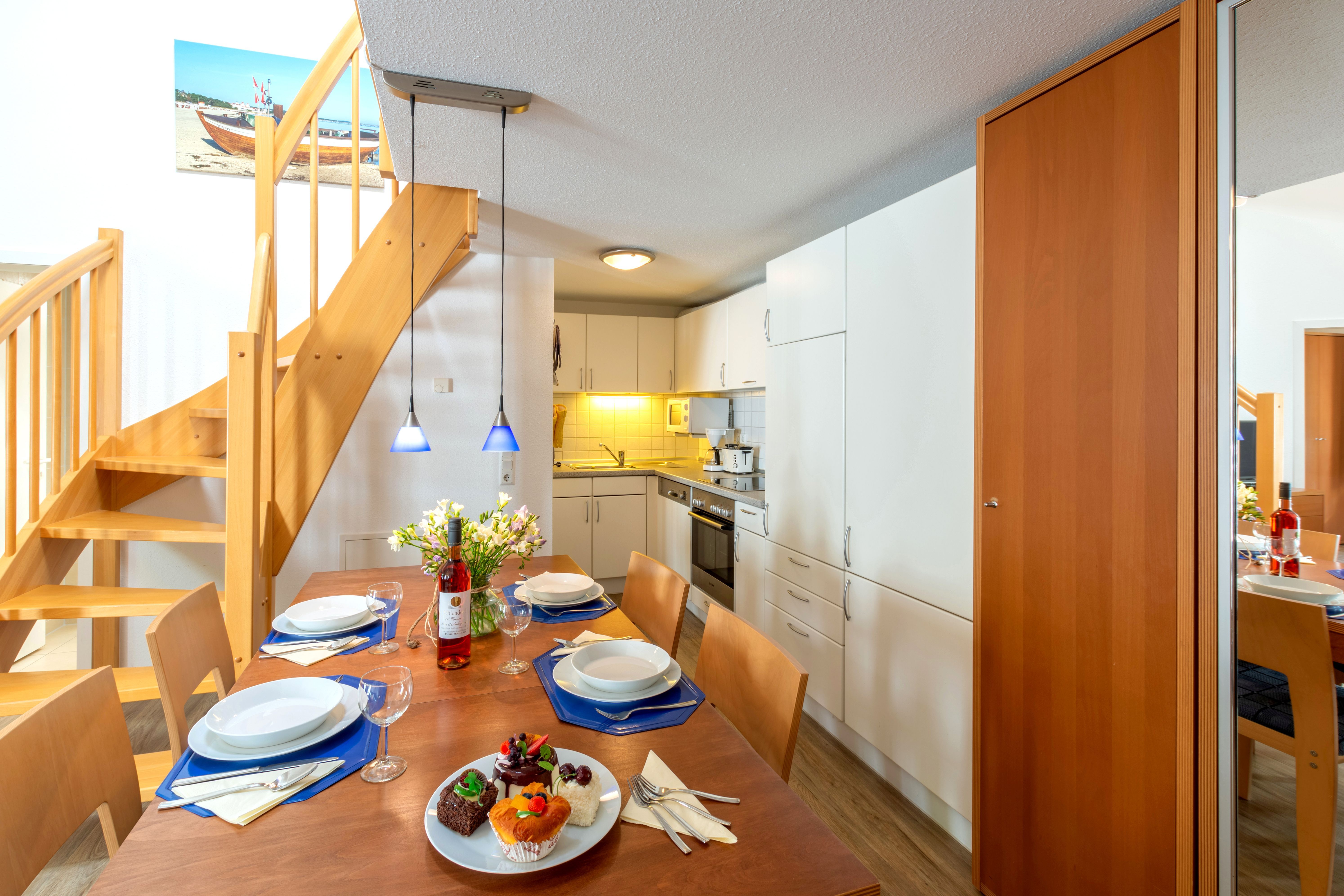 Die offene Wohnküche ist hell und vollständig ausgestattet. Ceran-Back-Herd, Geschirrspüler, Mikrowelle, Kaffeemaschine, Toaster und Wasserkocher stehen bereit, um köstliche Mahlzeiten zu zaubern. Am angrenzenden Essbereich lässt es sich in geselliger Runde genießen und plaudern.