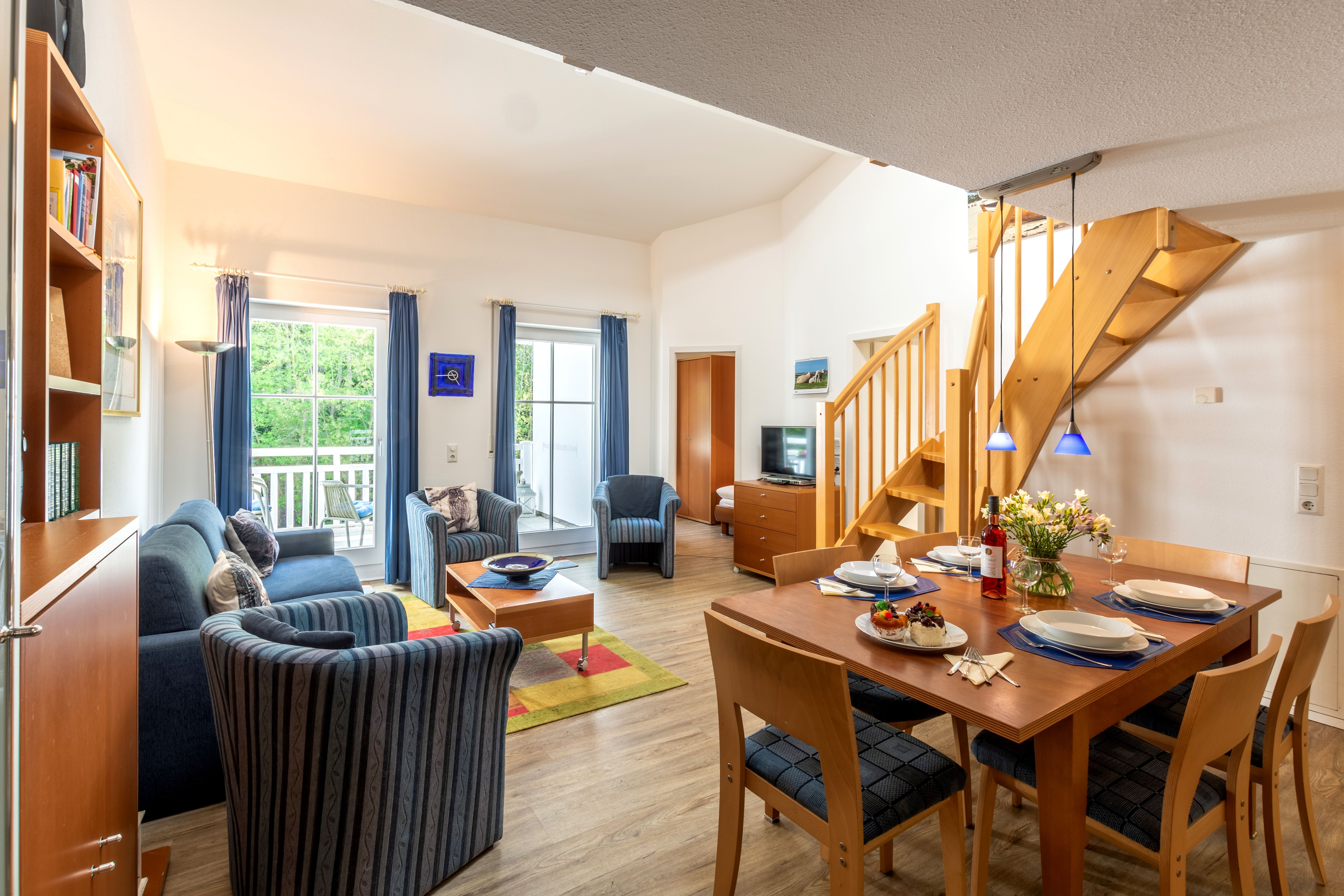 Die liebevoll eingerichtete Wohnung ist über einen Aufzug bequem erreichbar. Der Wohnraum ist mit einem gemütlichen Sofa ausgestattet und lädt zu entspannten Abenden mit Familie oder Freunden ein. Für Unterhaltung sorgen ein Flachbildfernseher sowie eine kleine Auswahl an Büchern, und dank kostenfreiem WLAN bleiben Sie auch im Urlaub bestens verbunden. Vom Wohnzimmer aus gelangen Sie direkt auf den sonnigen Südbalkon mit Blick in den idyllischen Granitzer Wald ein herrlicher Platz für das Frühstück im Freien oder einen Glas Wein in der Abendsonne.