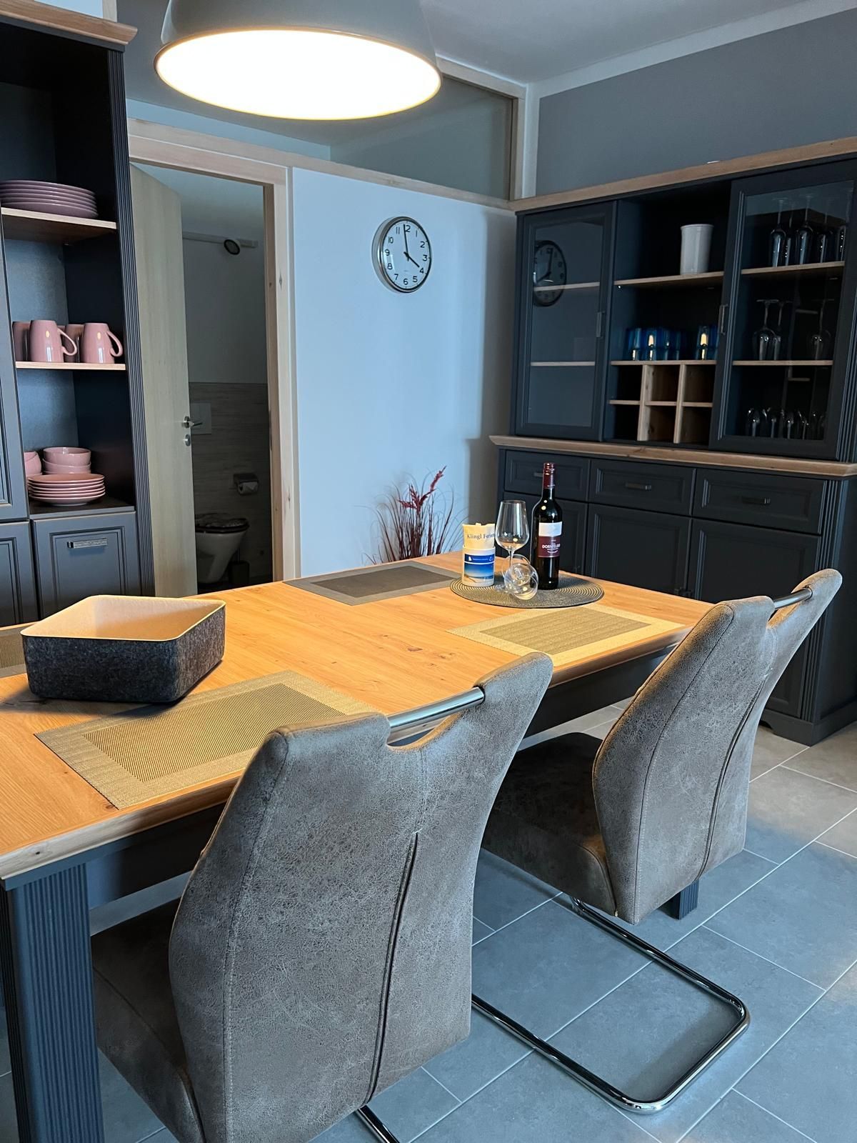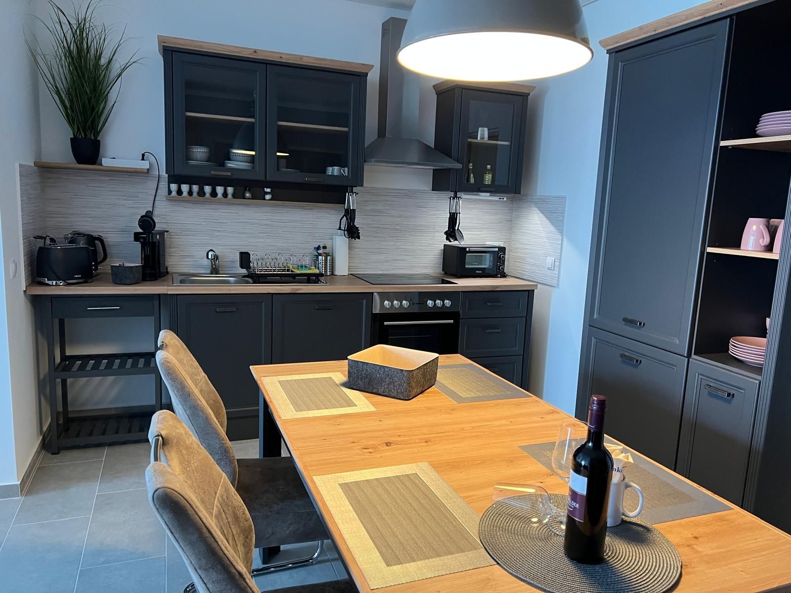 Die neue, voll ausgestattete Einbauküche lädt zum ausgiebigen Kochen ein. Genießen Sie Ihre Mahlzeiten am gemütlichen Esstisch.