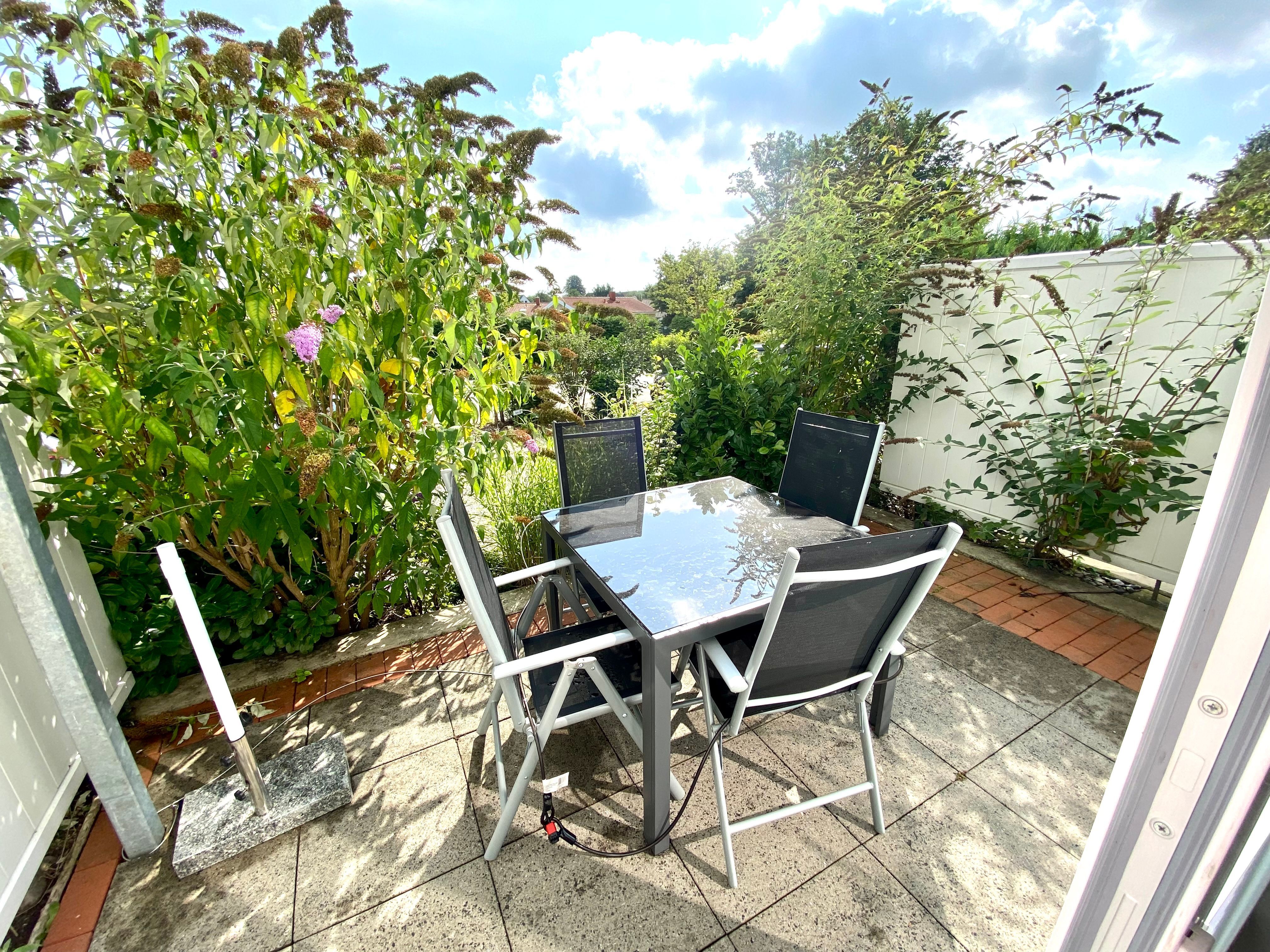 Die möblierte Terrasse lädt zum Verweilen ein.