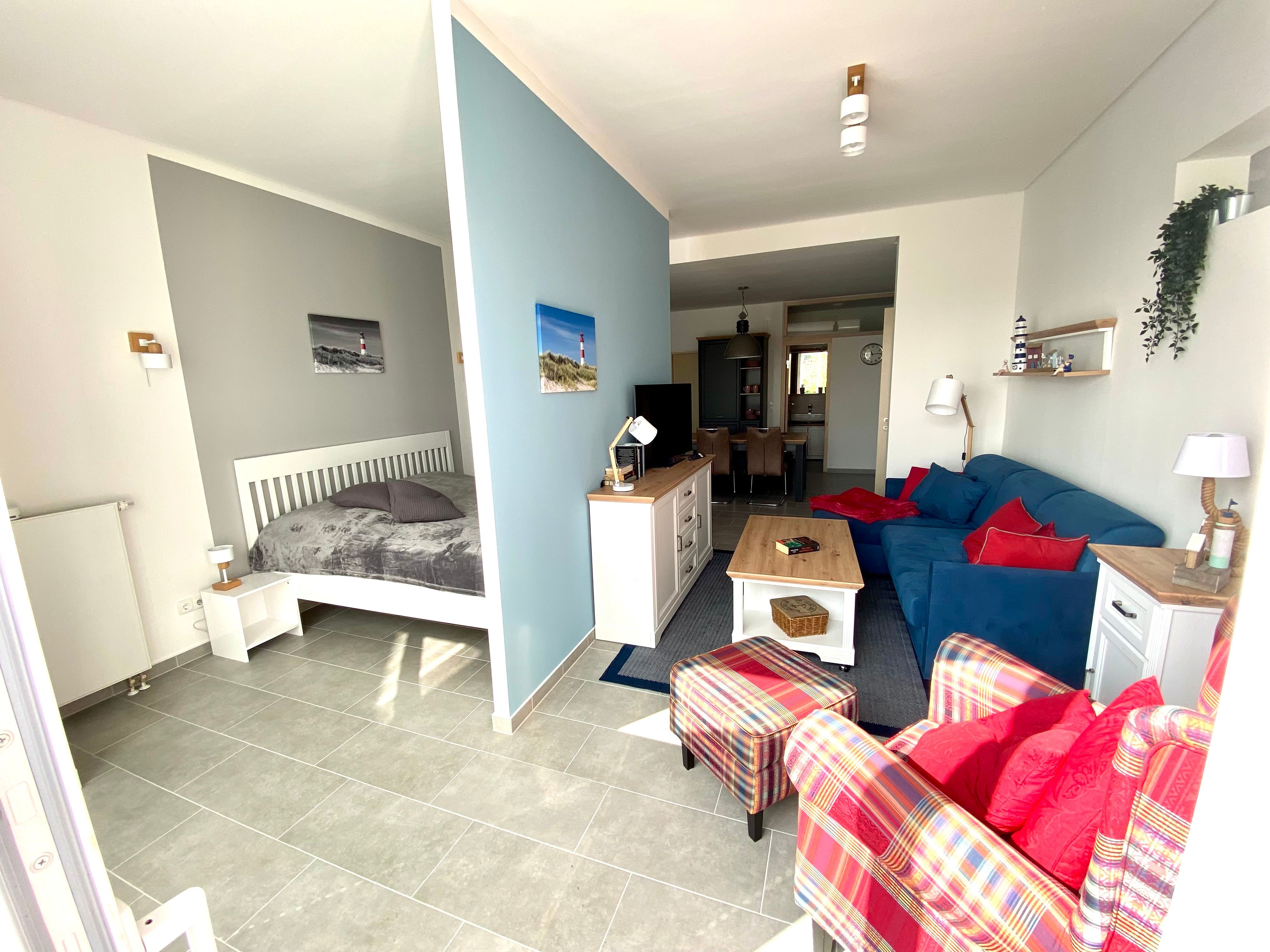 Der kombinierte Wohn-/Schlafraum verfügt über eine Schlafcouch (140cm x 200cm) und ein Doppelbett (180cm x 200cm/getrennte Matratzen. Das Doppelbett ist durch einen Raumtrenner vom Sofabereich getrennt.