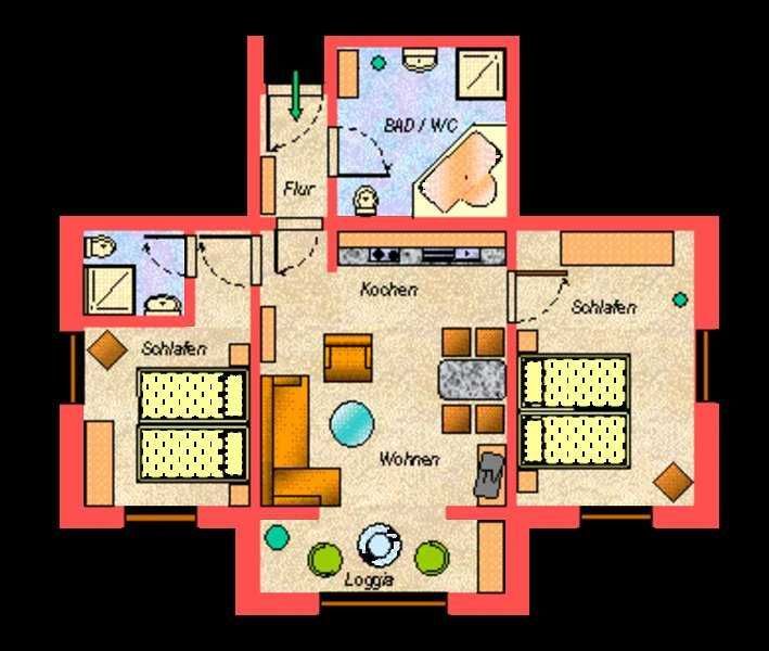 Unsere großzügig und stilvoll eingerichteten Appartements der Kategorie Balance sind für maximal 4 Erwachsende und ein Kind bis 3 J. im Kinderreisebett ausgelegt und bieten Ihnen einen Wohn- und zwei Schlafräume sowie einen Vorflur mit Garderobe. In den beiden durch das Wohnzimmer getrennten Schlafzimmern, stehen jeweils ein großer Schrank und ein bequemes Doppelbett mit Nachttischen und Leselampen. Im Wohnbereich bilden ein großer Tisch mit Stühlen, eine gemütliche Loggia mit Rattanmöbeln und eine große Sitzgarnitur ein großzügiges Wohnensemble. Hier findet jeder Gast mindestens eine Lieblingsecke. Zur Ausstattung gehören weiterhin eine komplett ausgestattete Küchenzeile, Kabel-Radio/TV, DVD-Player und Gesellschaftsspiele. Wundern Sie sich nicht, wenn Ihre lieben Kleinen bei uns von sich aus zum Waschen gehen wollen und dann länger bleiben: das sehr große Badezimmer mit einer Eckbadewanne für Zwei, Dusche, WC und Handtuchtrockner sind dann vielleicht Schuld daran. Ein zweites Bad mit Dusche und WC ist direkt von einem der beiden Schlafzimmer aus zugänglich. Die in warmen und freundlichen Farben gestalteten Appartements sind mit Laminatfußboden ausgelegt und vermitteln eine behagliche Wohnatmosphäre. Auf einer zur Villa gehörenden Terrasse, können Sie z. B. am Abend grillen. Die Appartements erreichen Sie mit einem Lift, mit dem Sie auch im Bademantel gekleidet, bequem in die Wellness- bzw. Fitnessetage gelangen.