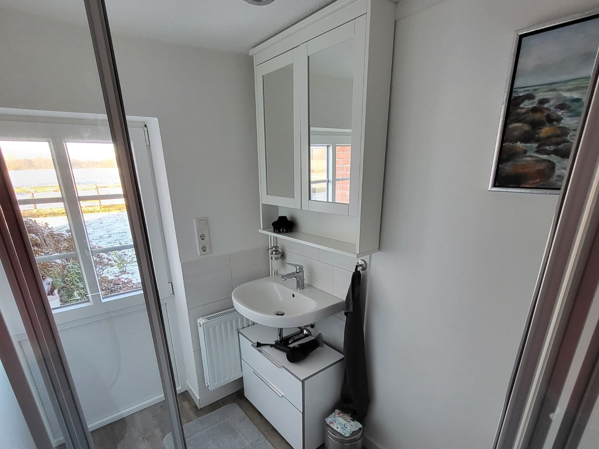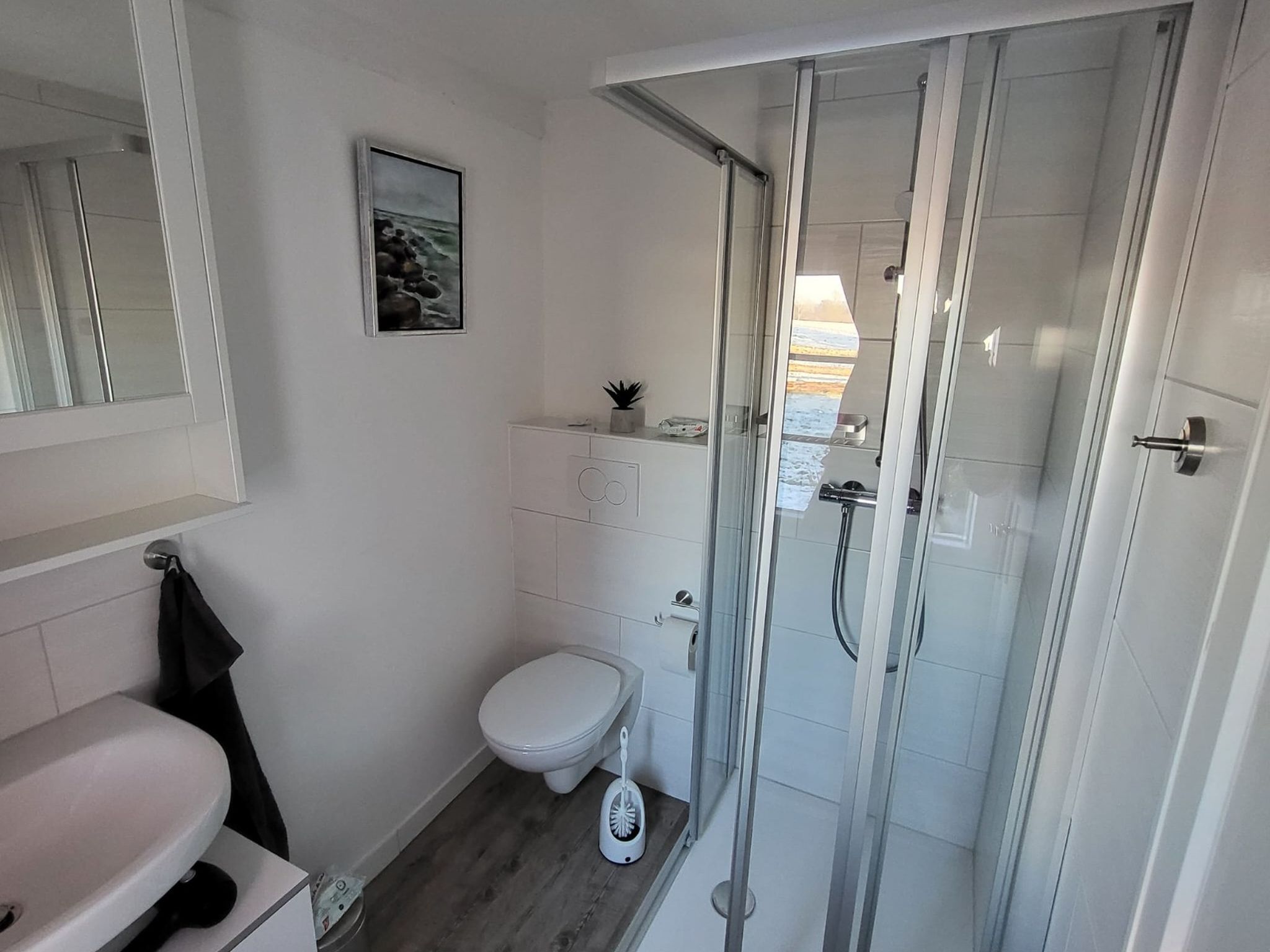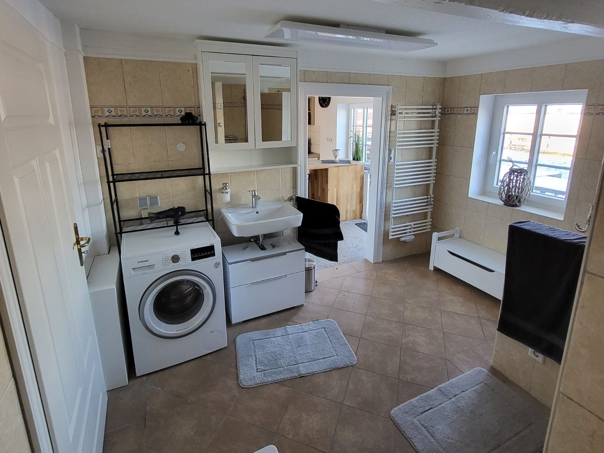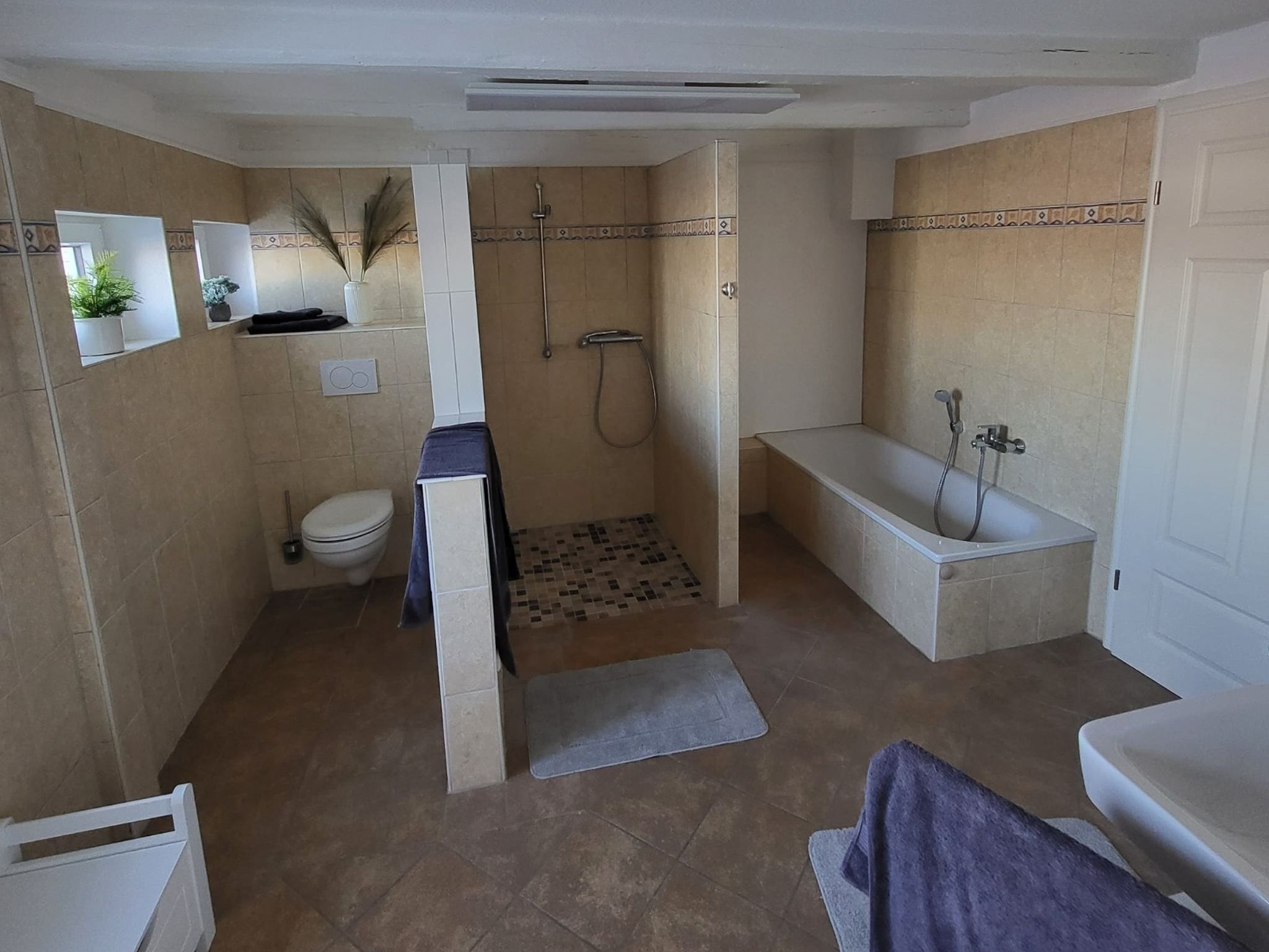 • 1 Duschbad mit bodengleicher Dusche, Badewanne, WC und Waschmaschine; Handtücher inkl. (1 Duschtuch/1 Handtuche pro Person)