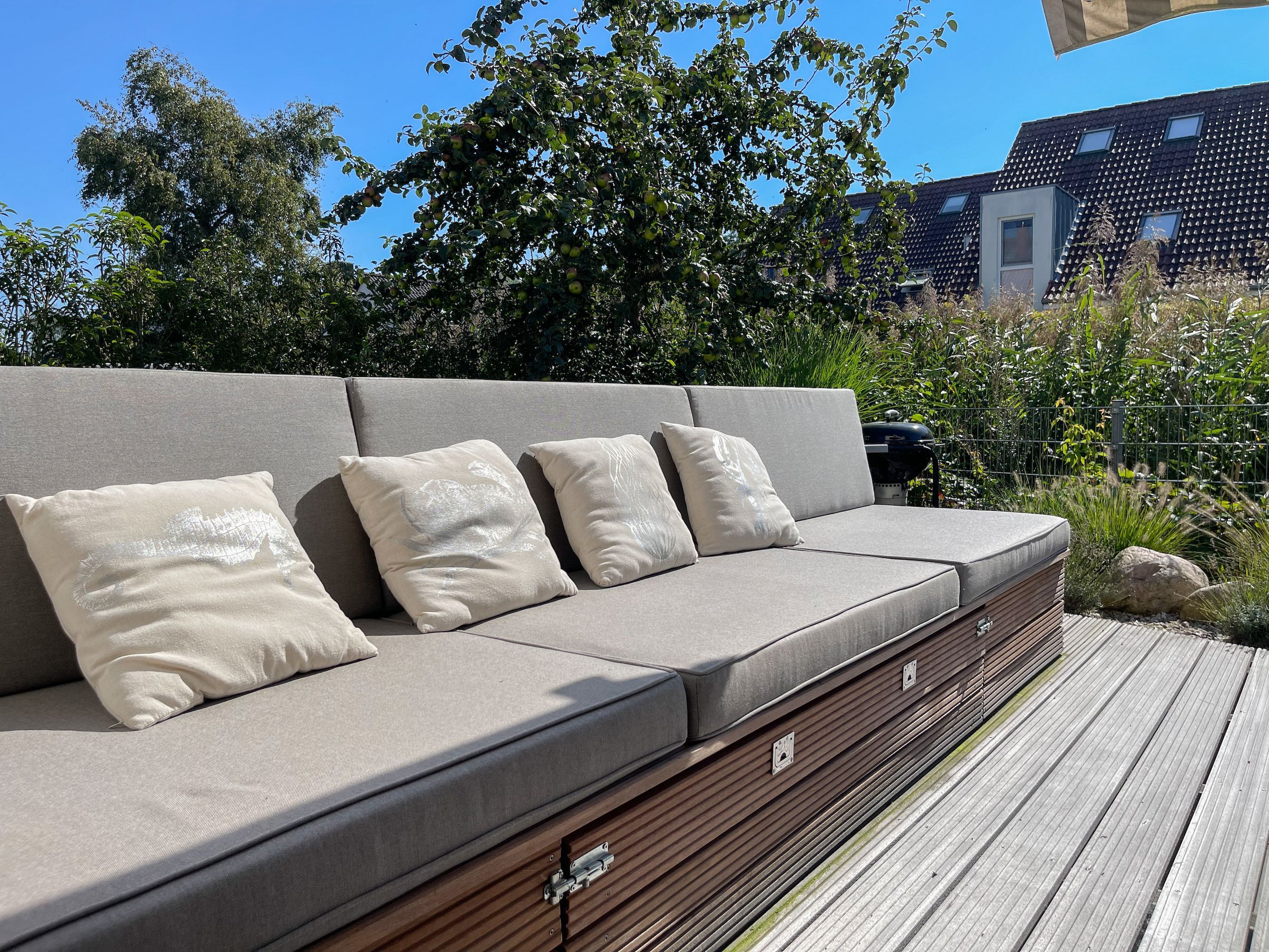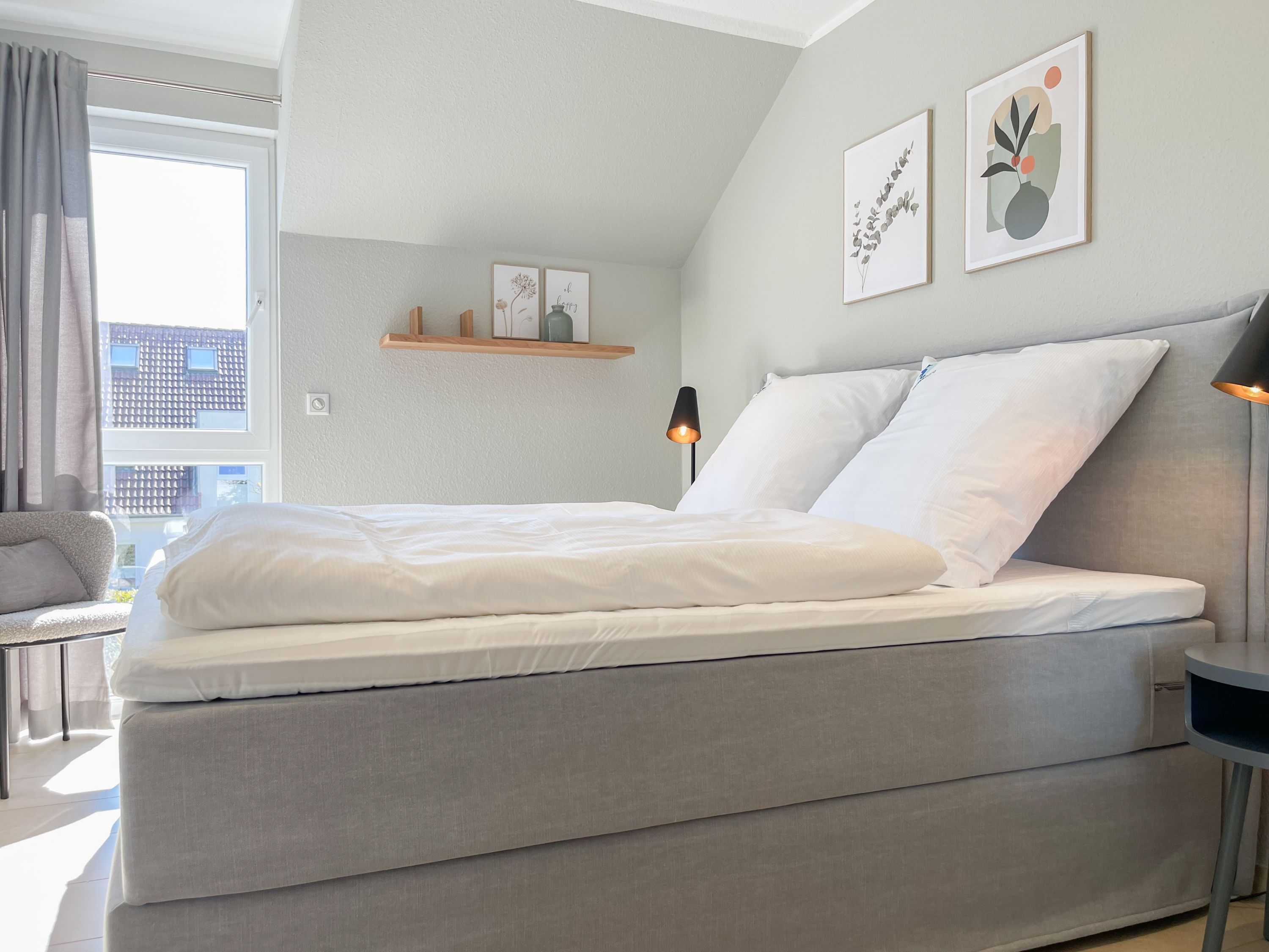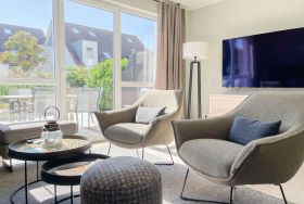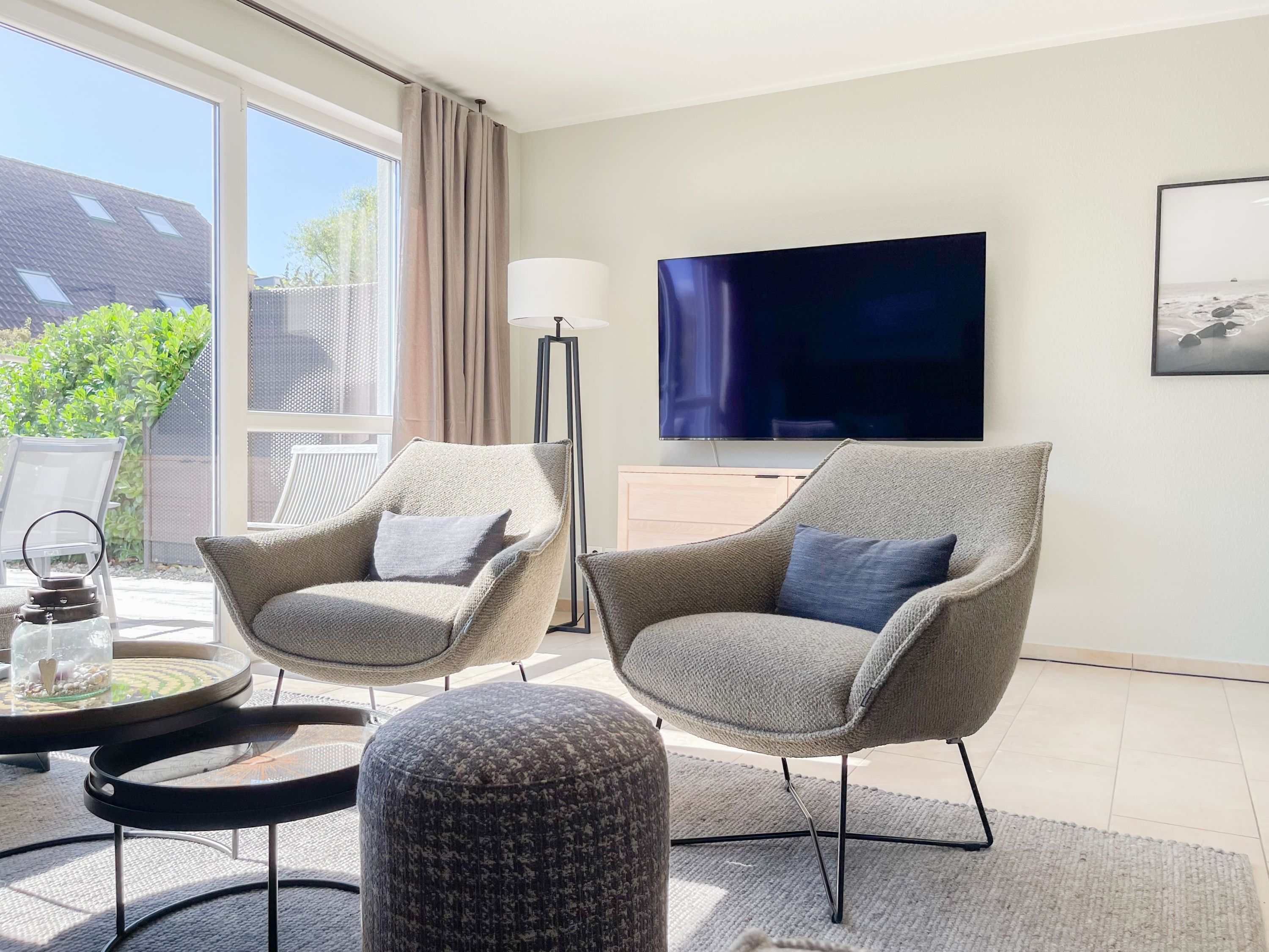 Es erwartet Sie ein exklusives Doppelhaus, das mit 3 Schlafzimmern und 2 Bädern auf über 100 qm Wohnfläche ausreichend Raum für 4-6 Personen bietet, um einen entspannten Ostseeurlaub in Strandnähe zu verleben. Sonnige Räumlichkeiten und die äußerst hochwertige Einrichtung im Hampton Style garantieren einen hohen Wohnstandard in einem herrlichen Ambiente. Im Erdgeschoss erwartet Sie ein großzügiger Wohnbereich, der mit einem komfortablen Sofa, Sesseln und TV eingerichtet ist. Die vorgelagerte Holz-Sonnenterrasse in Südausrichtung ist mit einer XL - Lounge und Gartenmöbeln sowie einer elektrischen Markise ausgestattet.