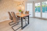 • Terrasse: Gestaltet mit einem Tisch, vier Stühlen, einem zweier Strandkorb und Grill, neben einem Sonnenschirm.