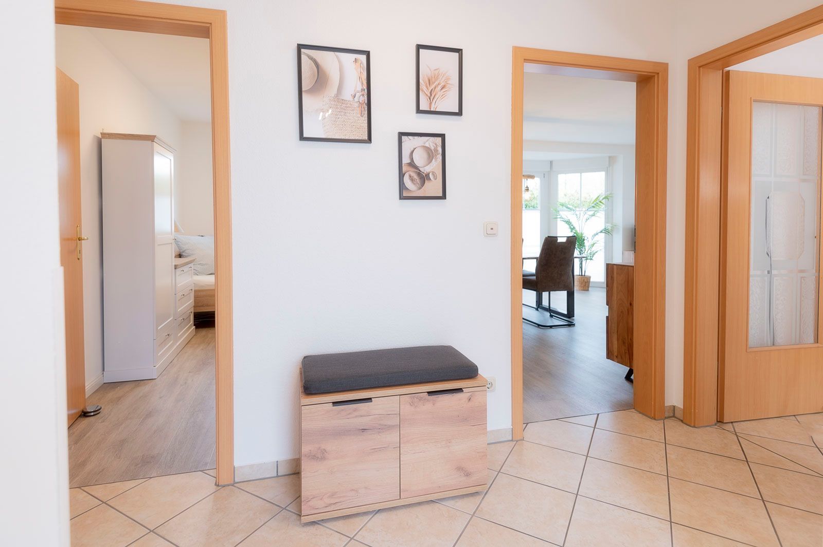 • Schlafzimmer 1: Ausgestattet mit einem Doppel-Boxspringbett, umfassendem Stauraum und Flat-TV.