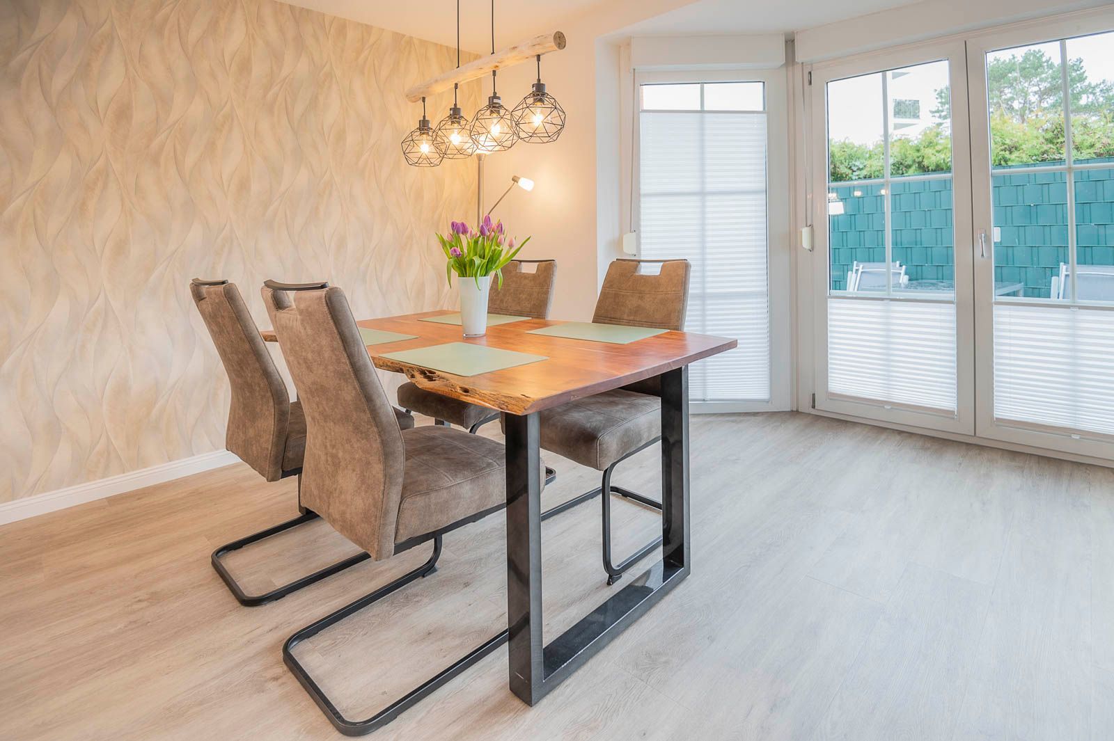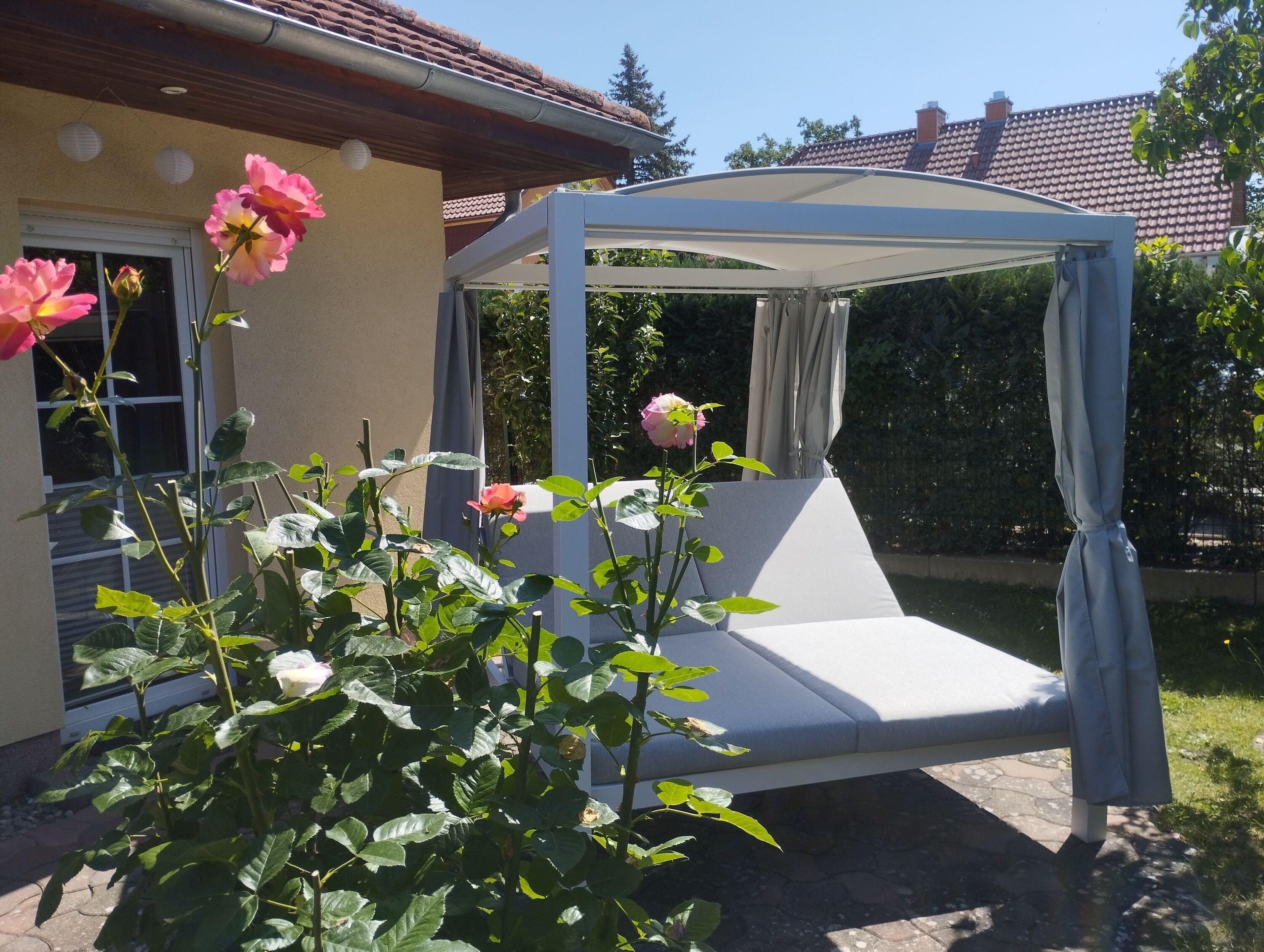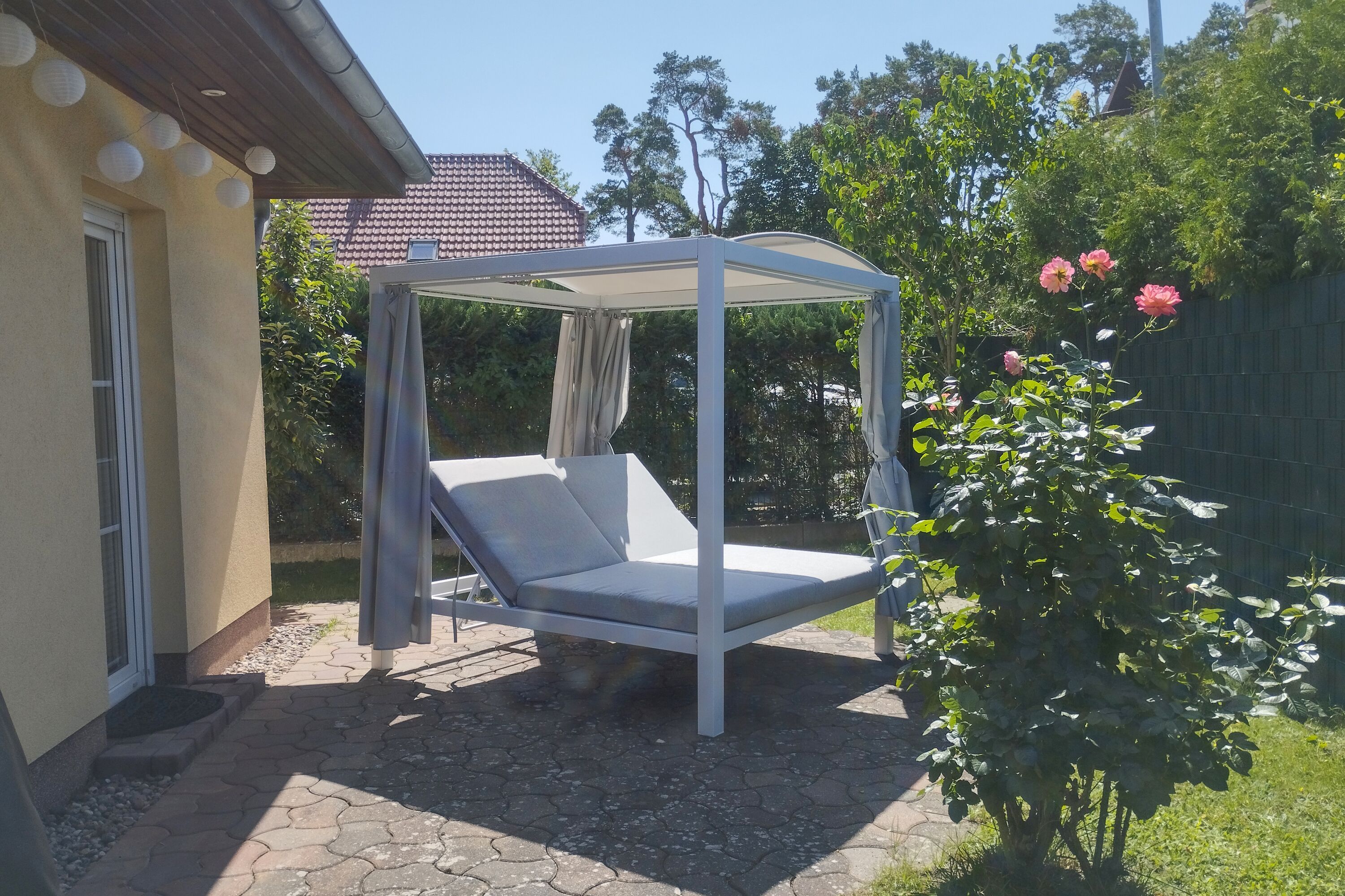 • Terrasse: Tisch, 4 Stühle mit Auflagen, 2er Strandkorb, Grill, Sonnenschirm