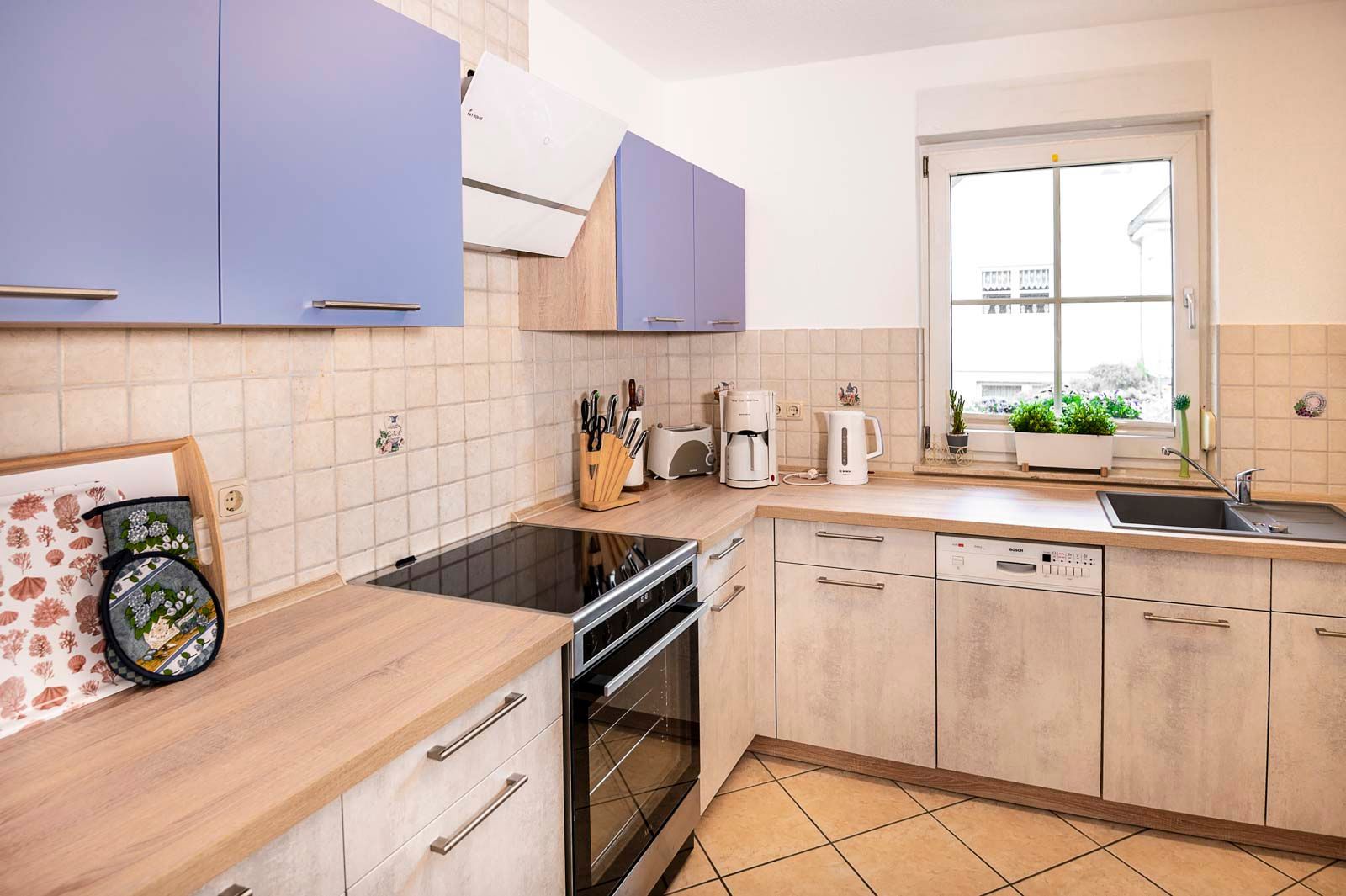 • Küche: E-Herd mit Ceranfeld und Backofen, Kühlschrank mit Gefrierfach, Spülmaschine, Mikrowelle, Dunstabzugshube, Toaster, Wasserkocher, Kaffeemaschine, Küchenhandtücher, Kochutensilien
