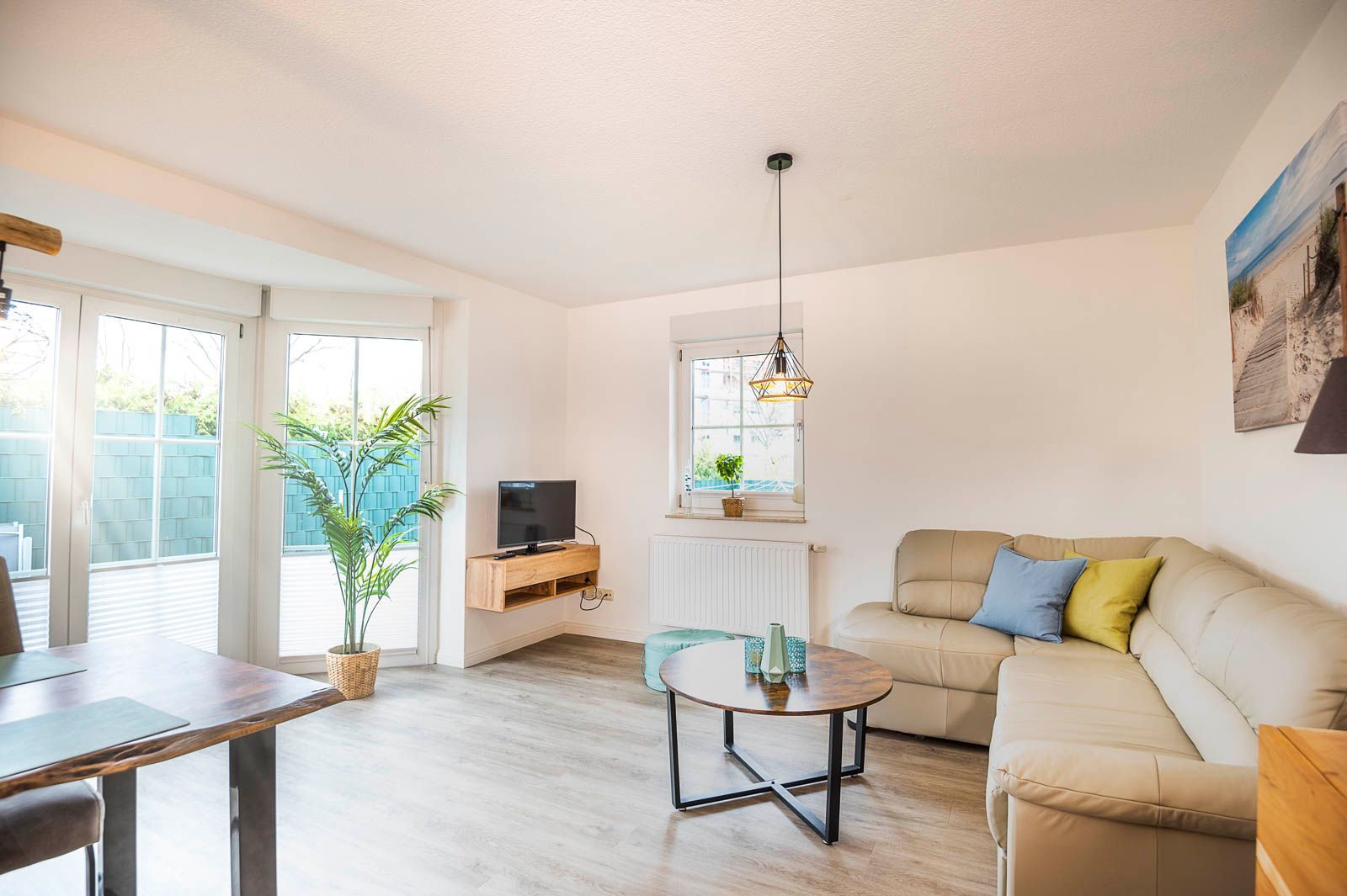 • Wohnzimmer: Bietet WLAN, einen Flat-TV und einen Esstisch für sechs Personen, neben einer Couch mit Bettfunktion.