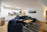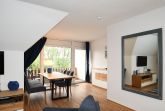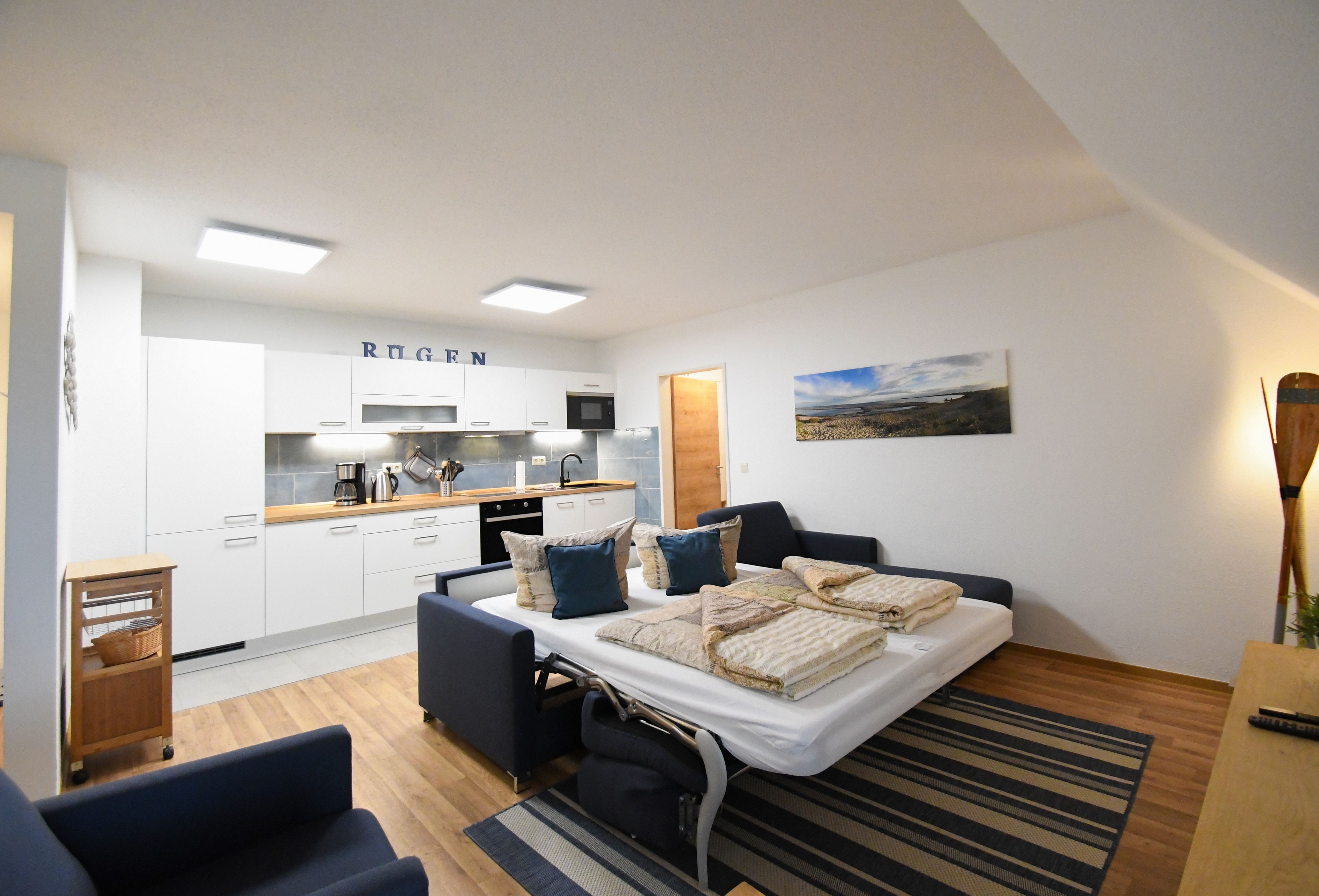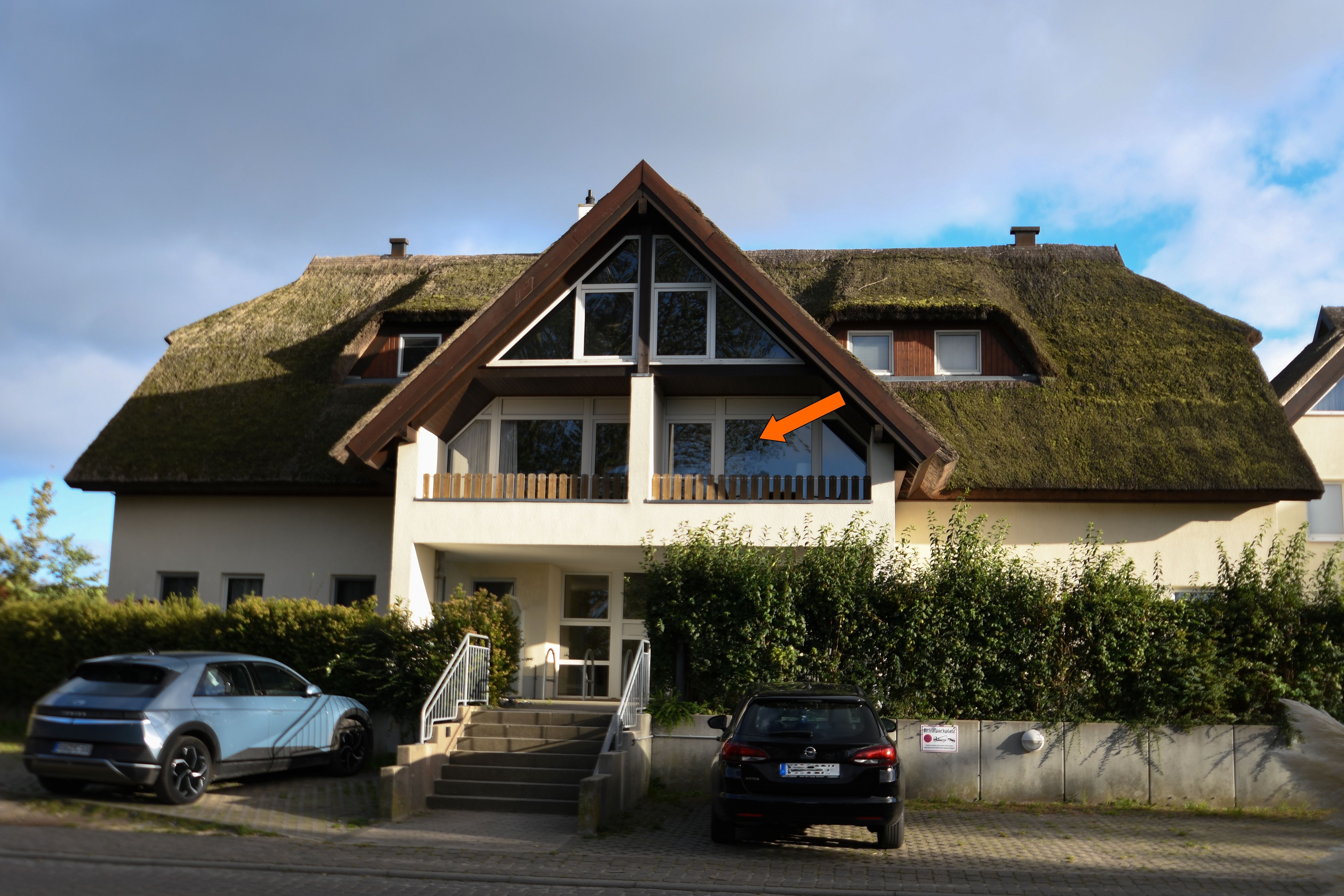Die großzügige und komfortabel eingerichtete Ferienwohnung befindet sich in der ersten Etage im linken Haus der reetgedeckten Anlage „Strandhaus Mönchgut“ in Lobbe.