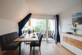 · Fensterfront zum Balkon mit unverbautem Ausblick
