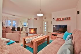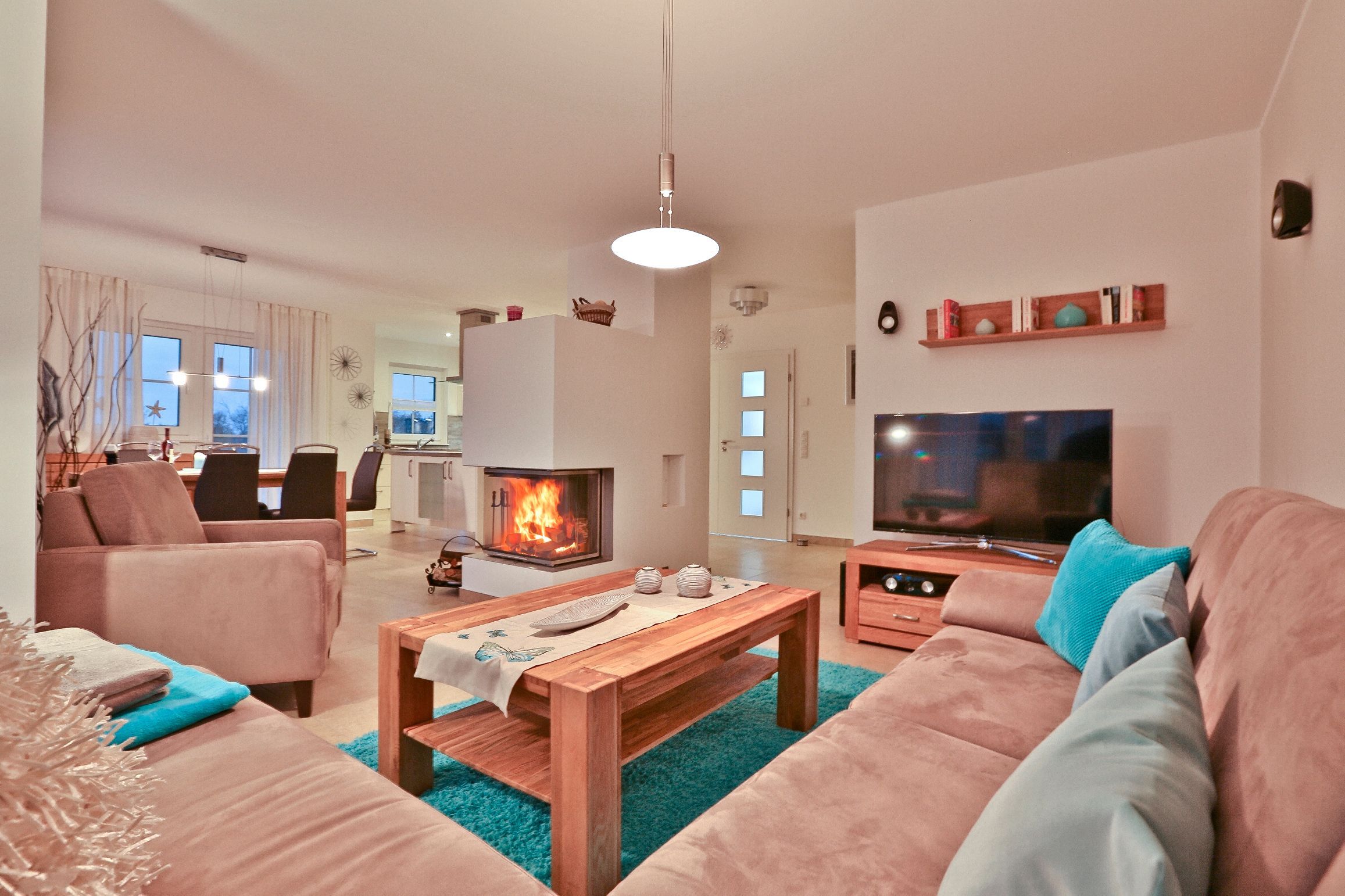Ein besonderes Highlight ist der von drei Seiten einsehbare Kamin, der an kühlen Abenden für behagliche Wärme und eine ganz besondere Atmosphäre sorgt. Bitte beachten Sie: Kaminholz ist nicht im Mietpreis enthalten Sie können es gerne mitbringen oder bequem in der näheren Umgebung erwerben.