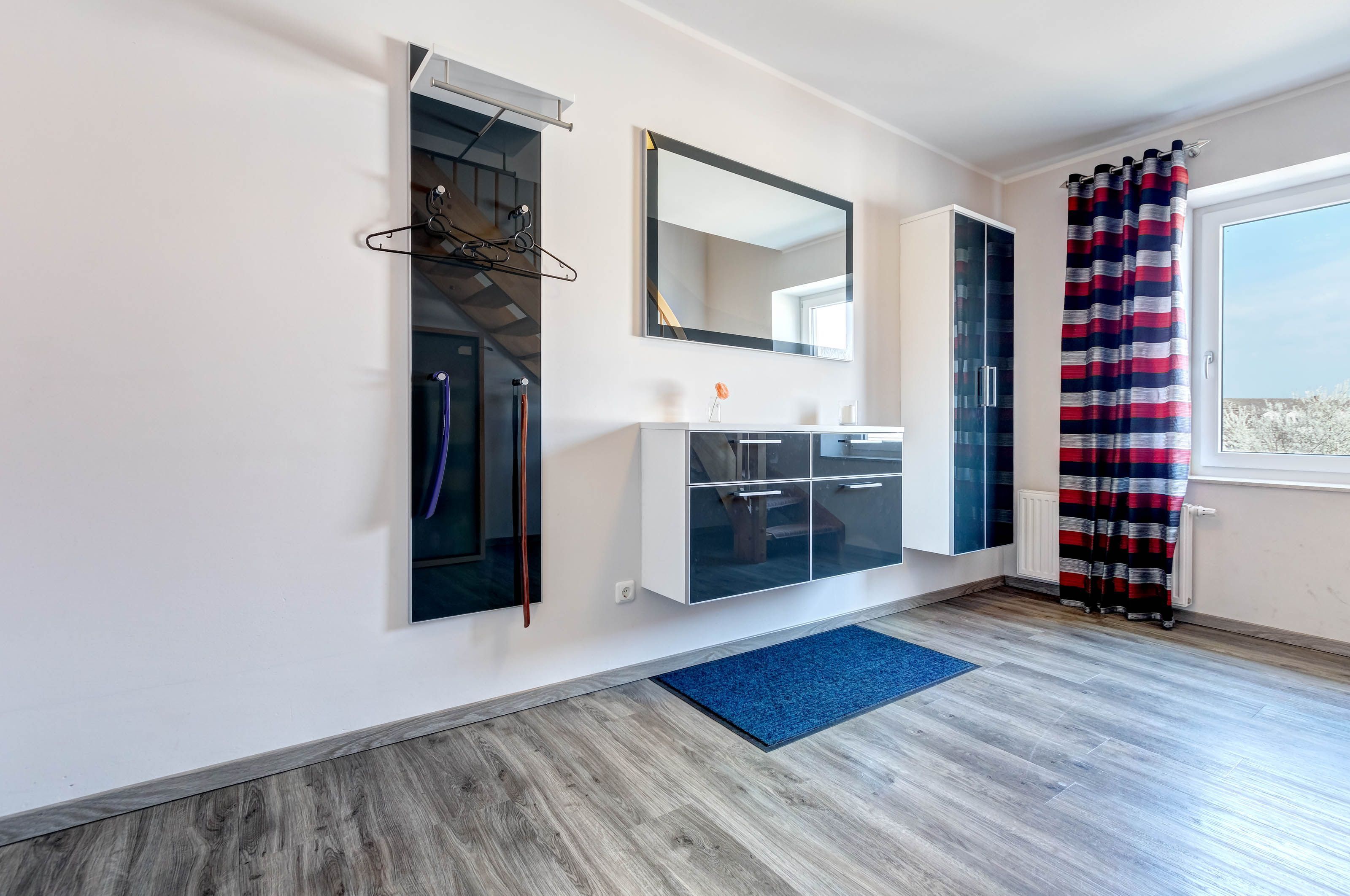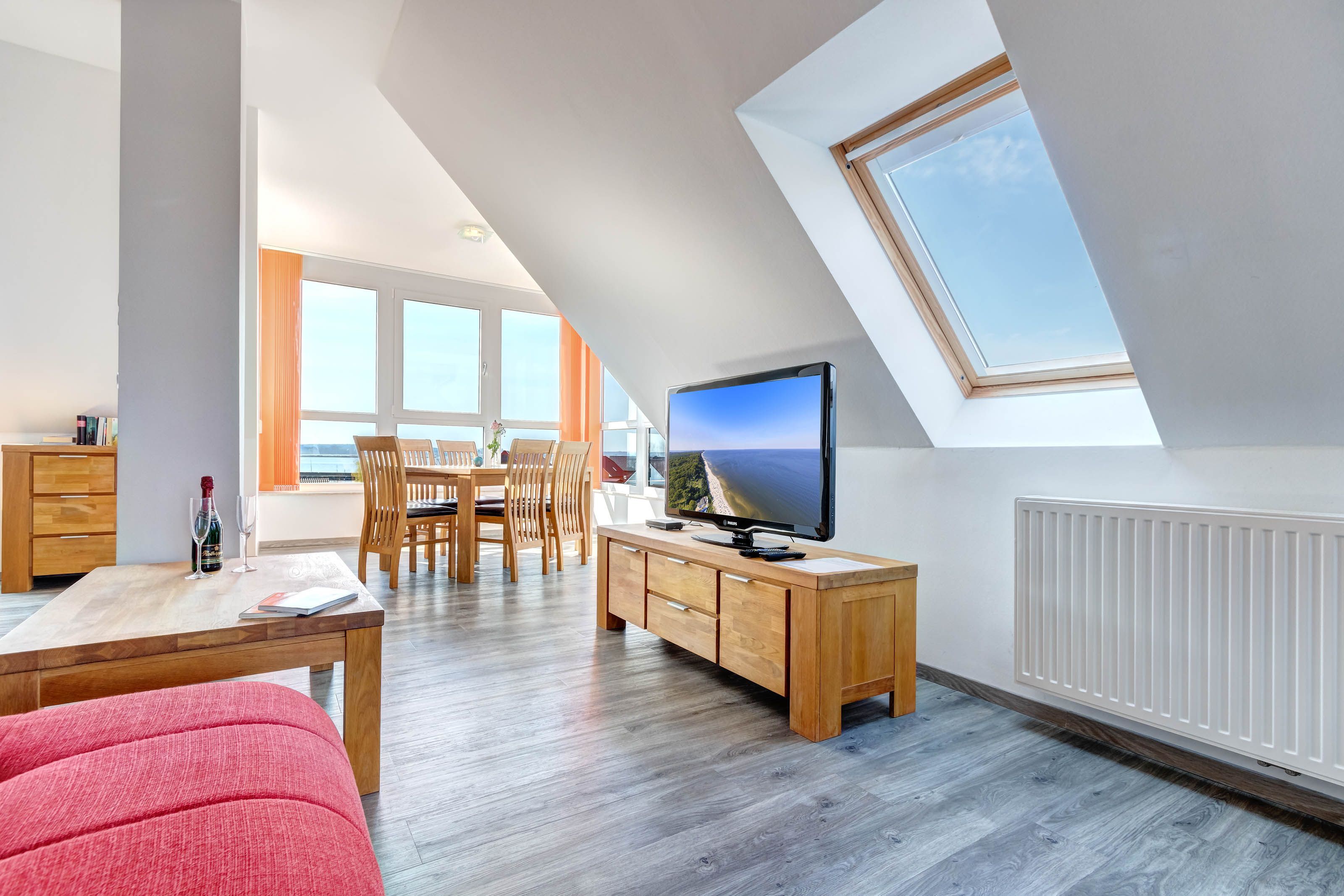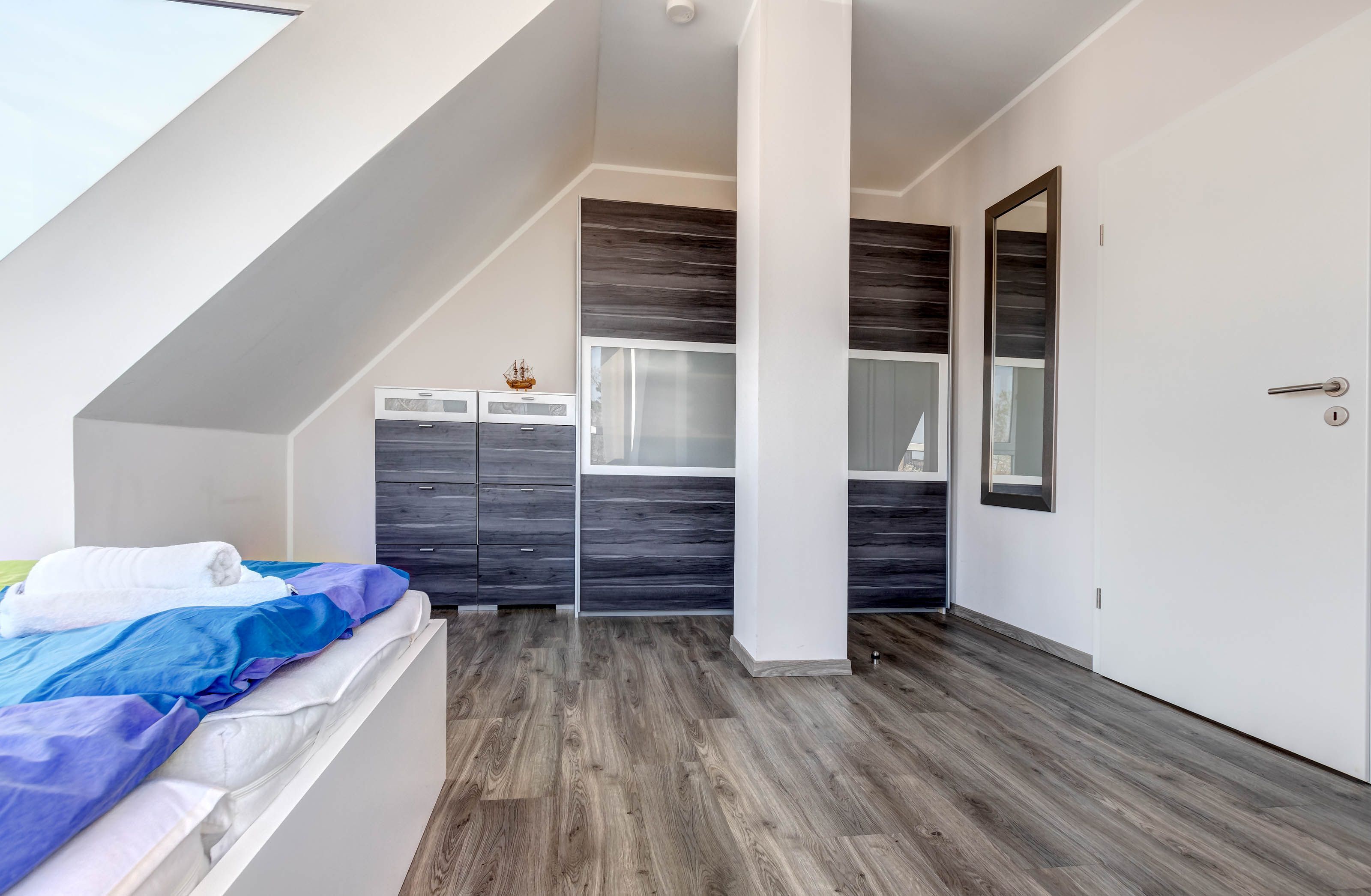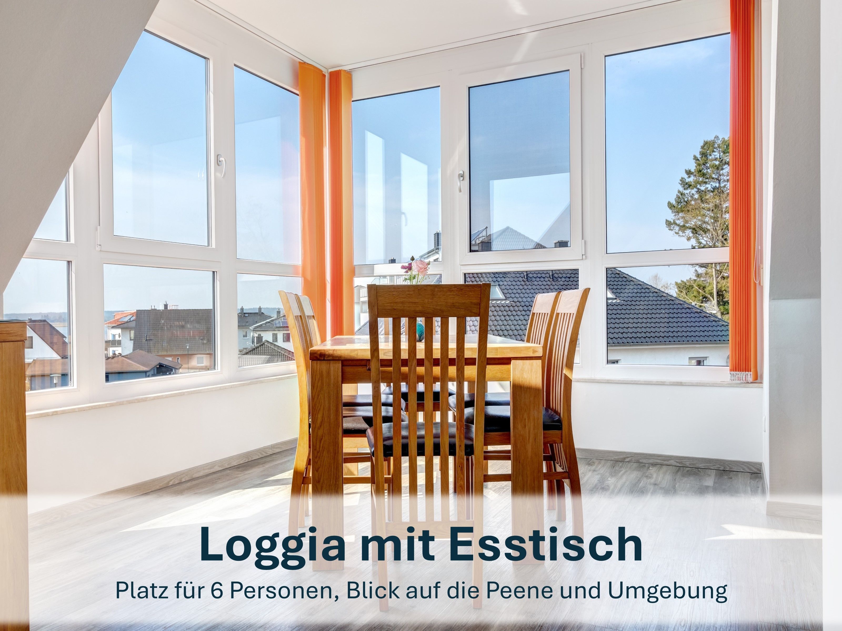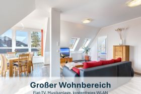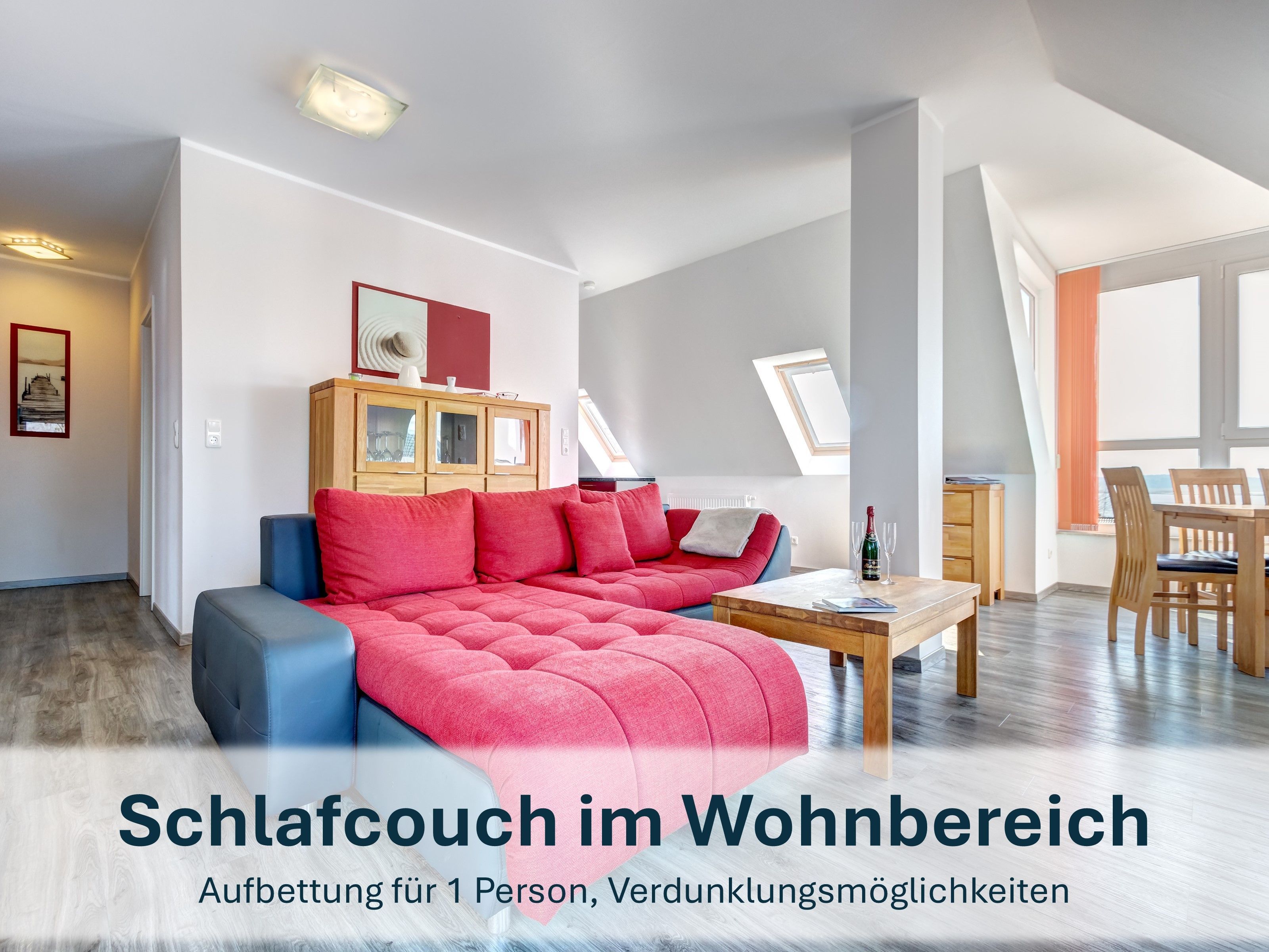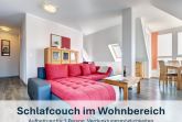 Die Maisonettewohnung erreichen Sie über den Eingangsbereich im Obergeschoss. Über eine Wendeltreppe gelangen Sie ins Dachgeschoss, wo sich der großzügige Wohnbereich mit gemütlicher Couch (ausziehbar), Flat-TV und einer einladenden Loggia mit großem Esstisch für bis zu 6 Personen befindet perfekt für gemeinsame Mahlzeiten oder Spieleabende mit Blick aufs Wasser.