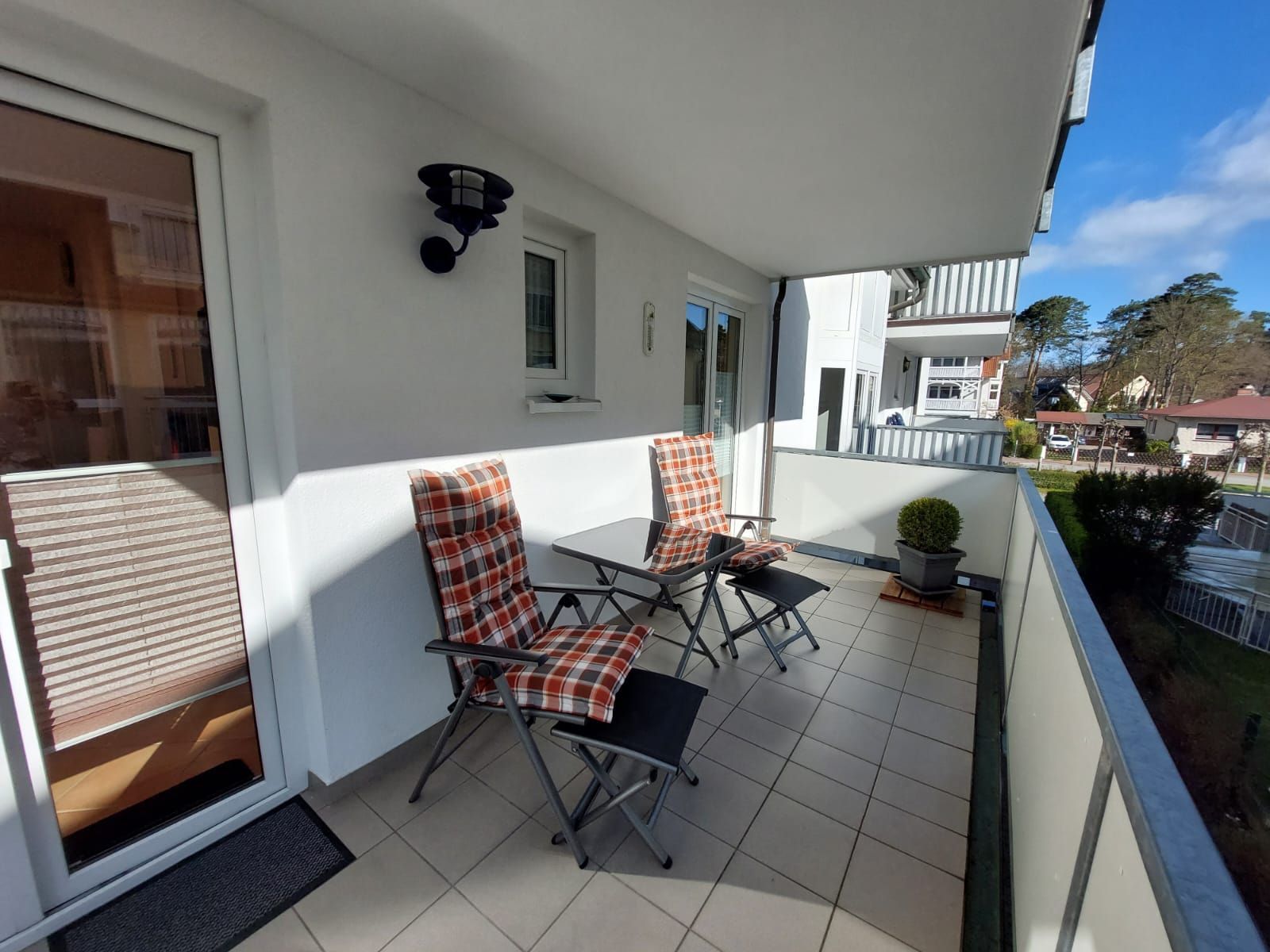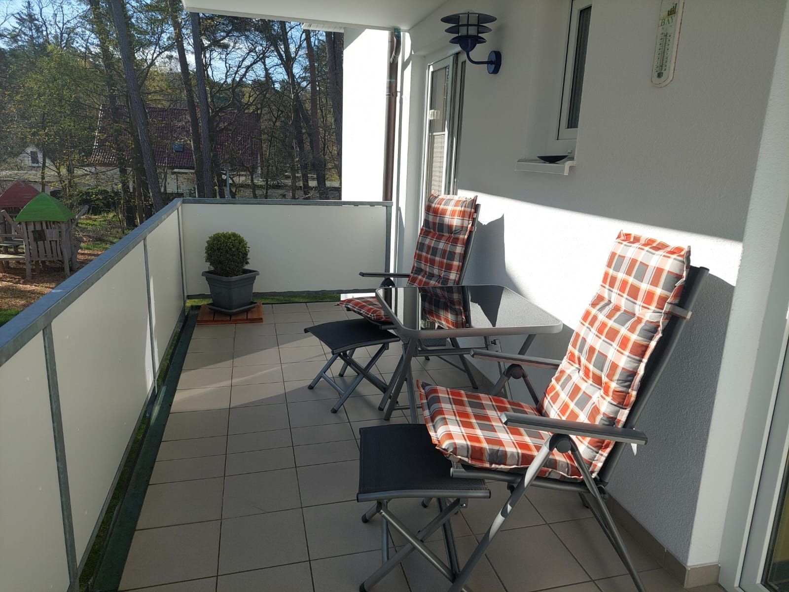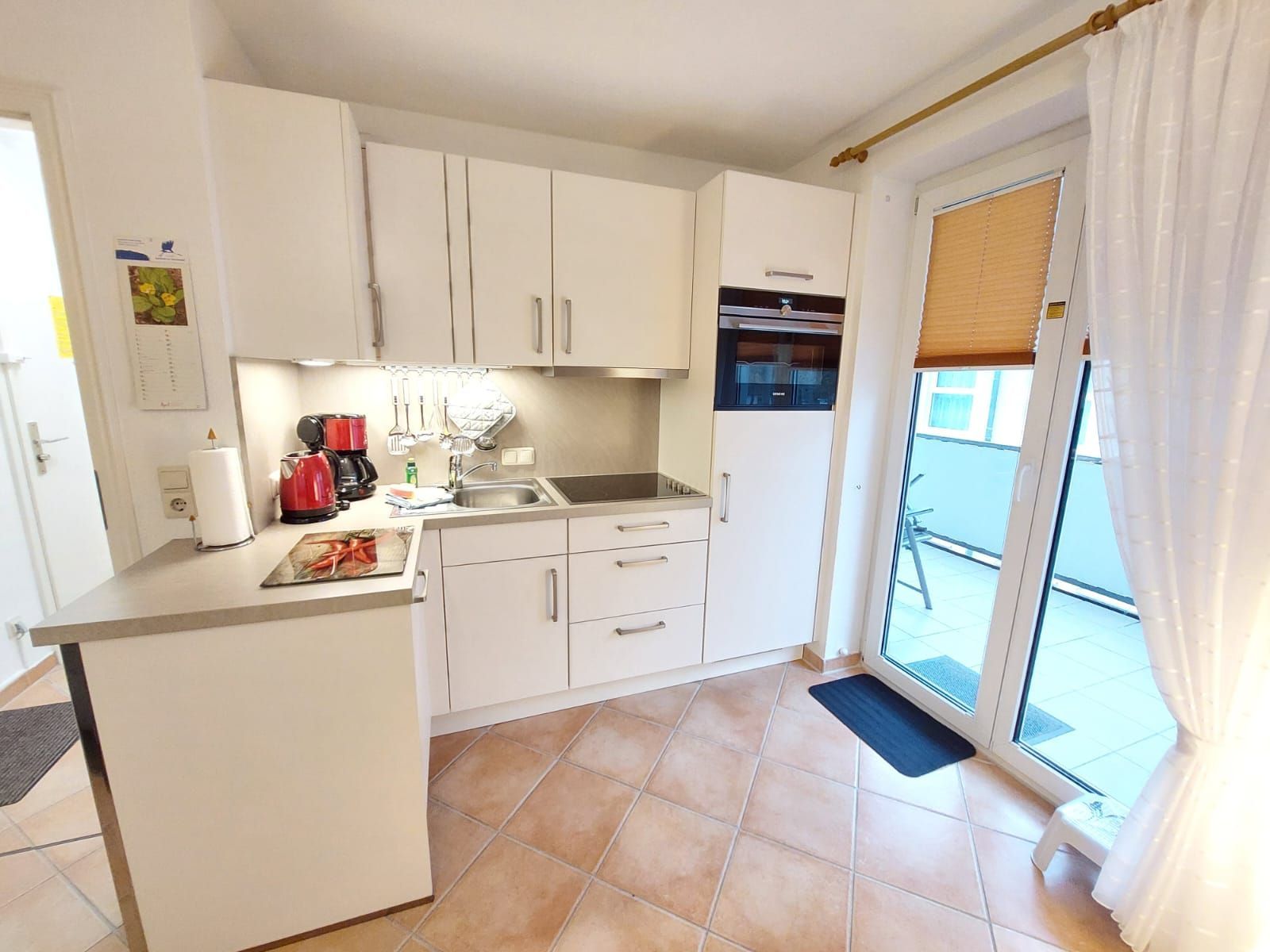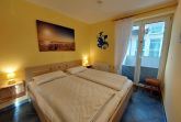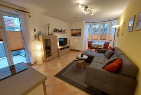 2-Zimmer-Ferienwohnung mit Balkon: 41 m², 1 WZ mit Küchenzeile und Ausgang zum Balkon (2 Balkon-Alu-Hochlehner mit Auflagen u. passende Klapphocker, ein Tisch und Sichtschutz-Balkonumrandung) , ein großer TV Flachbildschirm (HD TV für öffentlich rechtliche Sender), Fliegengitter im WZ- Fenster, Hifi Anlage mit CD, Wohnwand mit Bücherregal, kostenloses WLAN, moderne Küchenzeile mit Geschirrspüler, Cerankochfeld, Backofen, großer Kühlschrank mit Gefrierfach, 1 SZ mit Ausgang zum Balkon, Doppelbett (1.90x1.80 m), Kleiderschrank inkl. Spiegel, verdunkelte Plissees, ruhige Lage, 1 gefliestes Bad mit WC, Dusche mit flachen Einstieg, Waschplatz, beheizter Handtuchhalter, Föhn, Fenster, kleiner Flur mit Schuhschrank, Flurgarderobe, Spiegel, Ferienwohnung komplett gefliest