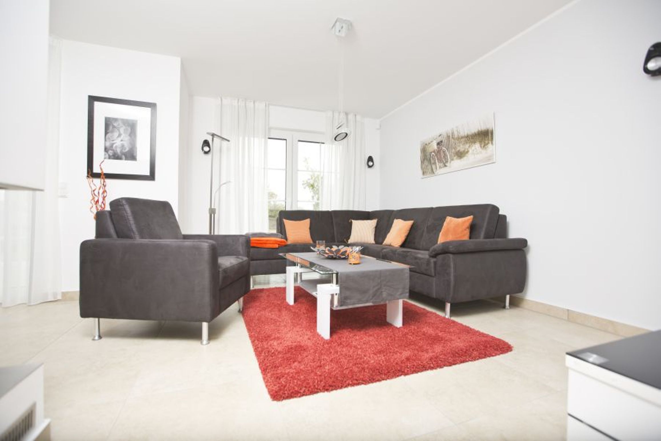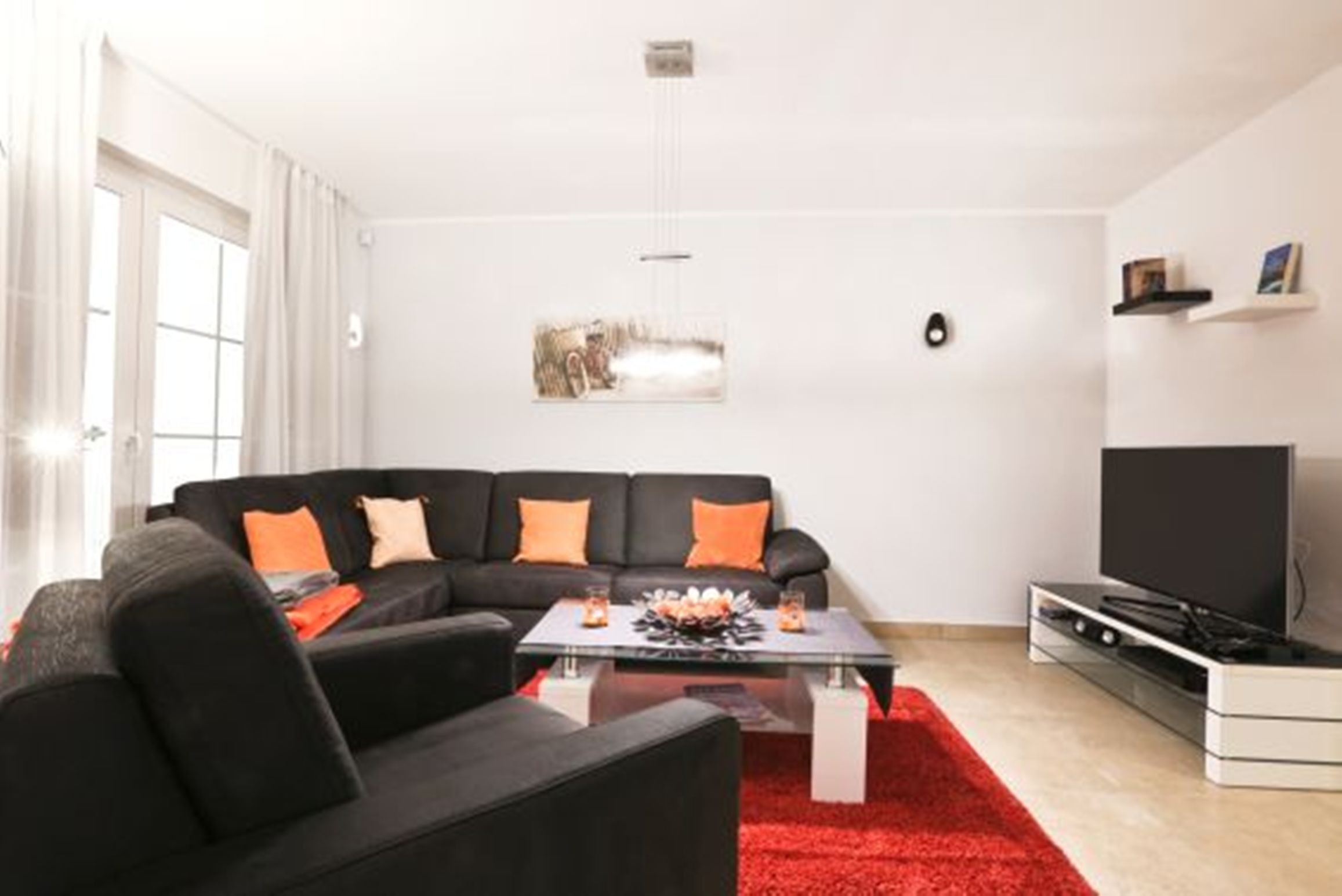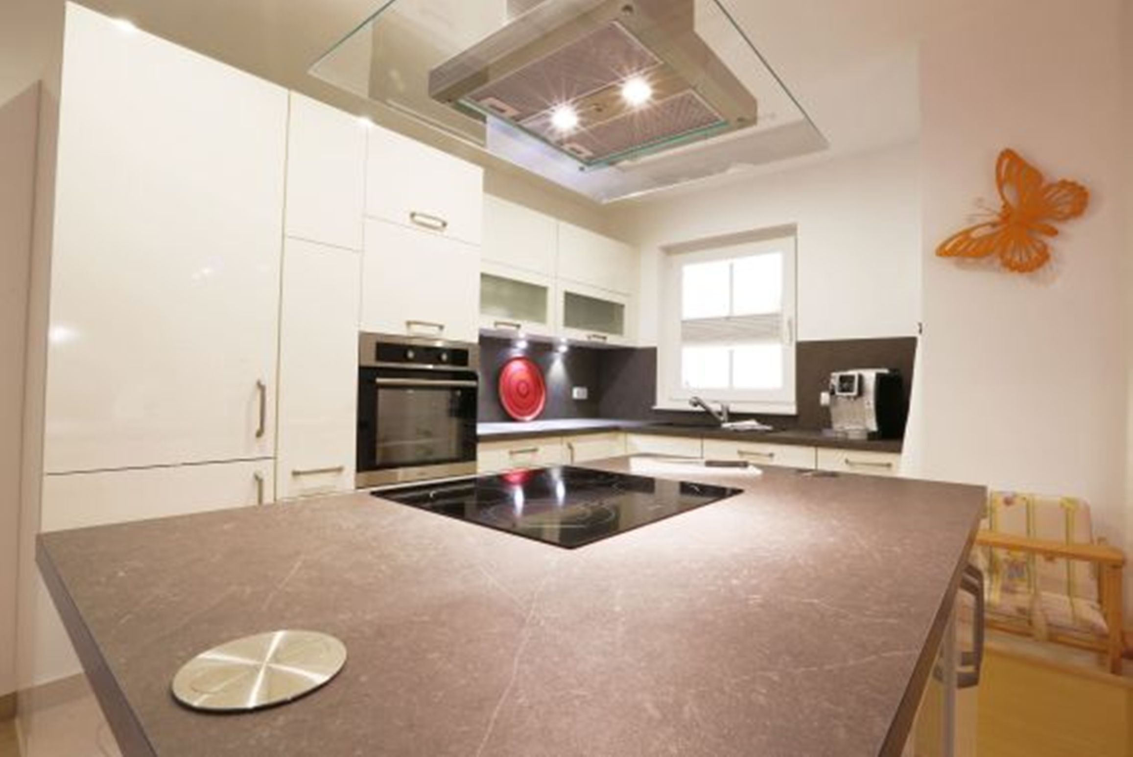 Eine Vielzahl an bodentiefen Fenstern sorgt für viel Tageslicht. Heller großzügiger Wohnbereich mit hochwertigen Möbeln und Kamin, angrenzender komplett ausgestatteter Hochglanz-Designer-Küche mit Kaffeevollautomat von DeLonghi und Kochinsel, 3 edlen Schlafzimmern mit höchst komfortablen Box-Spring-Betten (in einem Schlafzimmer befindet sich ein zusätzliches TV-Gerät), 1 Gäste-Bad mit Dusche und 1 Bad en suite mit Regendusche und finnischer Sauna.
