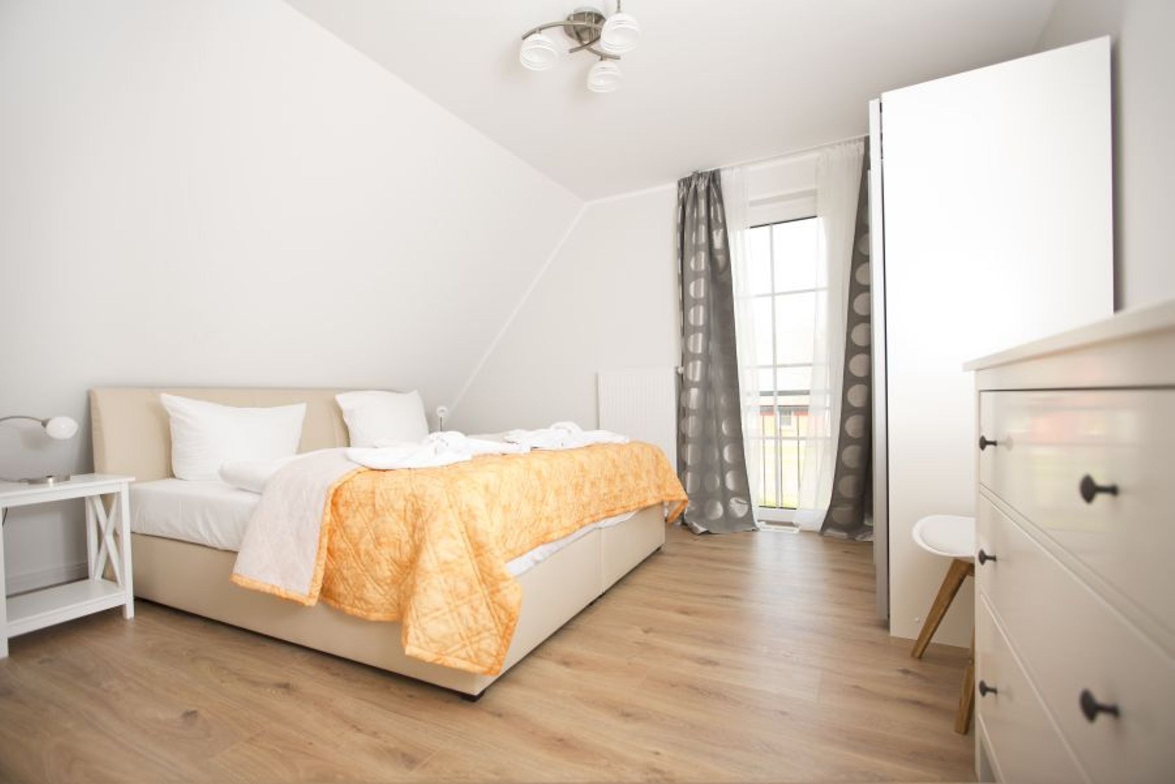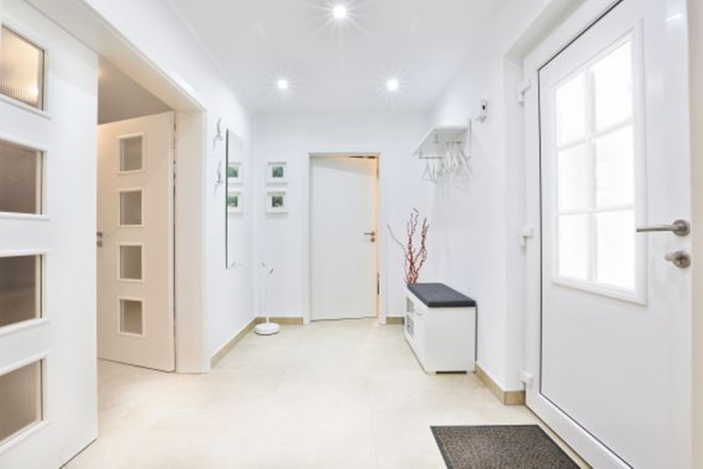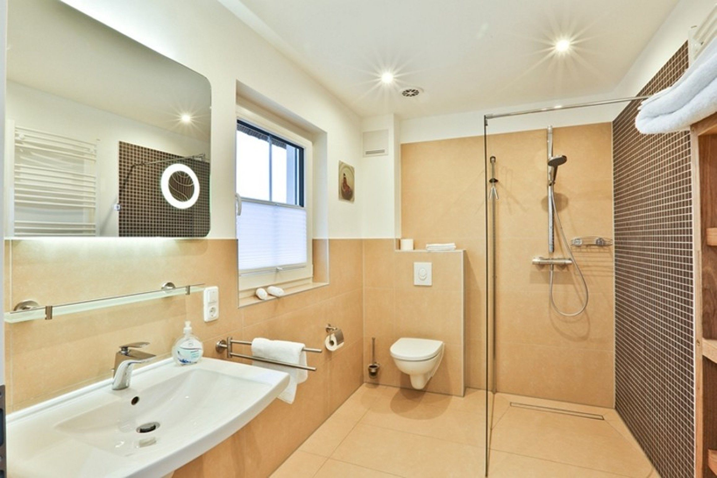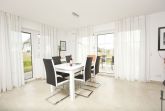 Eine Vielzahl an bodentiefen Fenstern sorgt für viel Tageslicht. Heller großzügiger Wohnbereich mit hochwertigen Möbeln und Kamin, angrenzender komplett ausgestatteter Hochglanz-Designer-Küche mit Kaffeevollautomat von DeLonghi und Kochinsel, 3 edlen Schlafzimmern mit höchst komfortablen Box-Spring-Betten (in einem Schlafzimmer befindet sich ein zusätzliches TV-Gerät), 1 Gäste-Bad mit Dusche und 1 Bad en suite mit Regendusche und finnischer Sauna.
