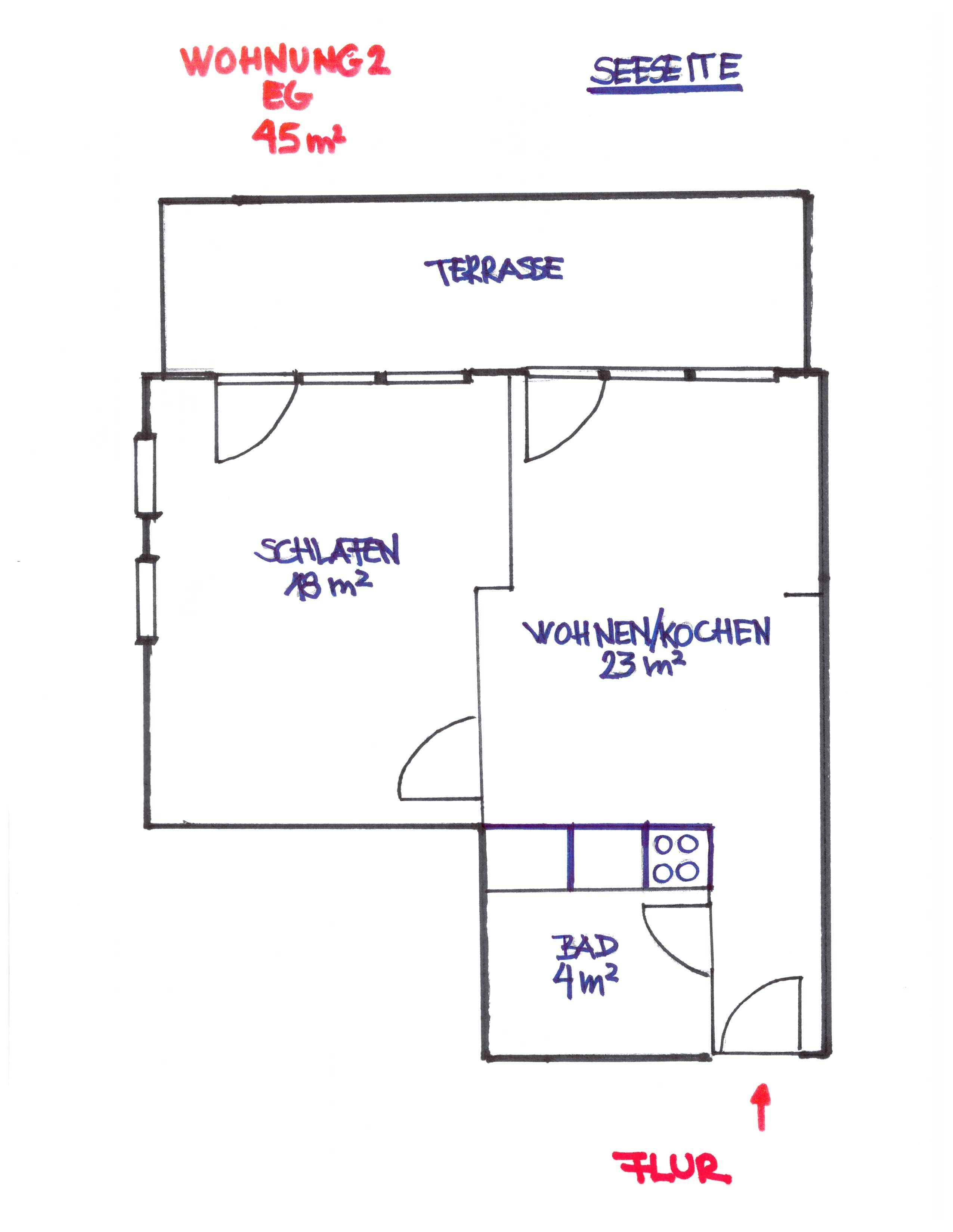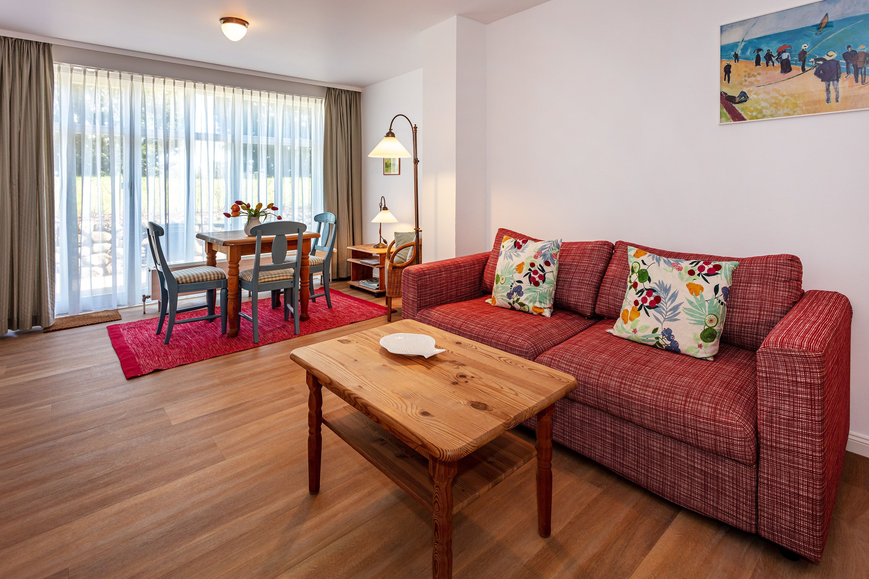 Durch die großen Terrassenfenster zur Seeseite mit Gartenblick ist die 45 qm große Wohnung hell und freundlich. Das Schlafzimmer (Doppelbett 1,80 m x 2,00 m) und der kombinierte Wohn- und Essbereich mit Küchenzeile bieten viel Platz. Das Bad wurde komplett neu renoviert.