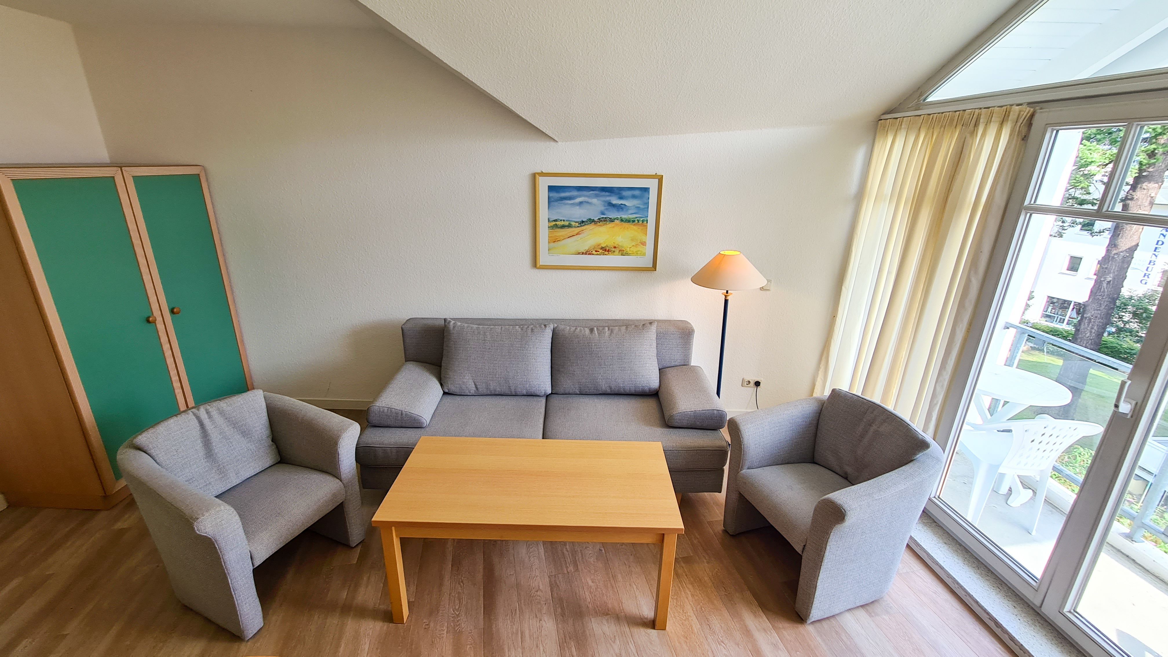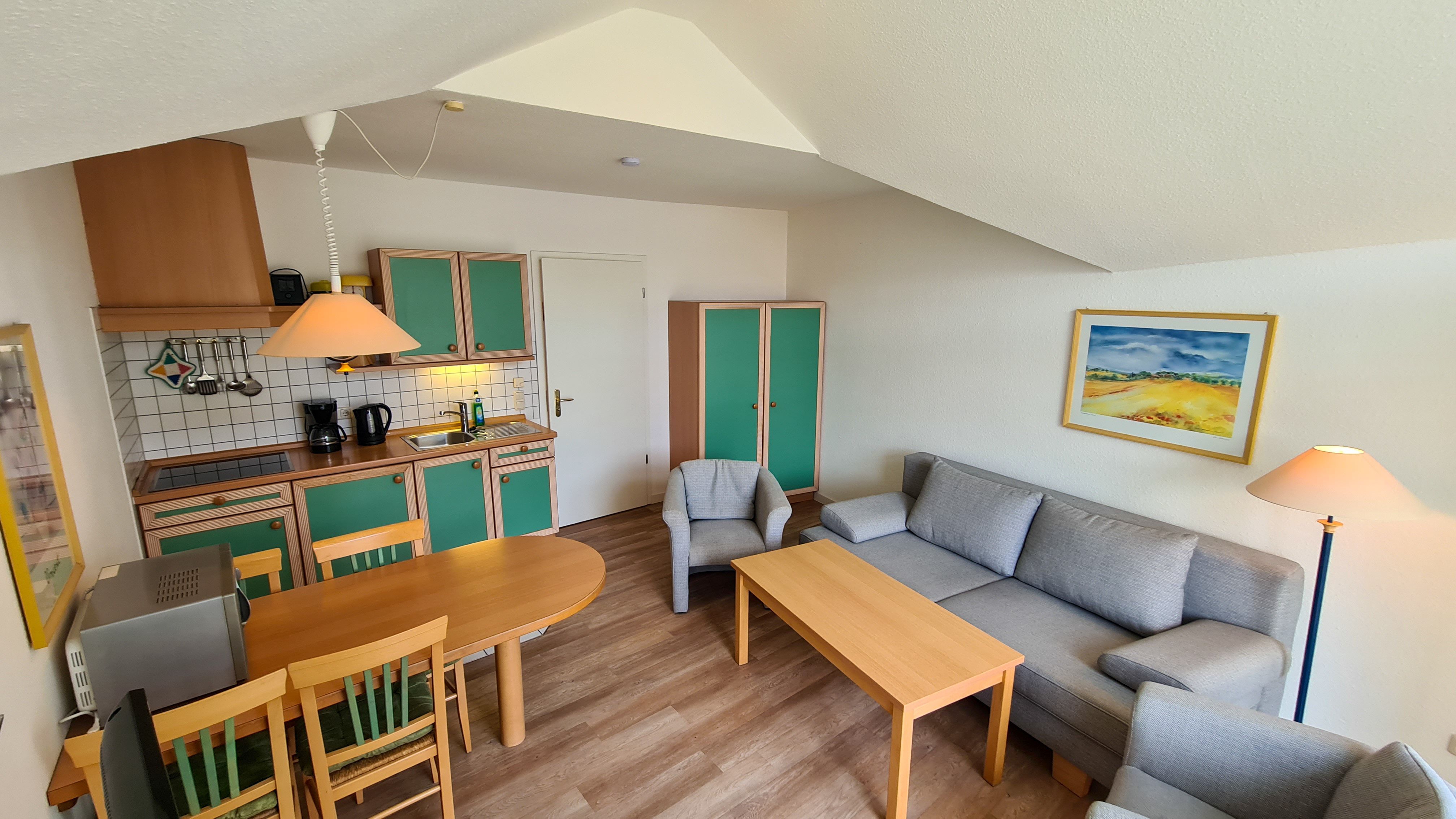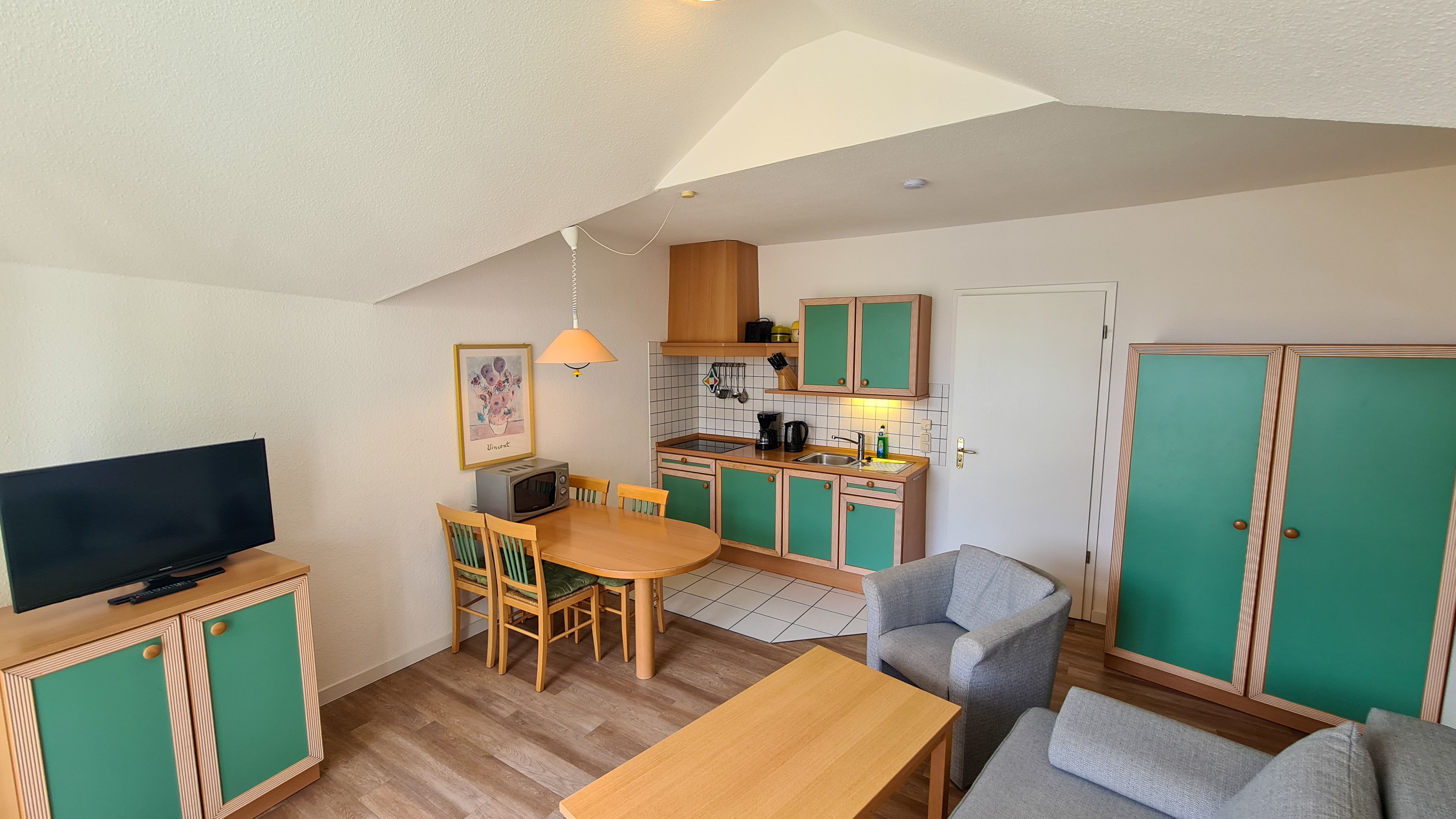 Die Wohnung verfügt über ein Schlafzimmer mit zwei Einzelbetten, Kleiderschrank und ein Wohnzimmer mit mit Sitzecke (Doppelschlafsofa) , TV und Essecke. Eine komplett eingerichtete Küchenzeile (4-Plattenherd, Kühlschrank, Mikrowelle, Kaffeemaschine, Toaster, komplett Geschirr, etc.) als auch ein Bad mit Dusche und WC gehören zur Wohnung.