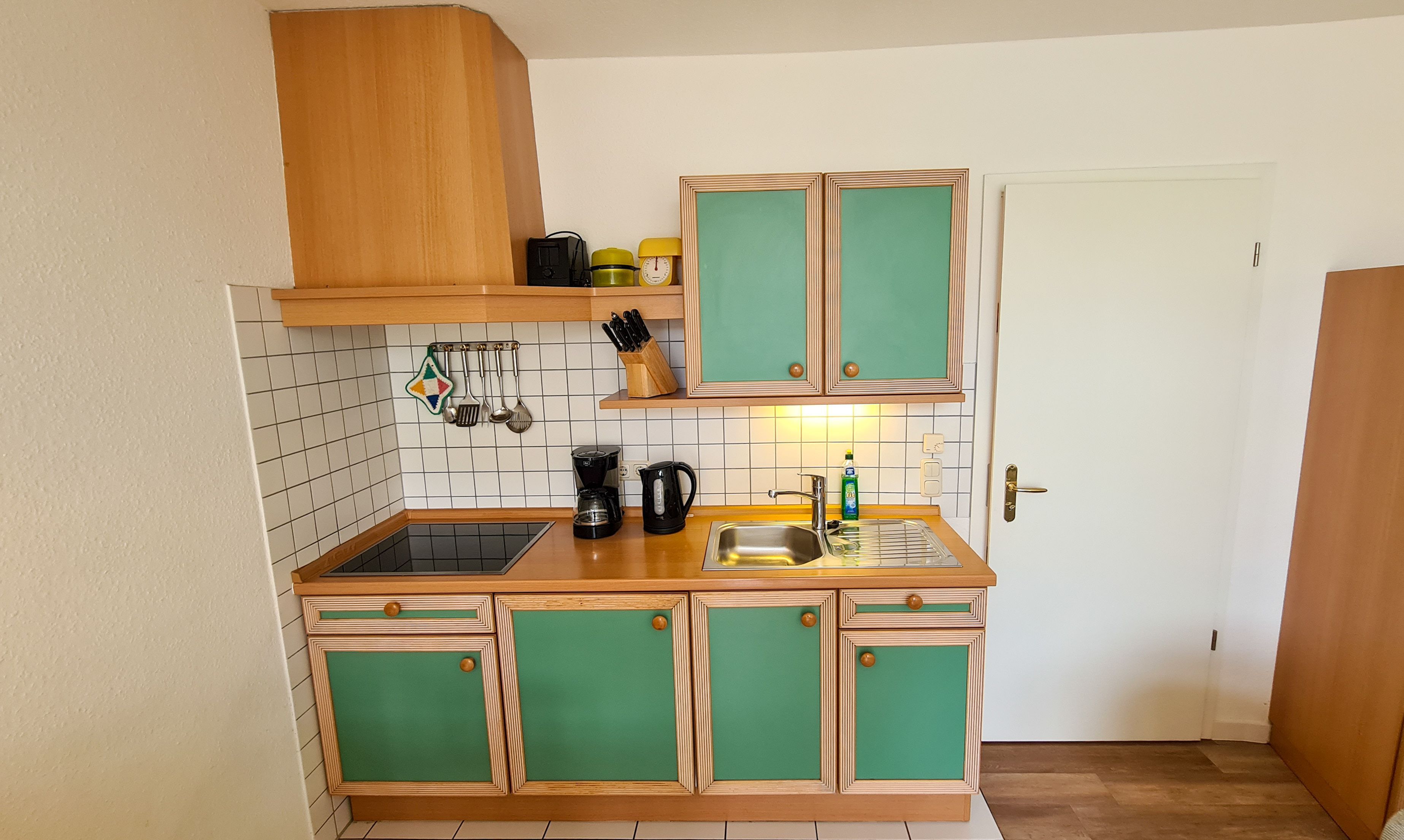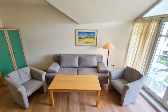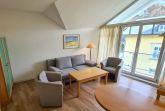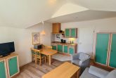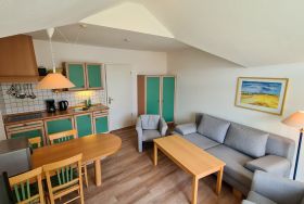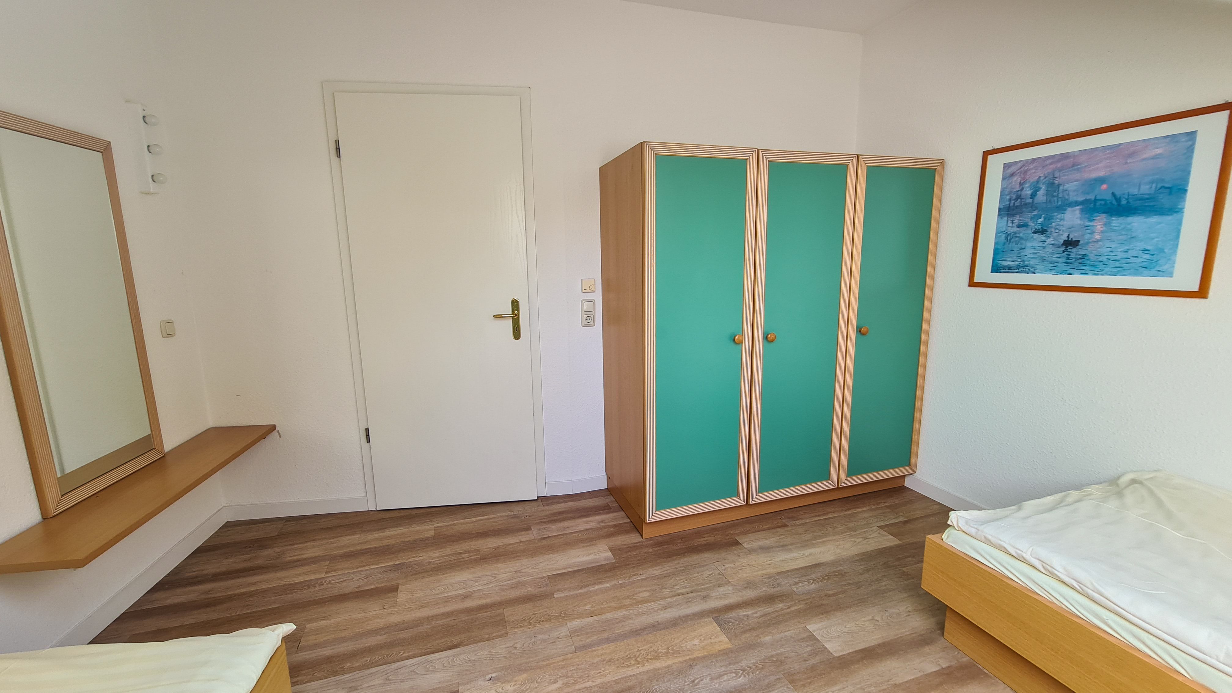 Die Wohnung verfügt über ein Schlafzimmer mit zwei Einzelbetten, Kleiderschrank und ein Wohnzimmer mit mit Sitzecke (Doppelschlafsofa) , TV und Essecke. Eine komplett eingerichtete Küchenzeile (4-Plattenherd, Kühlschrank, Mikrowelle, Kaffeemaschine, Toaster, komplett Geschirr, etc.) als auch ein Bad mit Dusche und WC gehören zur Wohnung.