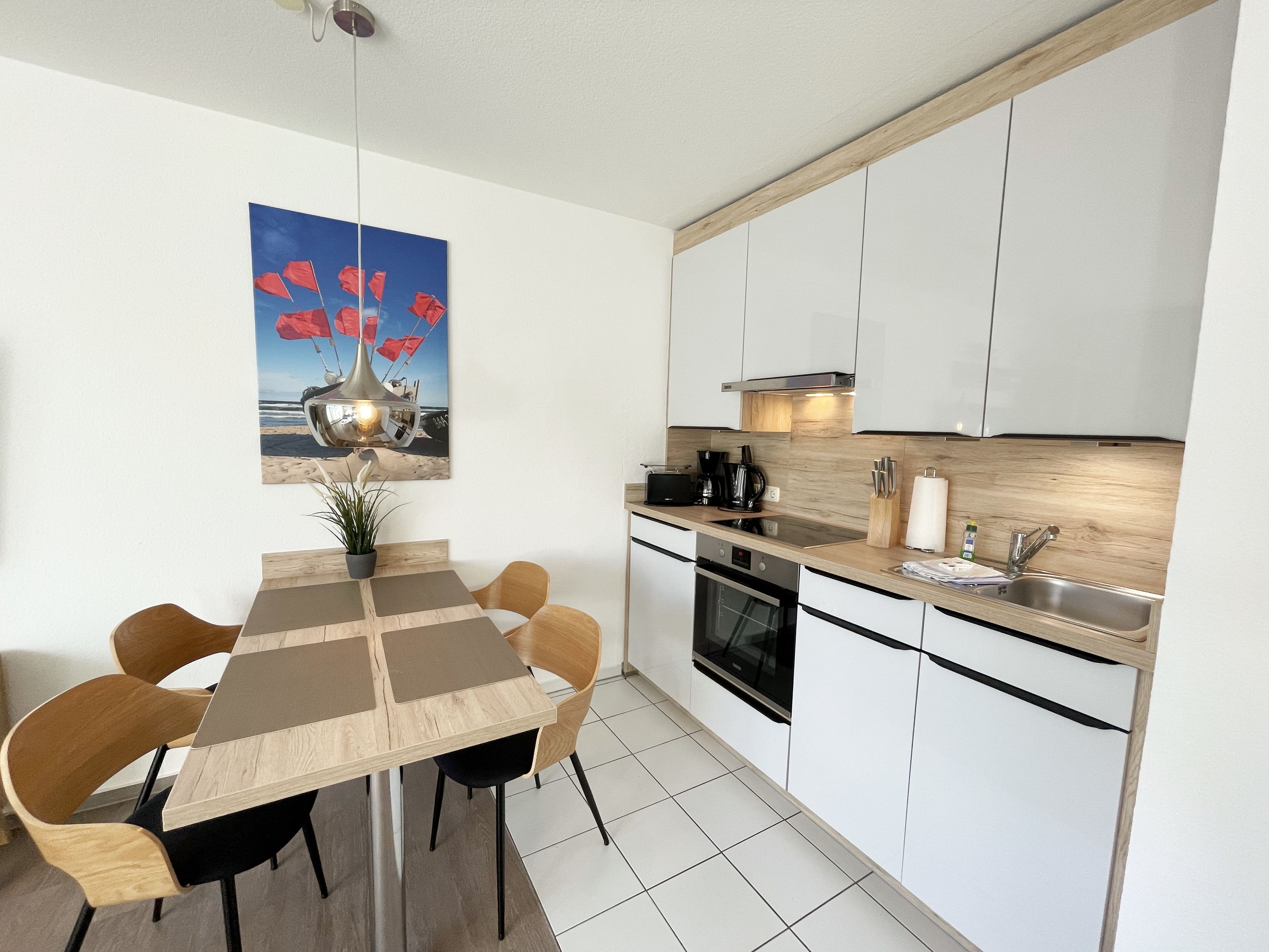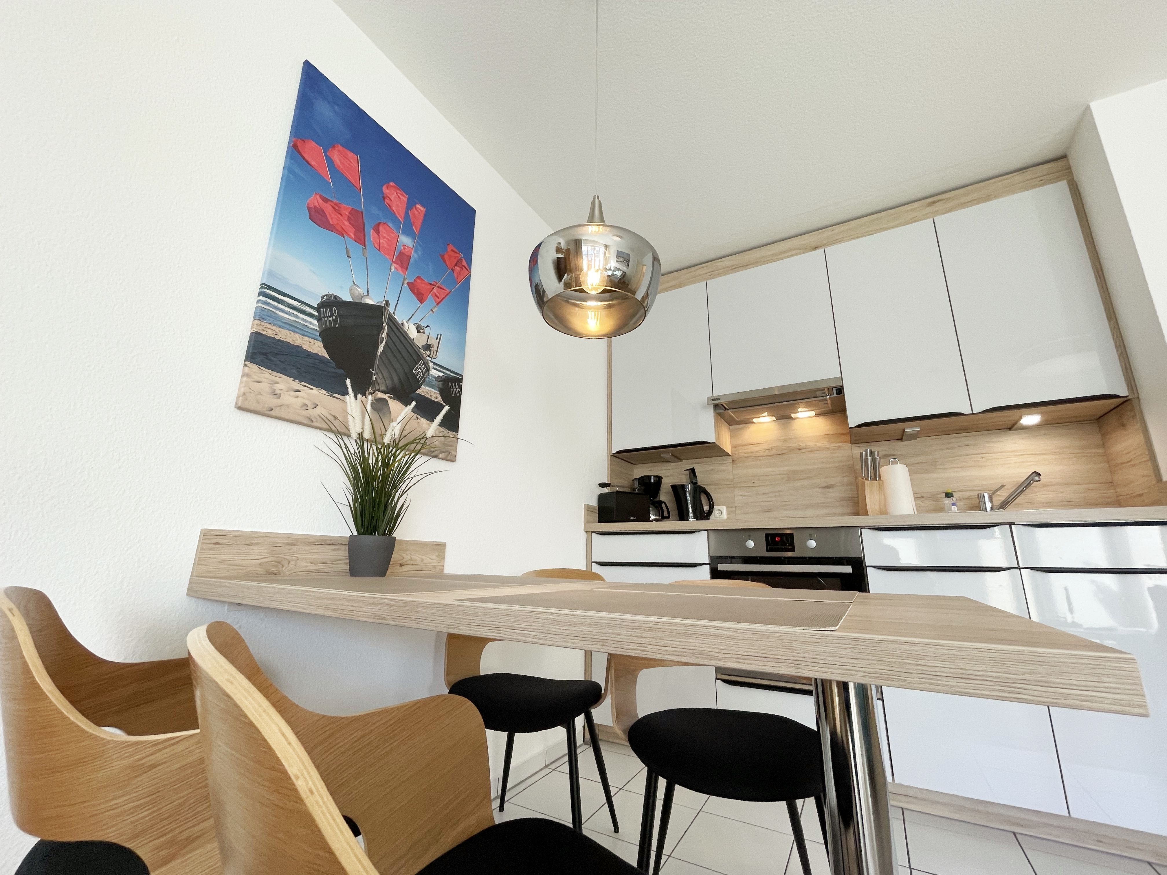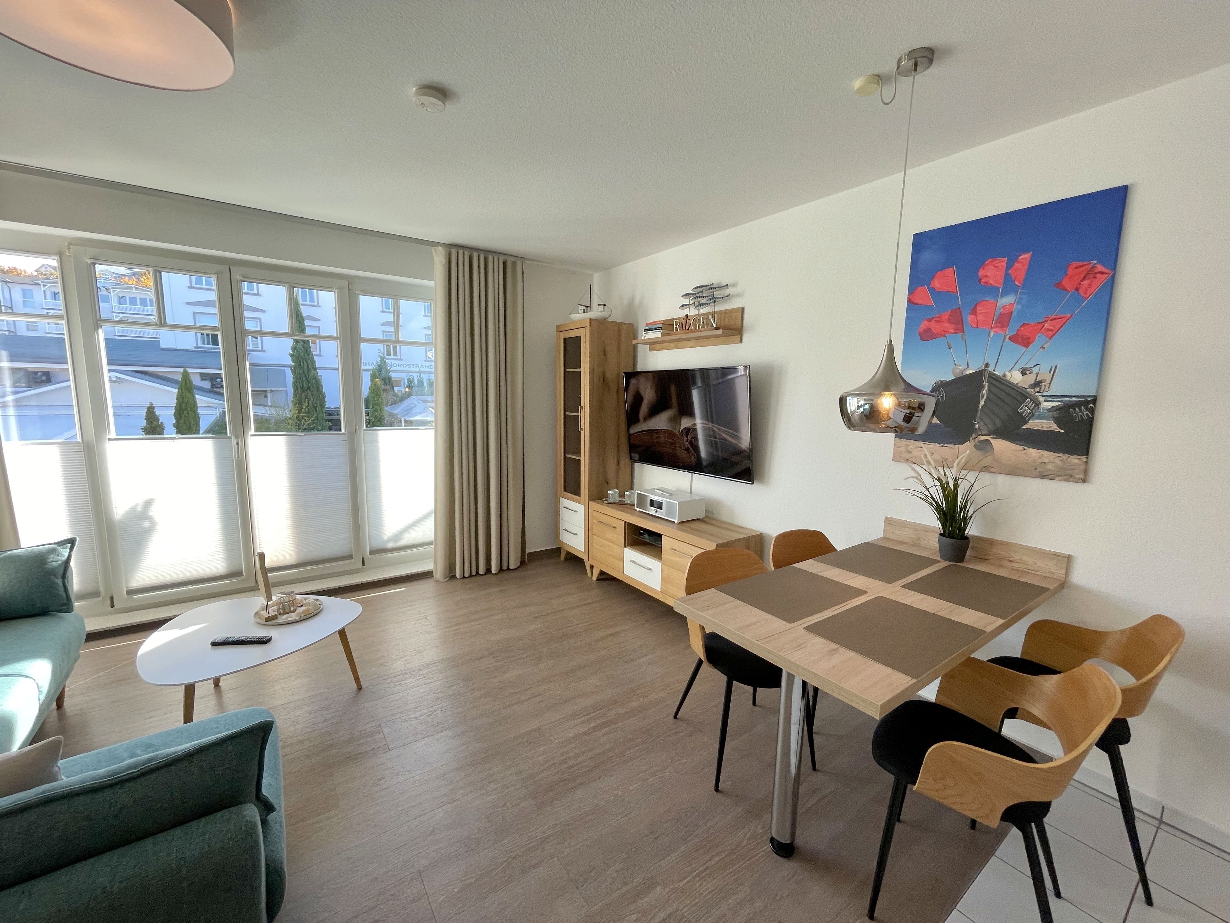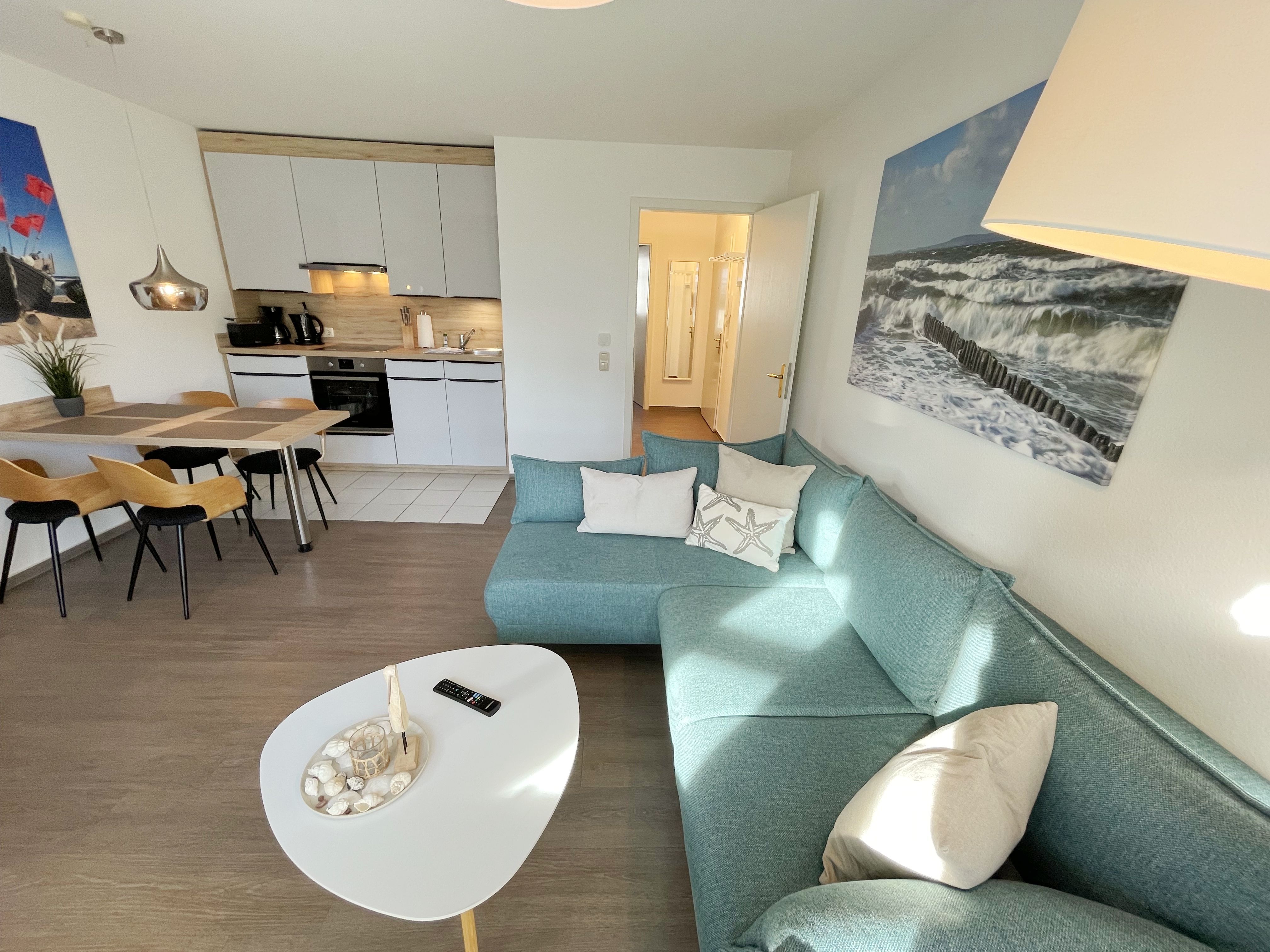 Die komfortabel und modern eingerichtete 2-Zimmer Ferienwohnung besticht mit einer durchdachten Raumaufteilung. Auf ca. 46 Quadratmetern ist diese Nichtraucherwohnung mit viel Liebe zum Detail eingerichtet. Sie bietet Ihnen Platz für max. 2 Erwachsene + 2 Kinder bis 14 Jahre. Die hochwertig eingerichtete Einbauküche ist ausgestattet mit einem Geschirrspüler, einen Kühlschrank mit Eisfach, einen Backofen, ein 4-Zonen-Induktionskochfeld, einer Kaffeemaschine, einen Toaster, einen Wasserkocher und diversen Küchenutensilien. Der helle Wohnbereich wird bestimmt durch seine bodentiefen Fenster (kindersicher abschließbar), die einen weitläufigen Blick auf das Treiben in der Strandstraße zulassen. Hier steht für Sie eine Schlafcouch (Aufbettungsmöglichkeit für 2 Personen, 1,30m x 2,00m), Couchtisch, ein TV-Board, ein Vitrinenschrank und eine Stehlampe bereit. Auf einen Smart-LED-TV im Wohnraum und einen Internetanschluß (WLAN) müssen Sie im Urlaub nicht verzichten. Ein Blu-Ray-Player sowie eine Mini-Stereo-Anlage mit Bluetooth und USB-Anschluss und inkl. Internet-Radio (DAB) runden den Wohnbereich technisch ab. Das Schlafzimmer ist ausgestattet mit einem bequemen Boxspringbett (1,80m x 2,00m), Nachttischablagen, einem geräumigen Kleiderschrank und Verdunkelungsvorhängen. Somit steht einem erholsamen Schlaf hier nichts im Wege! Im innenliegenden Bad sorgen eine ebenerdige Dusche, ein WC, ein Fön sowie ein Waschplatz mit Unterschrank für Ihr Wohlbefinden. Hier finden Sie zusätzlich, wie auch in allen anderen Räumen, eine Fußbodenheizung und hochwertige Bodenbeläge vor. Auf dem kleinen Balkon (Süd/Osten), ausgestattet mit einem Tisch und zwei Stühlen mit Polsterauflagen, können Sie jederzeit die frische Ostseeluft geniessen. Ein Haustier ist gegen eine Gebühr bei uns herzlich willkommen! Im Gemeinschaftskeller des Hauses können Sie gegen einen Aufpreis eine Waschmaschine und einen Trockner nutzen. Hier können Sie auch Ihre mitgebrachten Fahrräder unterstellen. Ihr PKW kann in der angrenzenden Tiefgarage (Nr. 20a / Einfahrtshöhe 2,00m) kostenfrei geparkt werden. Die Erstausstattung eines Wäschepaketes (komplette Bettwäsche, 1 Duschhandtuch, 2 kleine Handtücher, 2 Geschirrhandtücher) können Sie bis 14 Tage vor Anreise gegen einen Aufpreis dazu buchen oder durch eigene ergänzen.