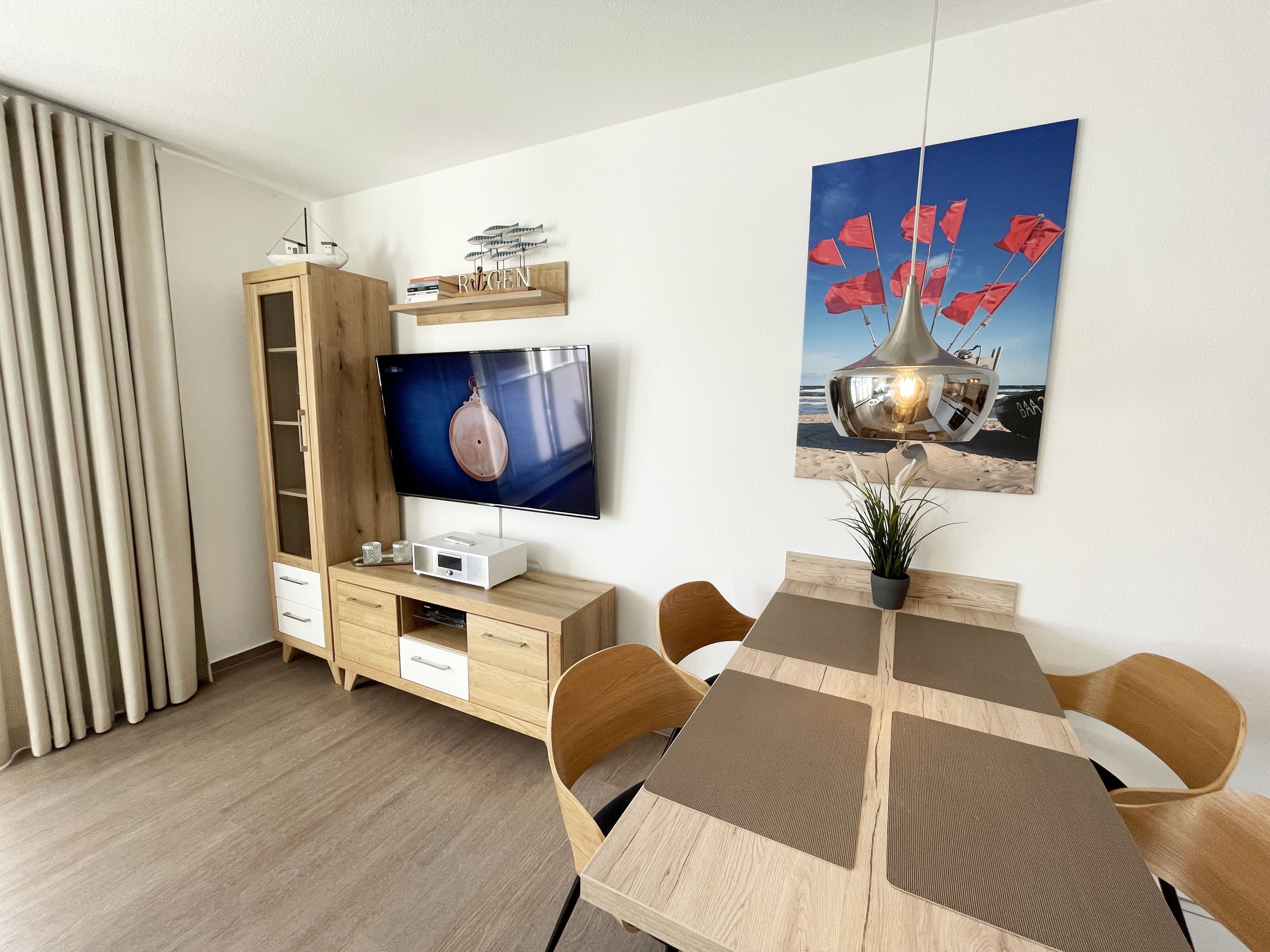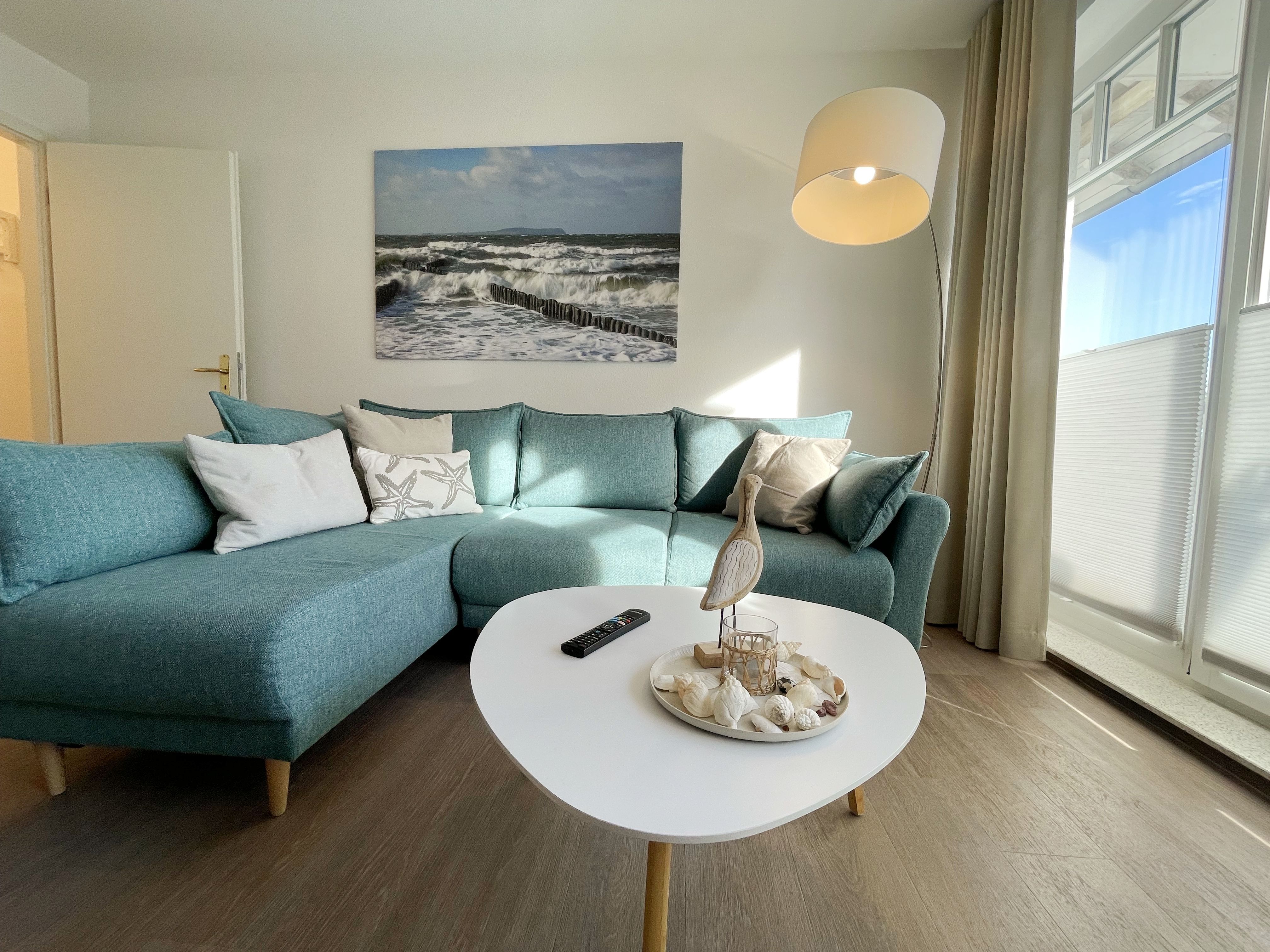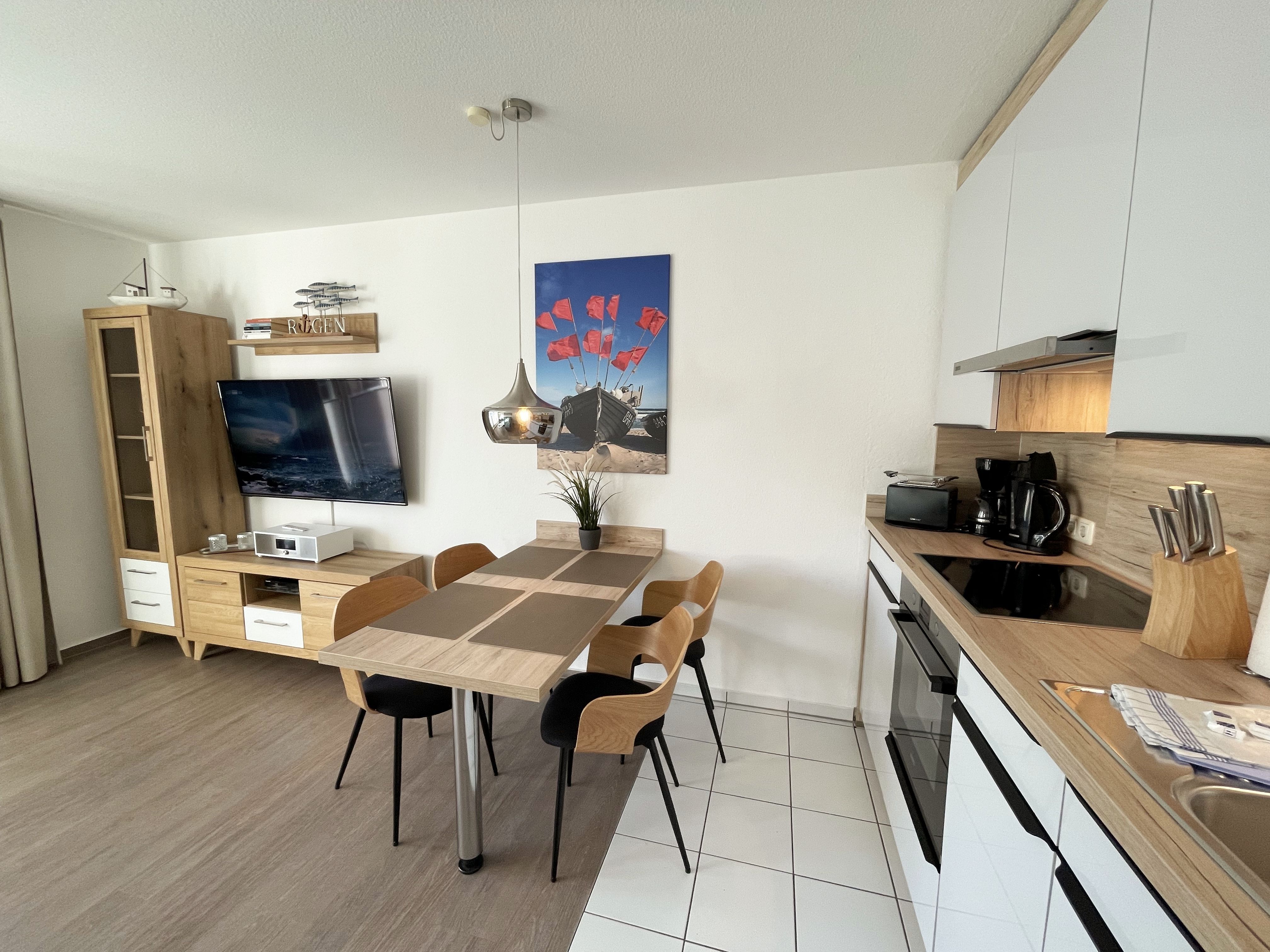 Die komfortabel und modern eingerichtete 2-Zimmer Ferienwohnung besticht mit einer durchdachten Raumaufteilung. Auf ca. 46 Quadratmetern ist diese Nichtraucherwohnung mit viel Liebe zum Detail eingerichtet. Sie bietet Ihnen Platz für max. 2 Erwachsene + 2 Kinder bis 14 Jahre. Die hochwertig eingerichtete Einbauküche ist ausgestattet mit einem Geschirrspüler, einen Kühlschrank mit Eisfach, einen Backofen, ein 4-Zonen-Induktionskochfeld, einer Kaffeemaschine, einen Toaster, einen Wasserkocher und diversen Küchenutensilien. Der helle Wohnbereich wird bestimmt durch seine bodentiefen Fenster (kindersicher abschließbar), die einen weitläufigen Blick auf das Treiben in der Strandstraße zulassen. Hier steht für Sie eine Schlafcouch (Aufbettungsmöglichkeit für 2 Personen, 1,30m x 2,00m), Couchtisch, ein TV-Board, ein Vitrinenschrank und eine Stehlampe bereit. Auf einen Smart-LED-TV im Wohnraum und einen Internetanschluß (WLAN) müssen Sie im Urlaub nicht verzichten. Ein Blu-Ray-Player sowie eine Mini-Stereo-Anlage mit Bluetooth und USB-Anschluss und inkl. Internet-Radio (DAB) runden den Wohnbereich technisch ab. Das Schlafzimmer ist ausgestattet mit einem bequemen Boxspringbett (1,80m x 2,00m), Nachttischablagen, einem geräumigen Kleiderschrank und Verdunkelungsvorhängen. Somit steht einem erholsamen Schlaf hier nichts im Wege! Im innenliegenden Bad sorgen eine ebenerdige Dusche, ein WC, ein Fön sowie ein Waschplatz mit Unterschrank für Ihr Wohlbefinden. Hier finden Sie zusätzlich, wie auch in allen anderen Räumen, eine Fußbodenheizung und hochwertige Bodenbeläge vor. Auf dem kleinen Balkon (Süd/Osten), ausgestattet mit einem Tisch und zwei Stühlen mit Polsterauflagen, können Sie jederzeit die frische Ostseeluft geniessen. Ein Haustier ist gegen eine Gebühr bei uns herzlich willkommen! Im Gemeinschaftskeller des Hauses können Sie gegen einen Aufpreis eine Waschmaschine und einen Trockner nutzen. Hier können Sie auch Ihre mitgebrachten Fahrräder unterstellen. Ihr PKW kann in der angrenzenden Tiefgarage (Nr. 20a / Einfahrtshöhe 2,00m) kostenfrei geparkt werden. Die Erstausstattung eines Wäschepaketes (komplette Bettwäsche, 1 Duschhandtuch, 2 kleine Handtücher, 2 Geschirrhandtücher) können Sie bis 14 Tage vor Anreise gegen einen Aufpreis dazu buchen oder durch eigene ergänzen.