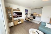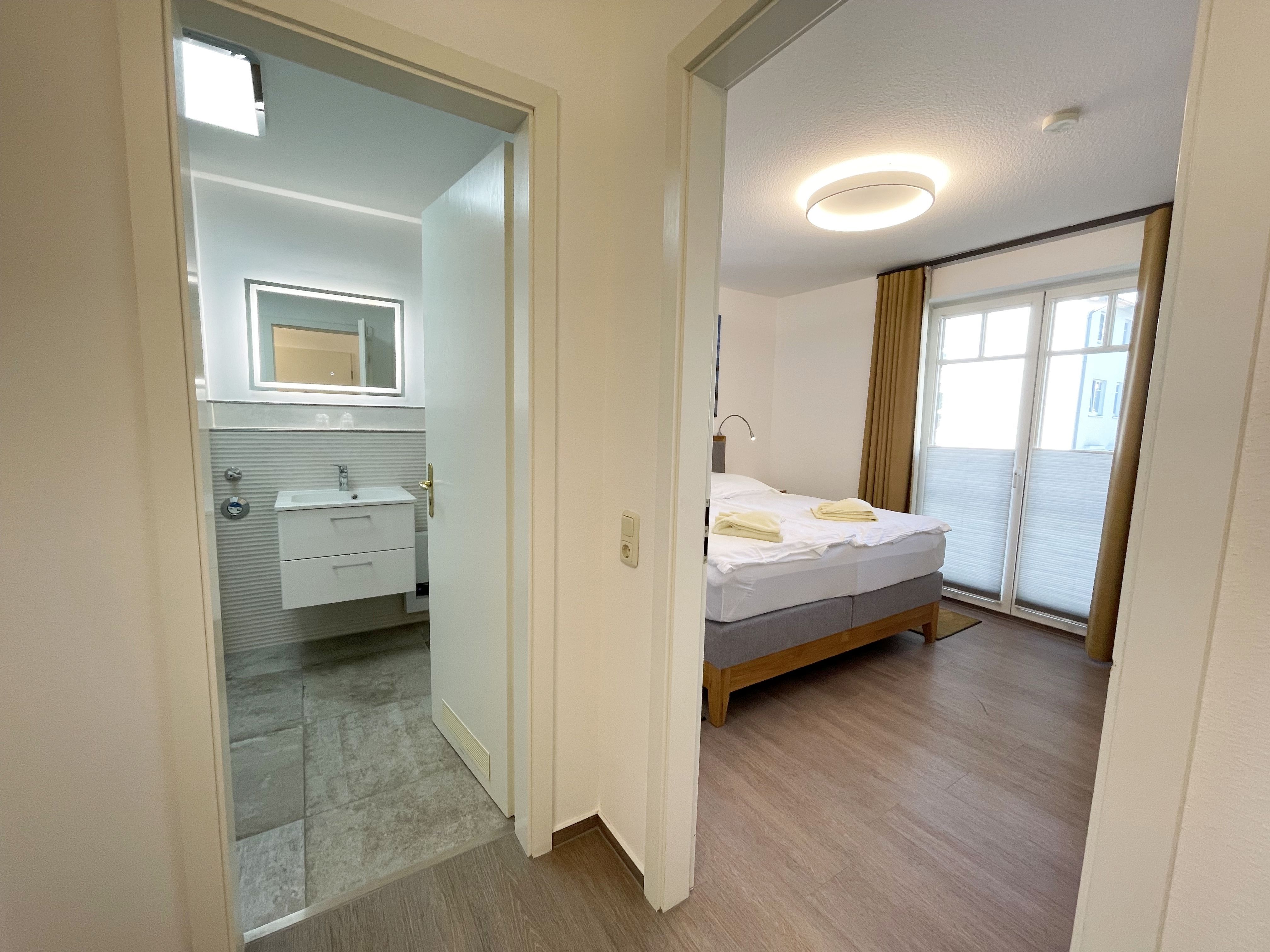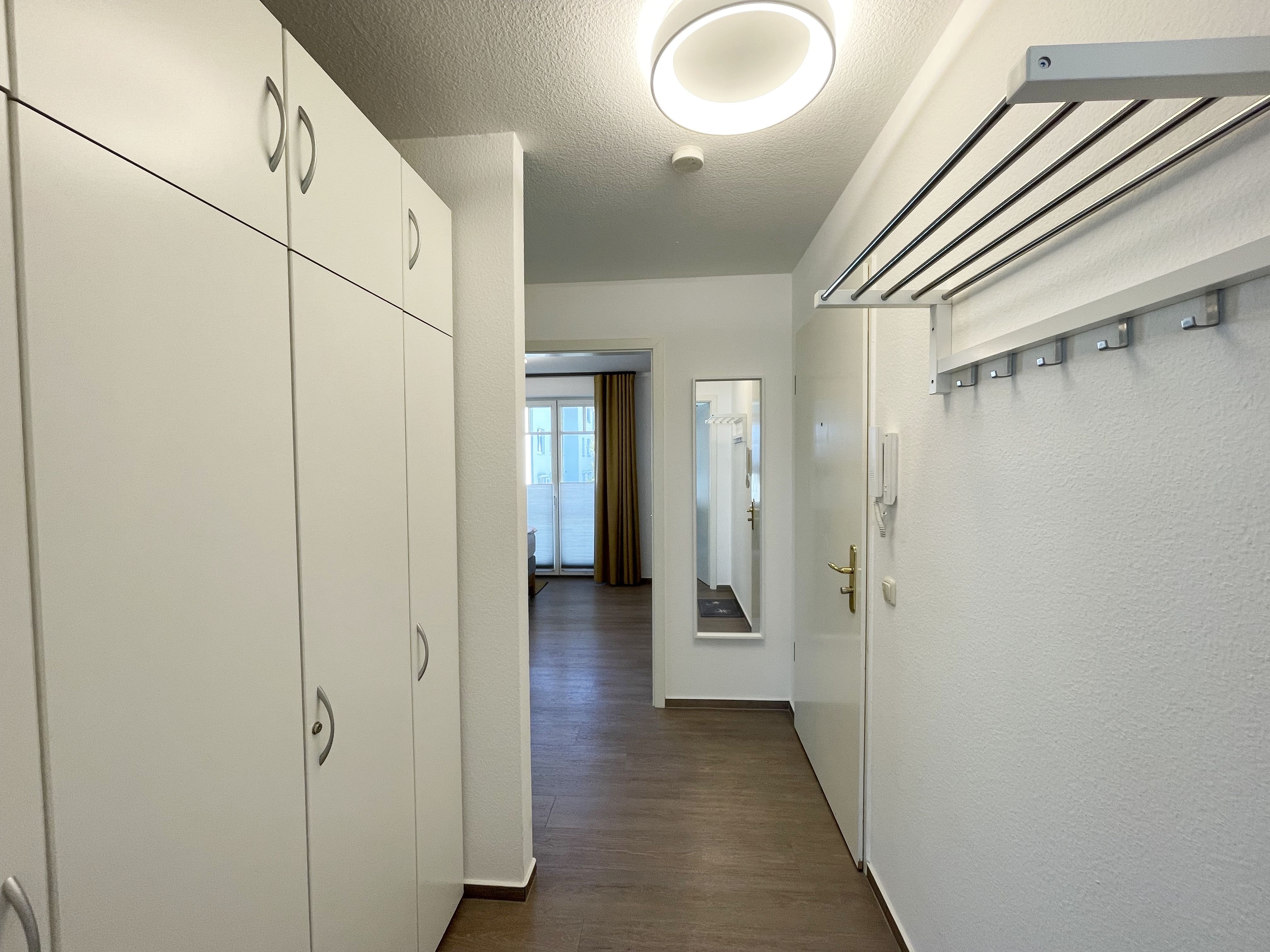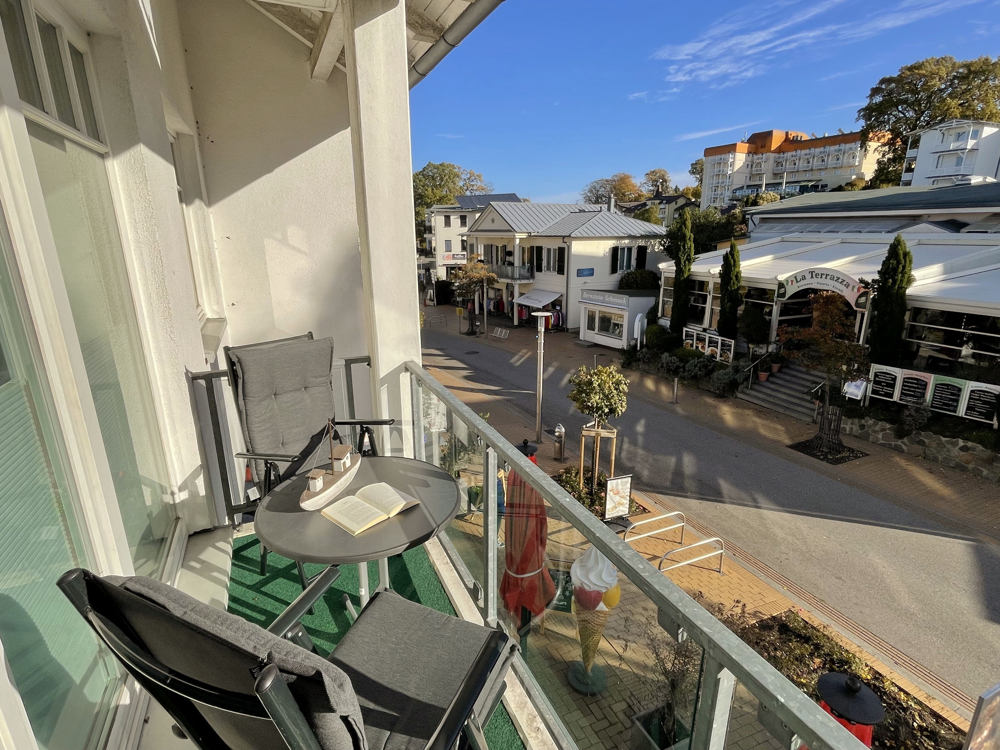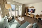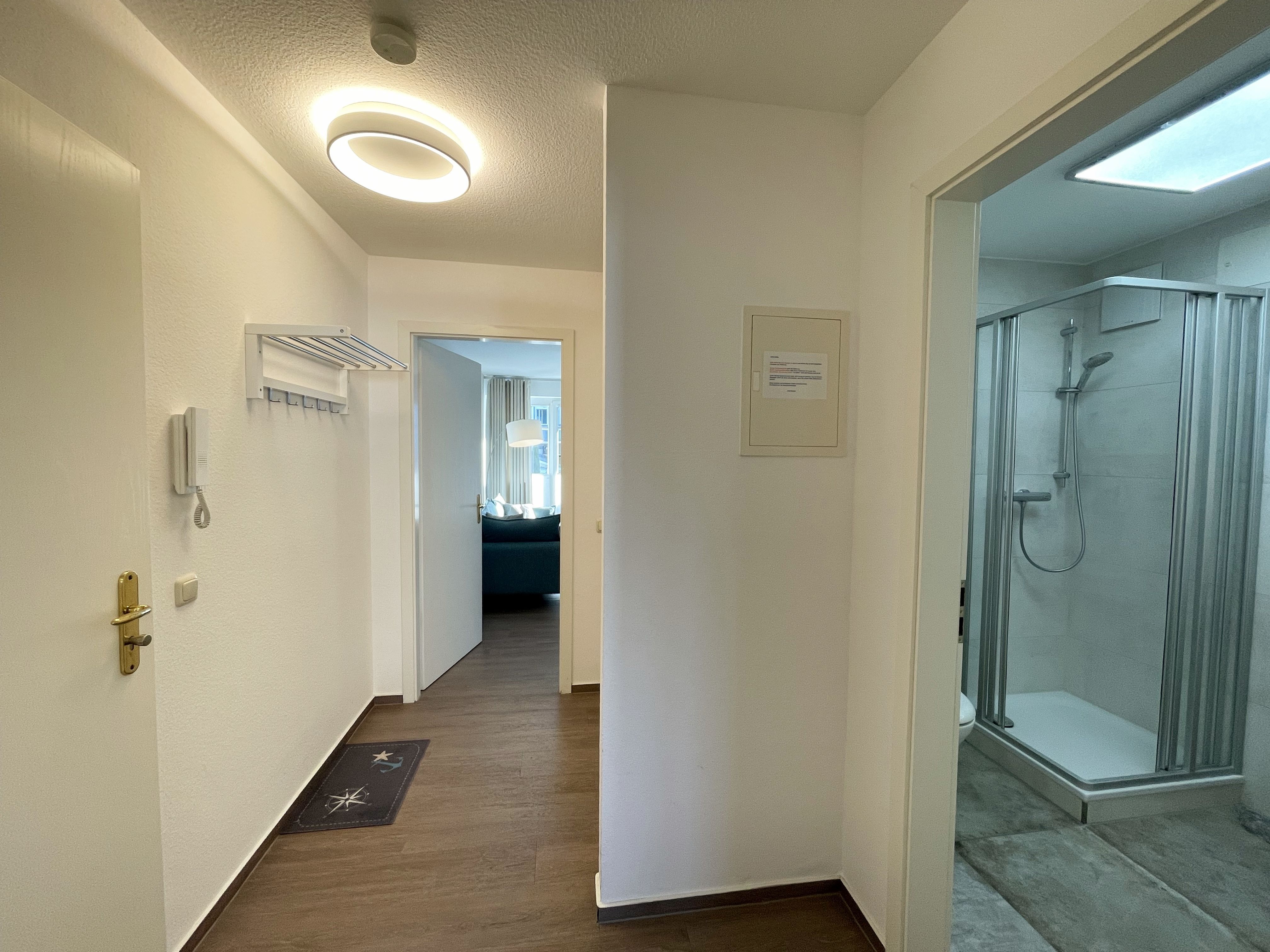 Die komfortabel und modern eingerichtete 2-Zimmer Ferienwohnung besticht mit einer durchdachten Raumaufteilung. Auf ca. 46 Quadratmetern ist diese Nichtraucherwohnung mit viel Liebe zum Detail eingerichtet. Sie bietet Ihnen Platz für max. 2 Erwachsene + 2 Kinder bis 14 Jahre. Die hochwertig eingerichtete Einbauküche ist ausgestattet mit einem Geschirrspüler, einen Kühlschrank mit Eisfach, einen Backofen, ein 4-Zonen-Induktionskochfeld, einer Kaffeemaschine, einen Toaster, einen Wasserkocher und diversen Küchenutensilien. Der helle Wohnbereich wird bestimmt durch seine bodentiefen Fenster (kindersicher abschließbar), die einen weitläufigen Blick auf das Treiben in der Strandstraße zulassen. Hier steht für Sie eine Schlafcouch (Aufbettungsmöglichkeit für 2 Personen, 1,30m x 2,00m), Couchtisch, ein TV-Board, ein Vitrinenschrank und eine Stehlampe bereit. Auf einen Smart-LED-TV im Wohnraum und einen Internetanschluß (WLAN) müssen Sie im Urlaub nicht verzichten. Ein Blu-Ray-Player sowie eine Mini-Stereo-Anlage mit Bluetooth und USB-Anschluss und inkl. Internet-Radio (DAB) runden den Wohnbereich technisch ab. Das Schlafzimmer ist ausgestattet mit einem bequemen Boxspringbett (1,80m x 2,00m), Nachttischablagen, einem geräumigen Kleiderschrank und Verdunkelungsvorhängen. Somit steht einem erholsamen Schlaf hier nichts im Wege! Im innenliegenden Bad sorgen eine ebenerdige Dusche, ein WC, ein Fön sowie ein Waschplatz mit Unterschrank für Ihr Wohlbefinden. Hier finden Sie zusätzlich, wie auch in allen anderen Räumen, eine Fußbodenheizung und hochwertige Bodenbeläge vor. Auf dem kleinen Balkon (Süd/Osten), ausgestattet mit einem Tisch und zwei Stühlen mit Polsterauflagen, können Sie jederzeit die frische Ostseeluft geniessen. Ein Haustier ist gegen eine Gebühr bei uns herzlich willkommen! Im Gemeinschaftskeller des Hauses können Sie gegen einen Aufpreis eine Waschmaschine und einen Trockner nutzen. Hier können Sie auch Ihre mitgebrachten Fahrräder unterstellen. Ihr PKW kann in der angrenzenden Tiefgarage (Nr. 20a / Einfahrtshöhe 2,00m) kostenfrei geparkt werden. Die Erstausstattung eines Wäschepaketes (komplette Bettwäsche, 1 Duschhandtuch, 2 kleine Handtücher, 2 Geschirrhandtücher) können Sie bis 14 Tage vor Anreise gegen einen Aufpreis dazu buchen oder durch eigene ergänzen.