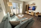 Die komfortabel und modern eingerichtete 2-Zimmer Ferienwohnung besticht mit einer durchdachten Raumaufteilung. Auf ca. 46 Quadratmetern ist diese Nichtraucherwohnung mit viel Liebe zum Detail eingerichtet. Sie bietet Ihnen Platz für max. 2 Erwachsene + 2 Kinder bis 14 Jahre. Die hochwertig eingerichtete Einbauküche ist ausgestattet mit einem Geschirrspüler, einen Kühlschrank mit Eisfach, einen Backofen, ein 4-Zonen-Induktionskochfeld, einer Kaffeemaschine, einen Toaster, einen Wasserkocher und diversen Küchenutensilien. Der helle Wohnbereich wird bestimmt durch seine bodentiefen Fenster (kindersicher abschließbar), die einen weitläufigen Blick auf das Treiben in der Strandstraße zulassen. Hier steht für Sie eine Schlafcouch (Aufbettungsmöglichkeit für 2 Personen, 1,30m x 2,00m), Couchtisch, ein TV-Board, ein Vitrinenschrank und eine Stehlampe bereit. Auf einen Smart-LED-TV im Wohnraum und einen Internetanschluß (WLAN) müssen Sie im Urlaub nicht verzichten. Ein Blu-Ray-Player sowie eine Mini-Stereo-Anlage mit Bluetooth und USB-Anschluss und inkl. Internet-Radio (DAB) runden den Wohnbereich technisch ab. Das Schlafzimmer ist ausgestattet mit einem bequemen Boxspringbett (1,80m x 2,00m), Nachttischablagen, einem geräumigen Kleiderschrank und Verdunkelungsvorhängen. Somit steht einem erholsamen Schlaf hier nichts im Wege! Im innenliegenden Bad sorgen eine ebenerdige Dusche, ein WC, ein Fön sowie ein Waschplatz mit Unterschrank für Ihr Wohlbefinden. Hier finden Sie zusätzlich, wie auch in allen anderen Räumen, eine Fußbodenheizung und hochwertige Bodenbeläge vor. Auf dem kleinen Balkon (Süd/Osten), ausgestattet mit einem Tisch und zwei Stühlen mit Polsterauflagen, können Sie jederzeit die frische Ostseeluft geniessen. Ein Haustier ist gegen eine Gebühr bei uns herzlich willkommen! Im Gemeinschaftskeller des Hauses können Sie gegen einen Aufpreis eine Waschmaschine und einen Trockner nutzen. Hier können Sie auch Ihre mitgebrachten Fahrräder unterstellen. Ihr PKW kann in der angrenzenden Tiefgarage (Nr. 20a / Einfahrtshöhe 2,00m) kostenfrei geparkt werden. Die Erstausstattung eines Wäschepaketes (komplette Bettwäsche, 1 Duschhandtuch, 2 kleine Handtücher, 2 Geschirrhandtücher) können Sie bis 14 Tage vor Anreise gegen einen Aufpreis dazu buchen oder durch eigene ergänzen.