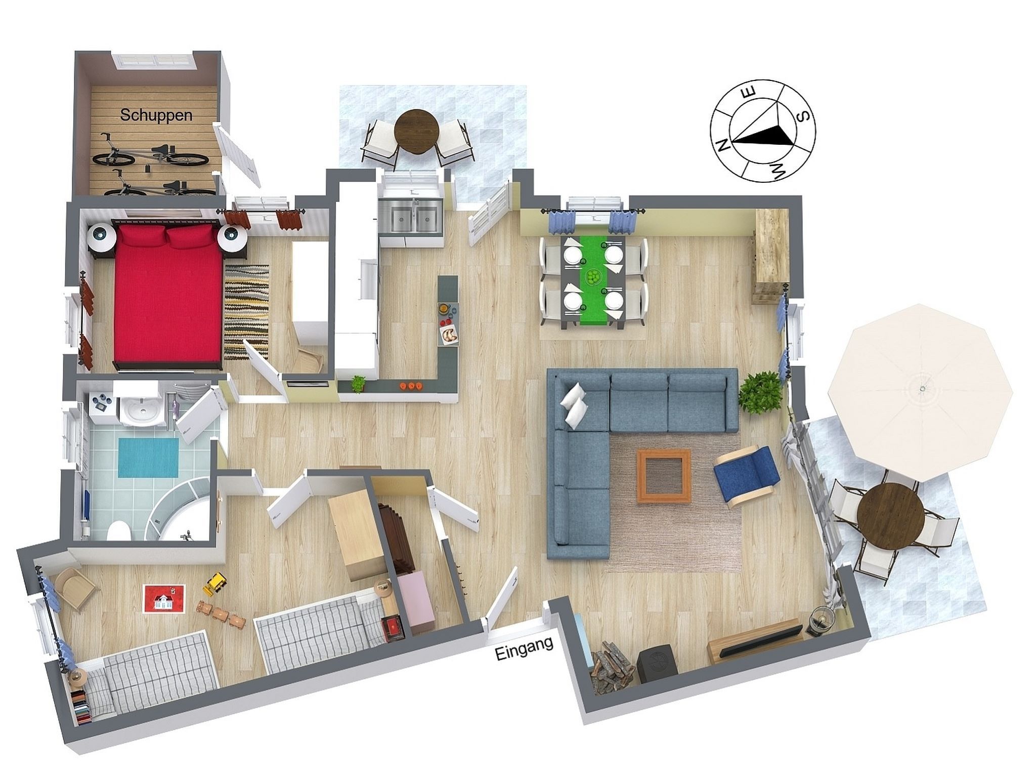 Genießen Sie die Sonne auf zwei Terrassen, eine nach Osten und eine nach Südwesten ausgerichtet, Tisch und Stühle sind vorhanden. Ein Parkplatz vor dem Haus sowie ein abschließbarer Schuppen für Fahrräder und Strandsachen stehen Ihnen zur Verfügung.