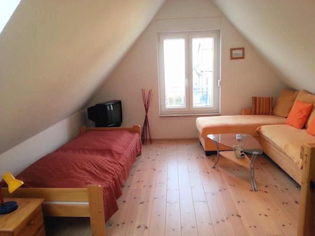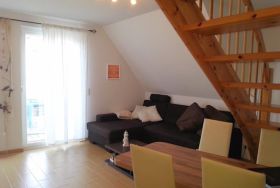 Die 3-Raum-Maisonetten-Wohnung verfügt über einen gemütlichen Wohnbereich, welchem sich die offene, vollausgestatte Küche mit Essplatz anschließt. Vom Wohnzimmer aus gelangt man auf den Balkon mit Blick auf die Ostsee.