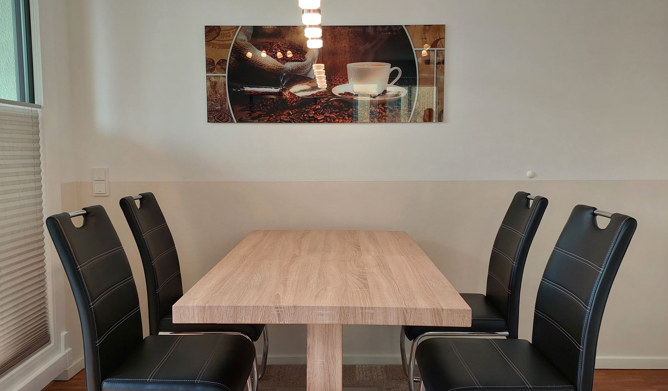 Zudem gibt einen Essbereich und Zugang zum möblierten Südbalkon, mit jeweils 4 Sitzgelegenheiten.