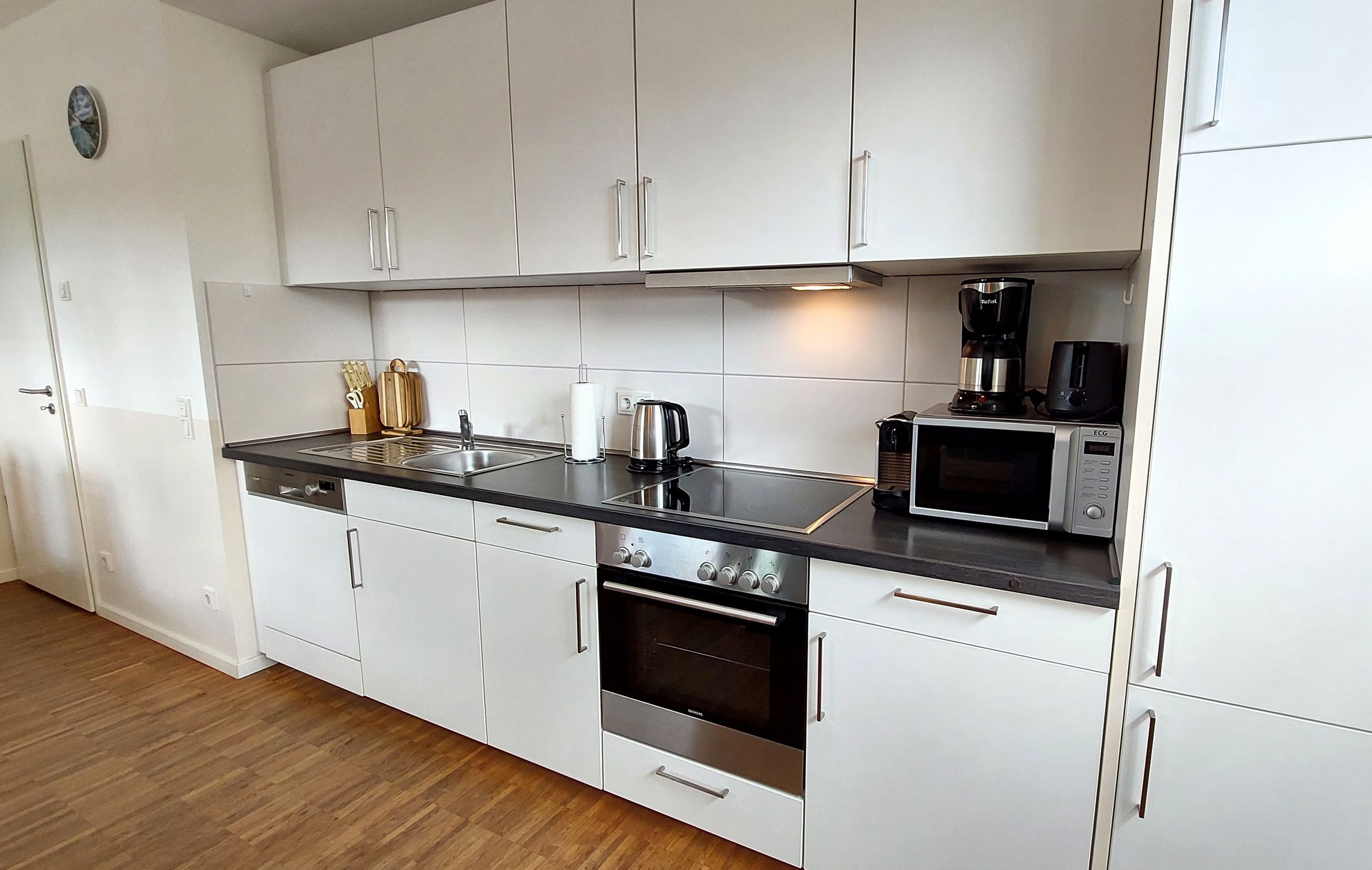 Im geräumigen und hellen Wohn- und Essbereich befindet sich ein moderne Kochzeile mit Ceranfeld, Backofen, Geschirrspüler, Mikrowelle und vielen nützlichen Küchenhelfern. Neben einer normalen Filterkaffeemaschine gibt es sogar einen Kaffeevollautomat.