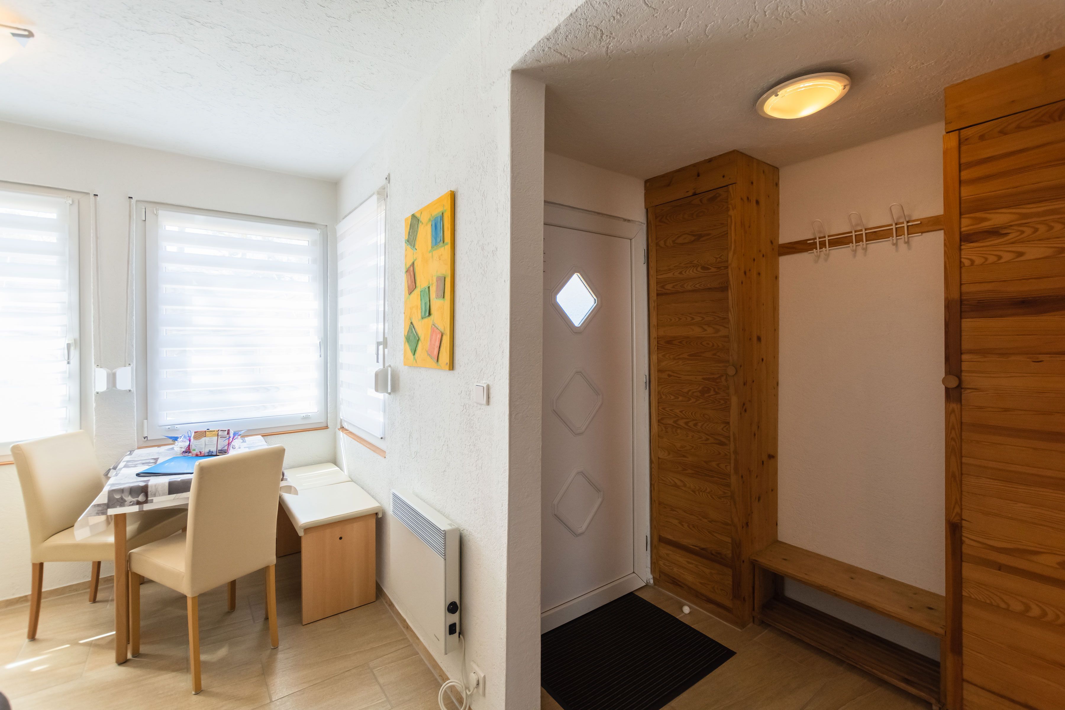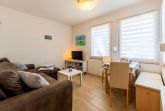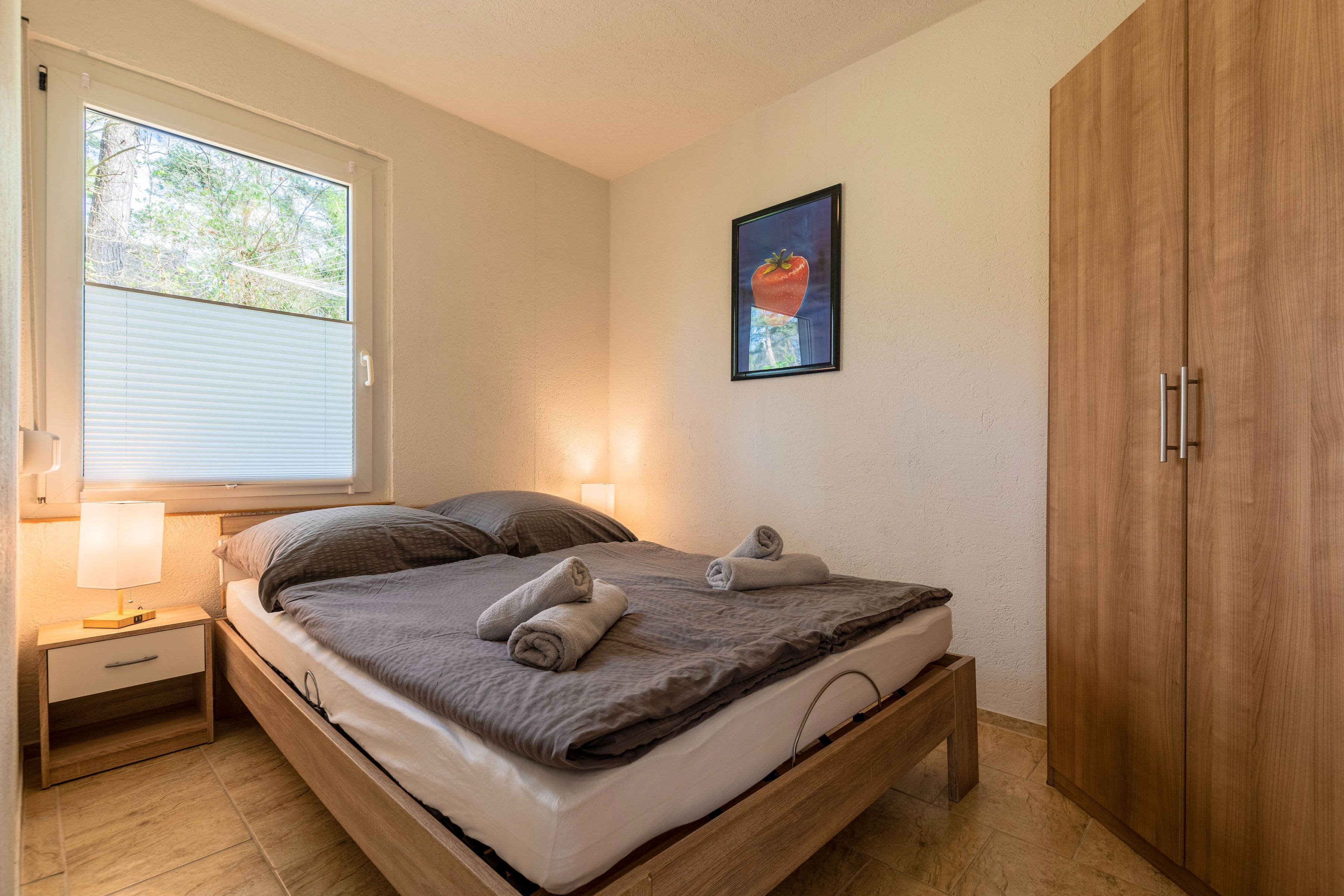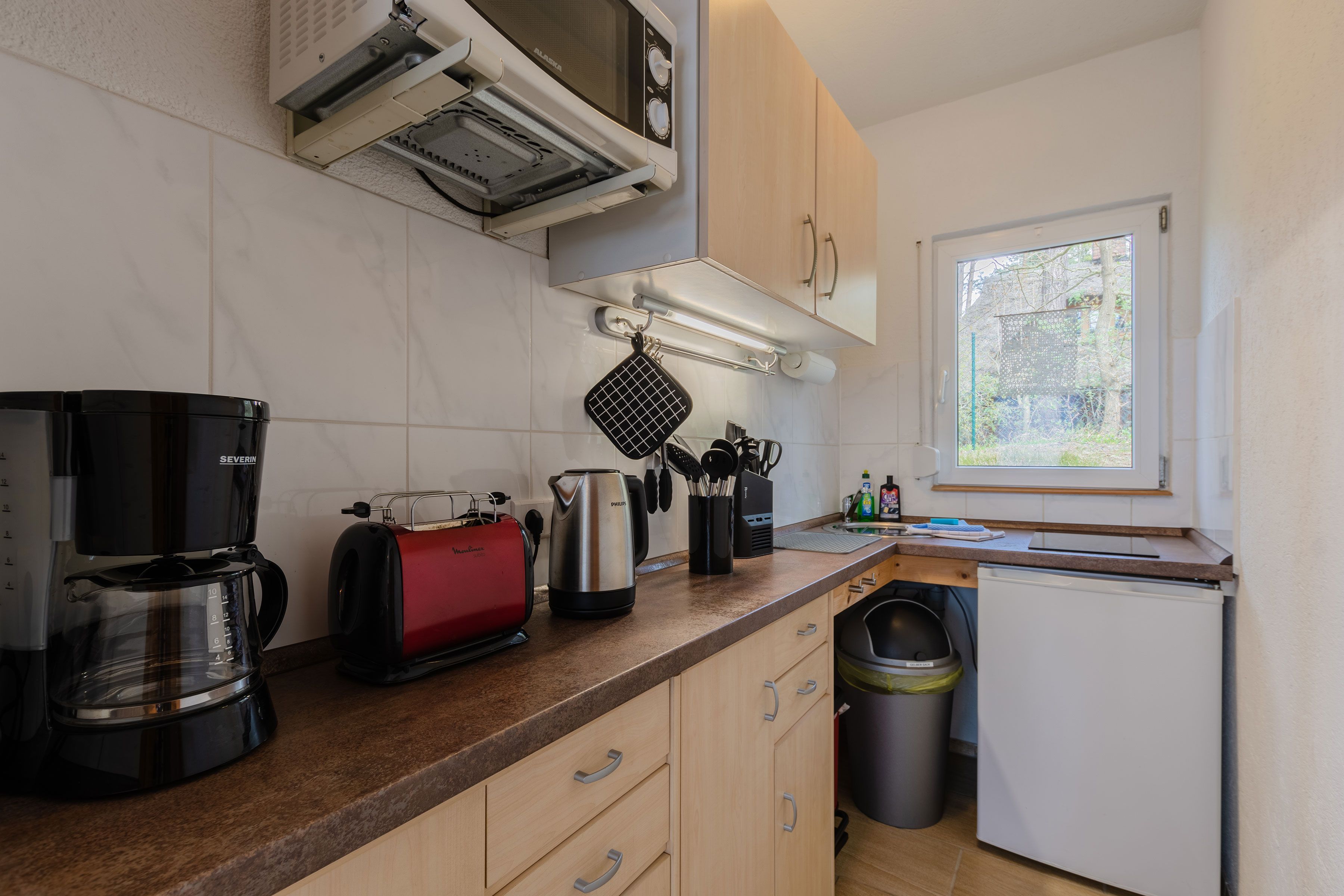 Die offene Küche ist mit einem kleinen Kochfeld, einem Kühlschrank, Kaffeefiltermaschine, Wasserkocher, Toaster sowie einer Mikrowelle ausgestattet. Ein kleiner Essbereich rundet das Gesamtangebot ab. Im Schlafbereich befindet sich ein Doppelbett (140x200) und ein Kleiderschrank.
