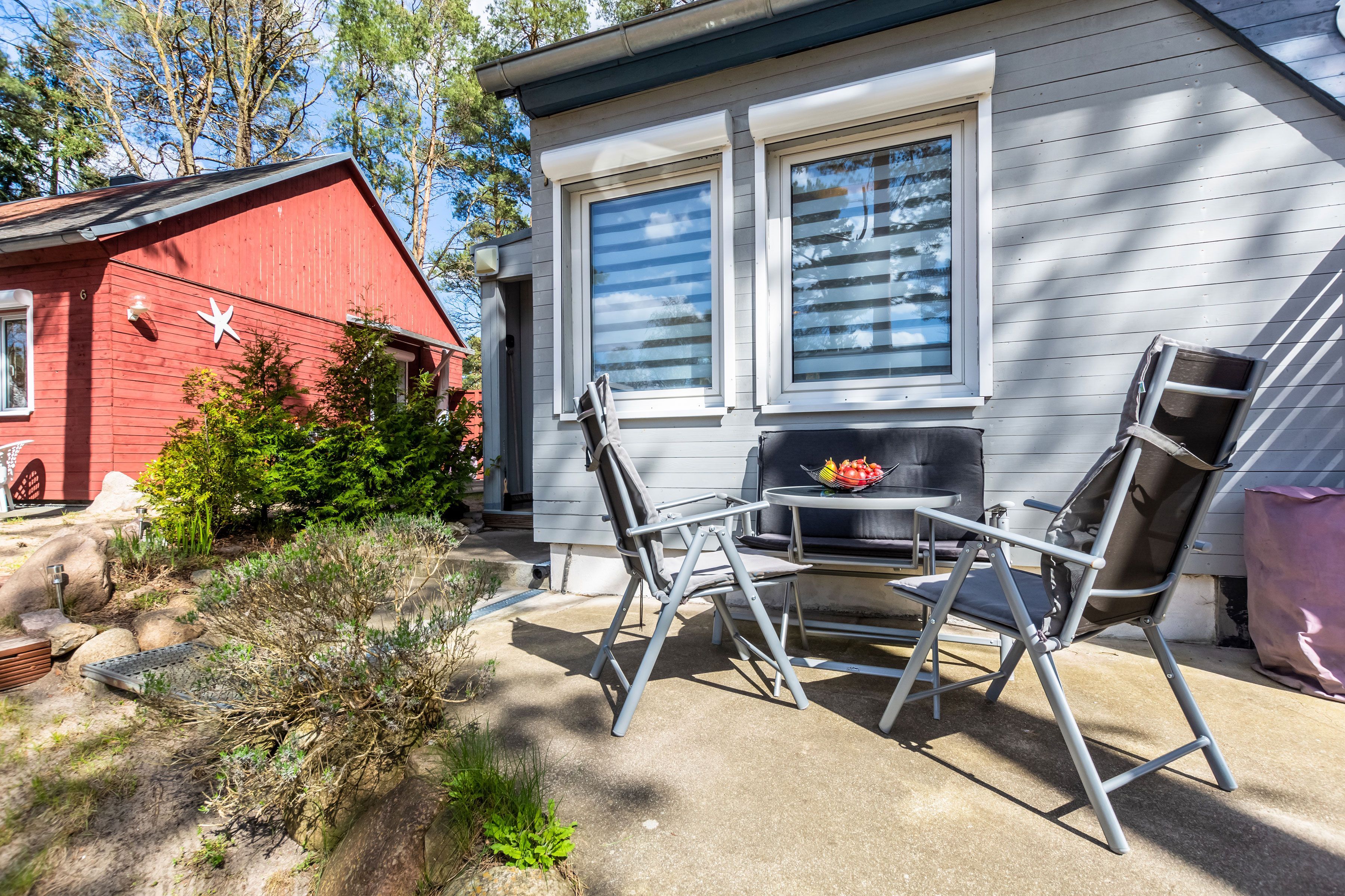 Alle Räume verfügen über Außenjalousien, die zusätzlich die Privatsphäre unterstützen. Auf der sonnigen Terrasse, die man über den Wohnbereich erreicht, stehen Gartenmöbel und ein Holzkohlegrill bereit.