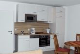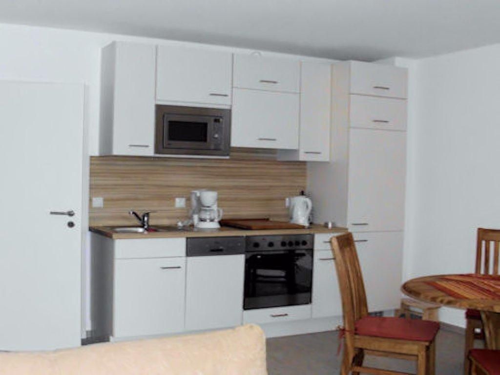 Die Ferienwohnung verfügt über einen gemütlichen Wohnraum mit TV und Balkonzugang, zwei Schlafzimmer und ein Duschbad. Die offene Küche schließt sich über den Essplatz direkt an den Wohnbereich an.