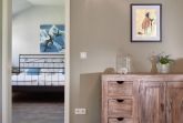 Der Zugang zur oberen Wohnung führt über eine breite, aussenliegende Treppe. Sie besteht aus einem Eingangsbereich mit integrierter Küche, einem großen Wohnzimmer, zwei Schlafzimmern mit Doppelbetten.